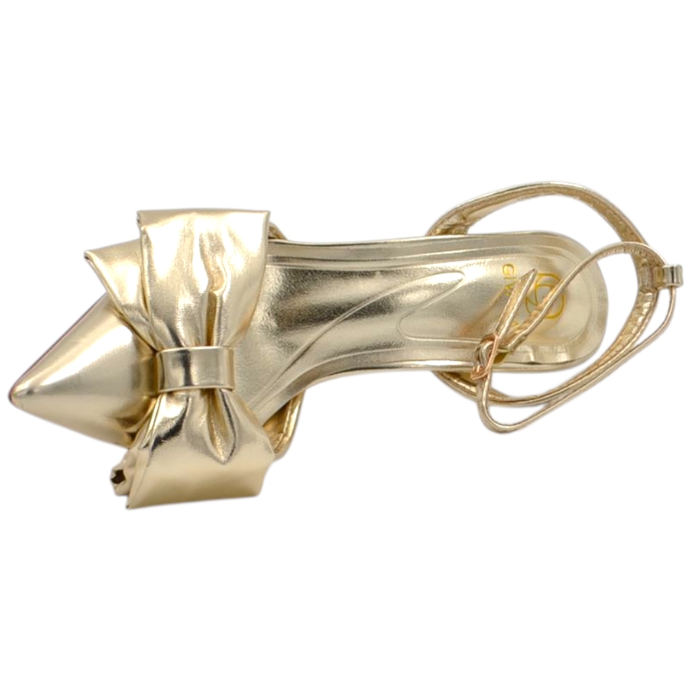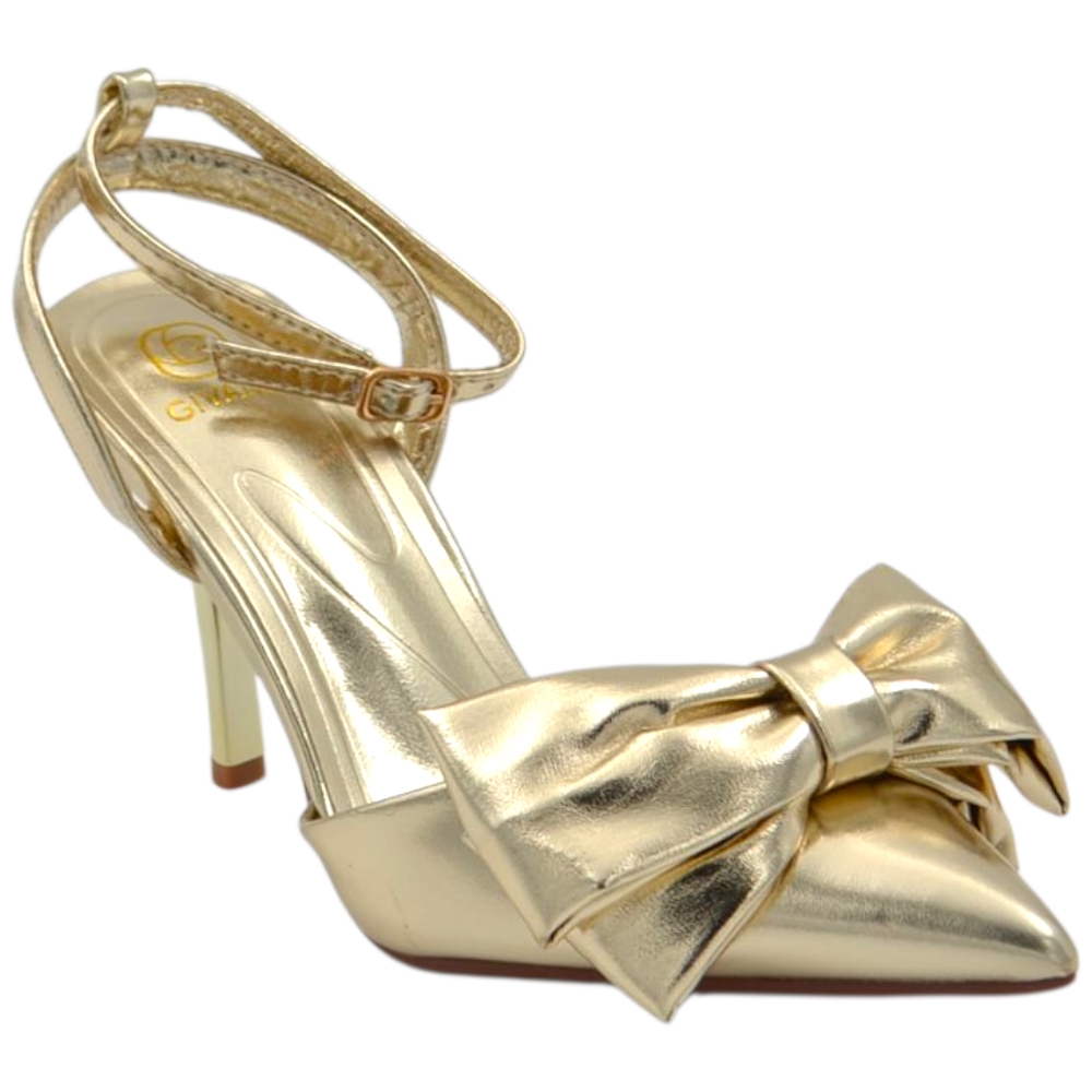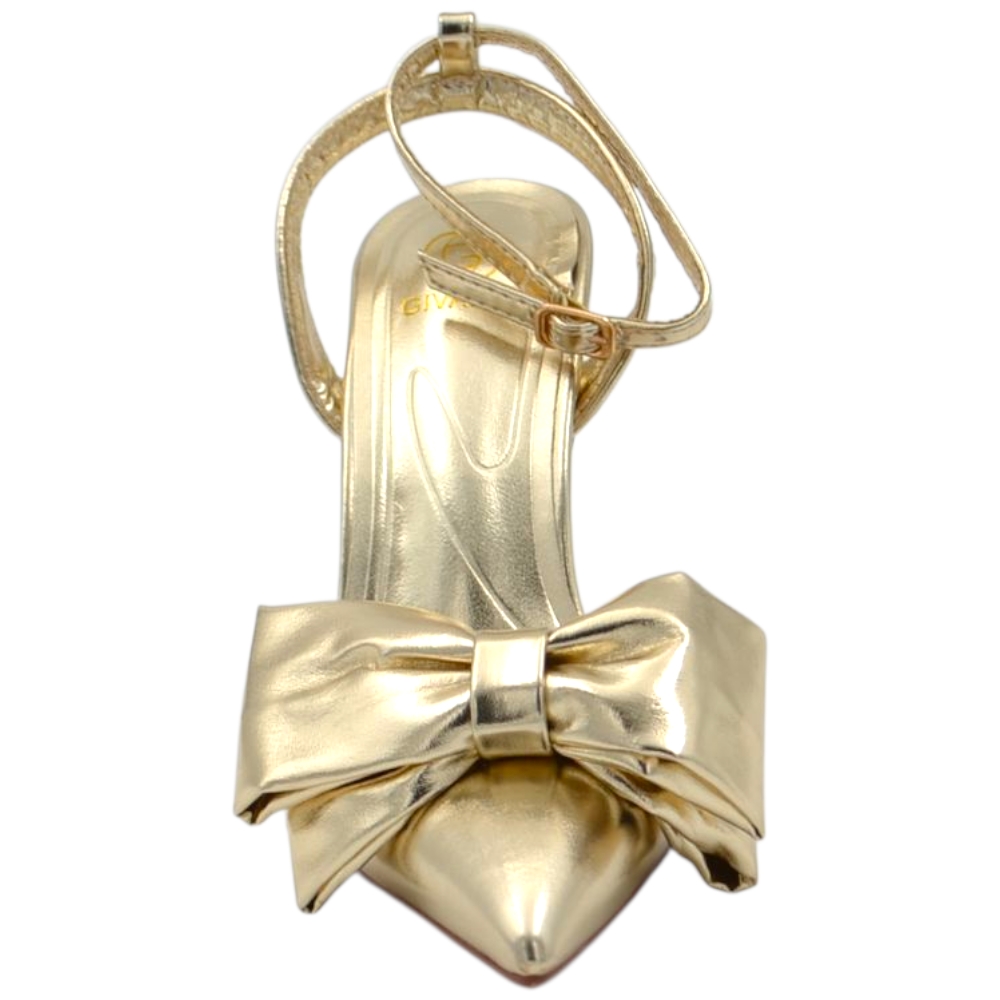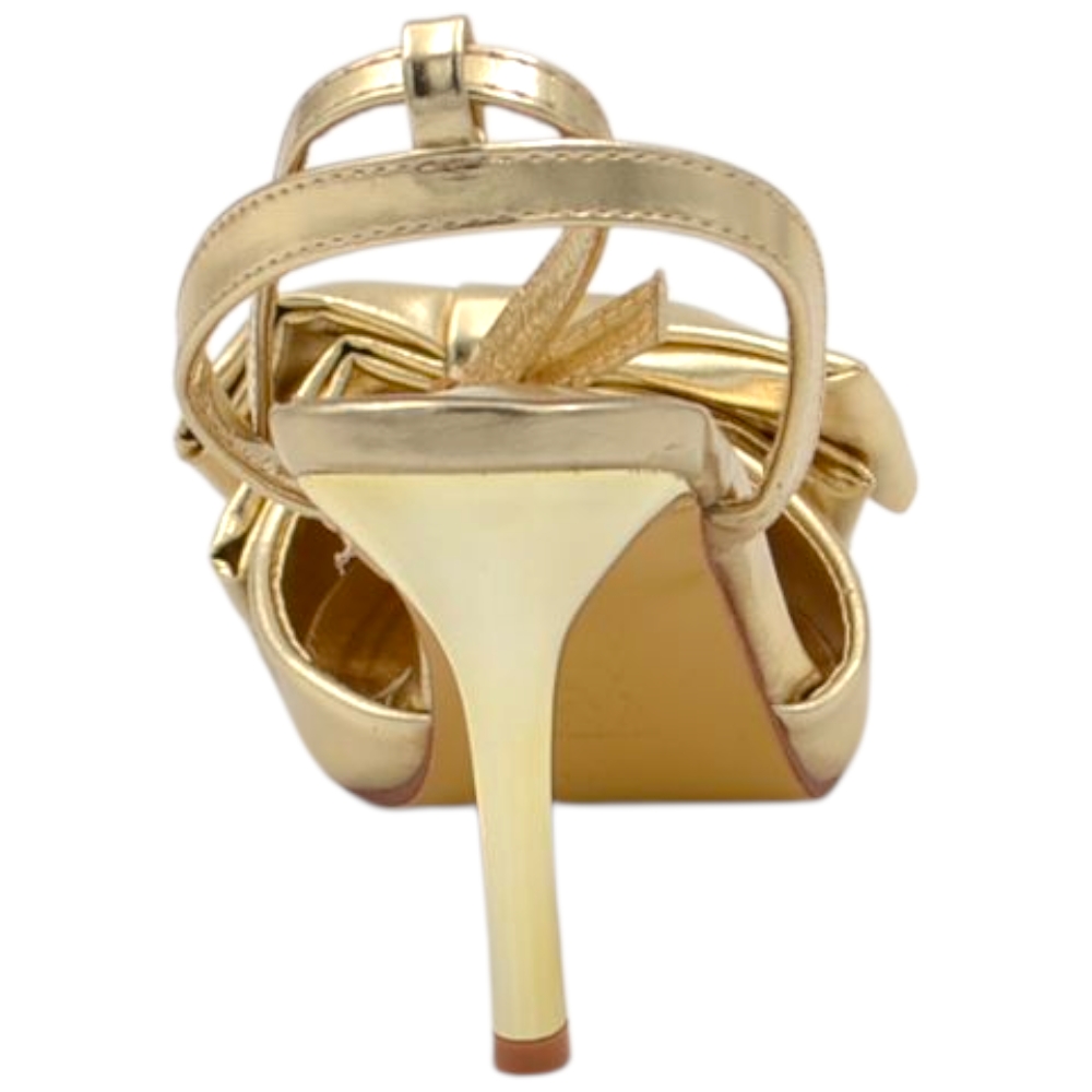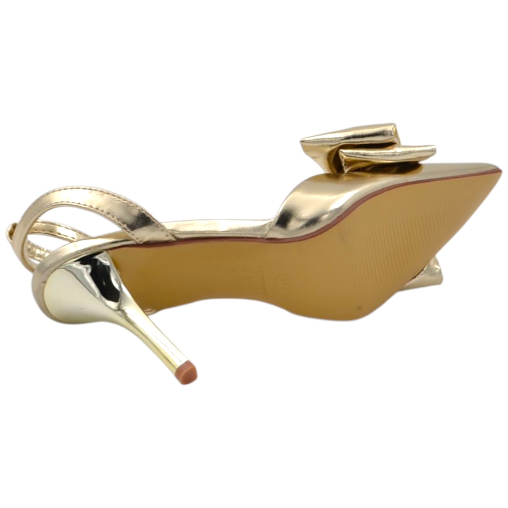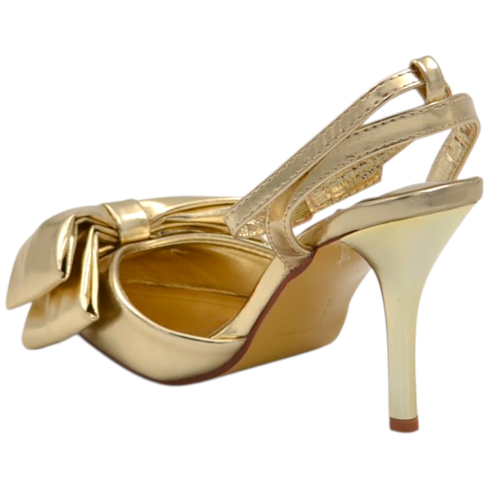 Decollete donna slingback in pelle oro a punta con fiocco tessuto davanti tacco sottile 10 cm