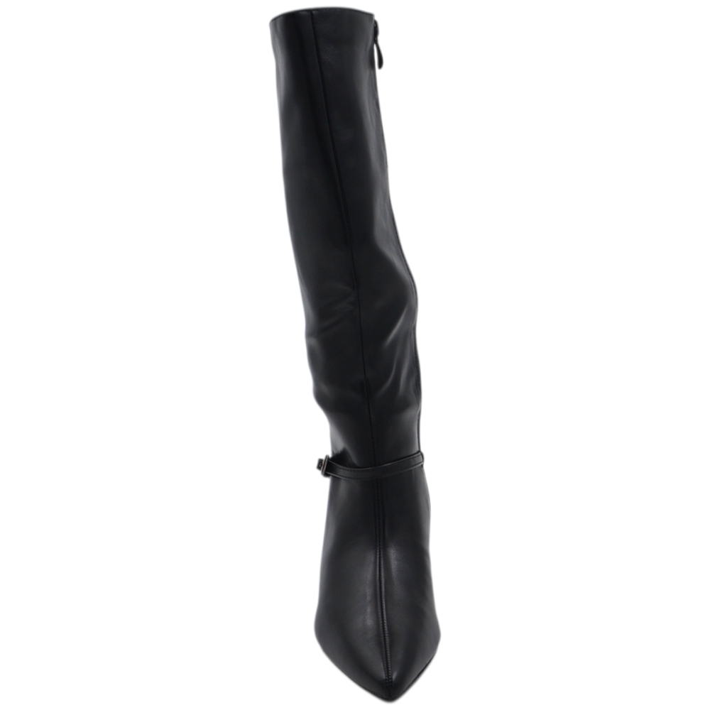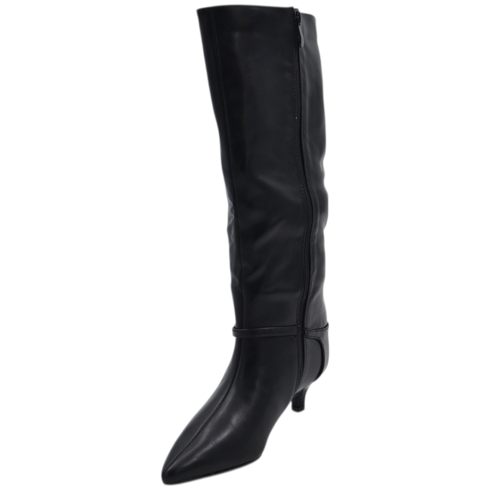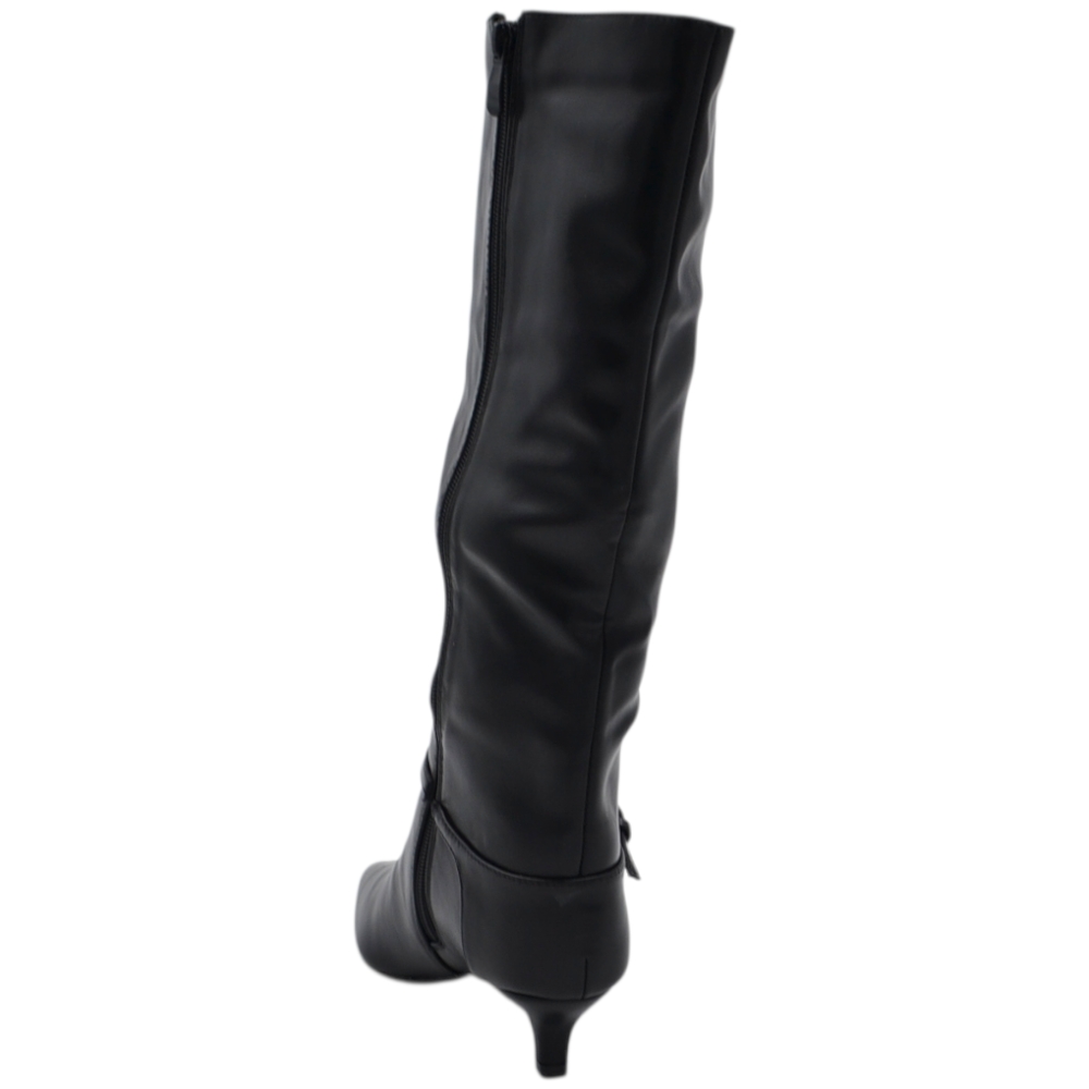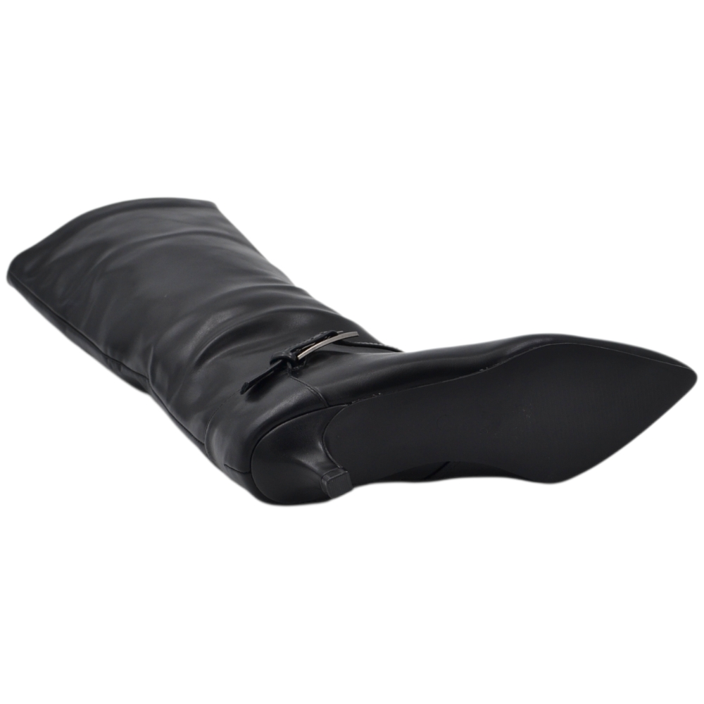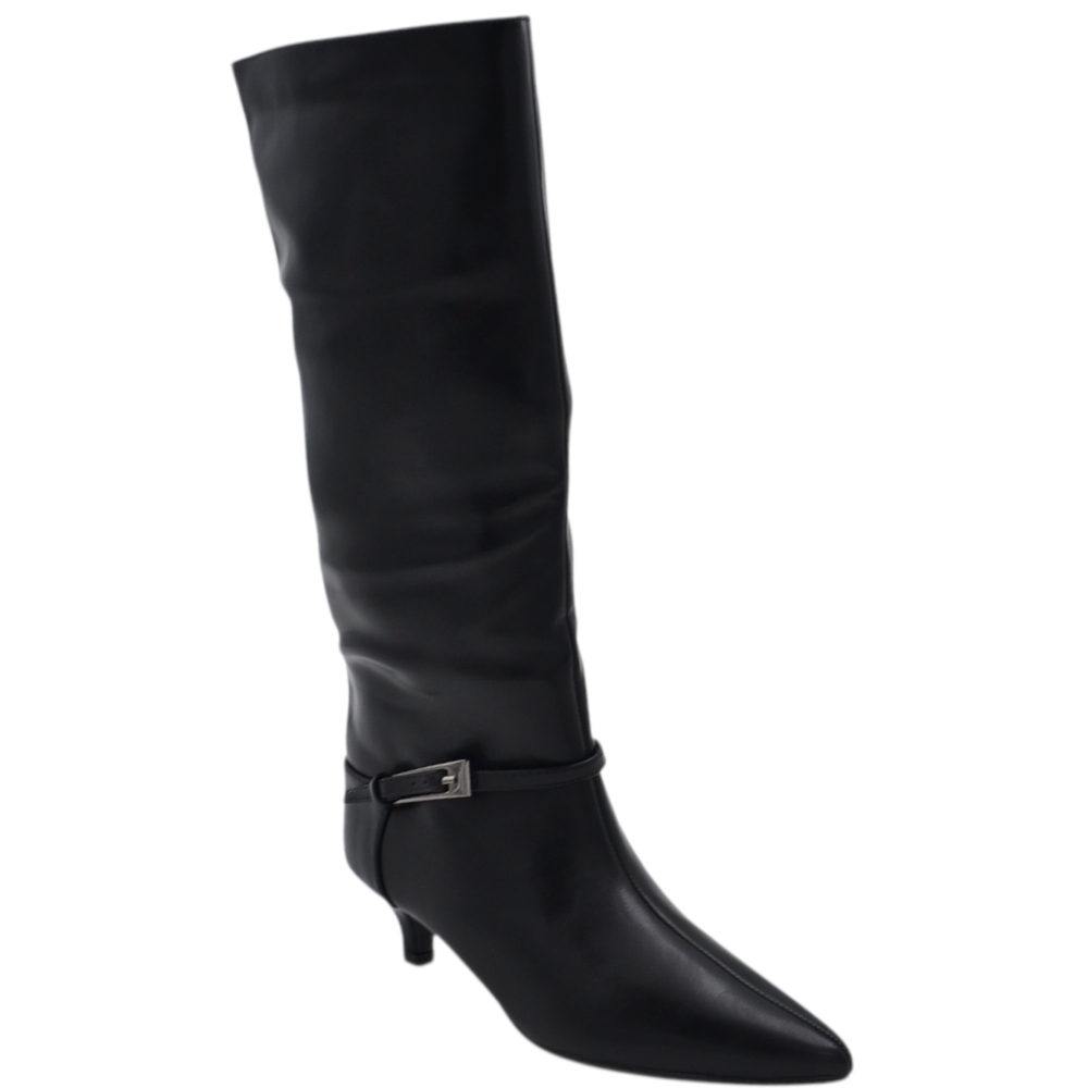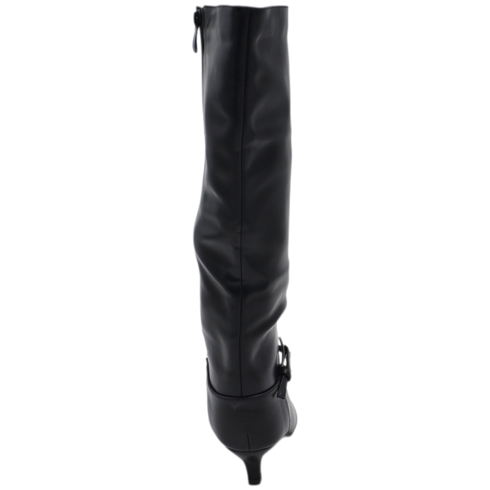 Stivali slouchy in pelle nero a punta con Tacco kitten 3 cm stiletto gambale medio con fibbia argento zip