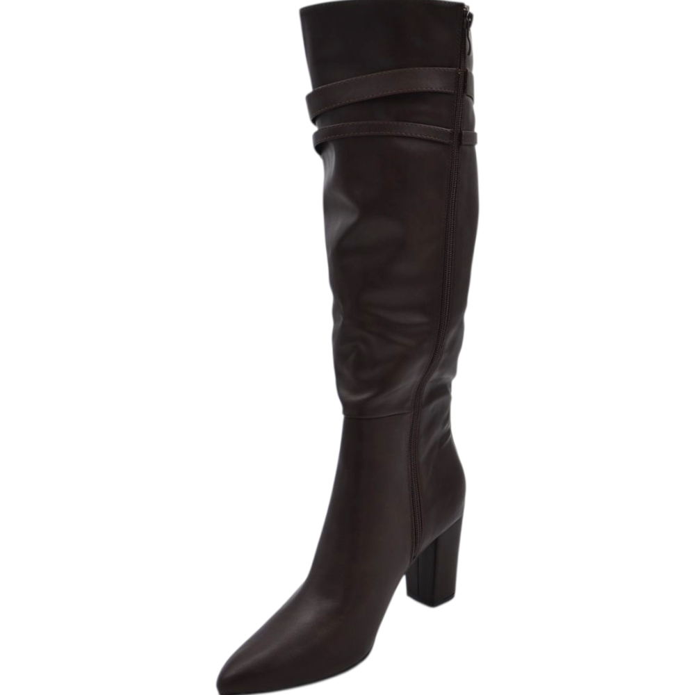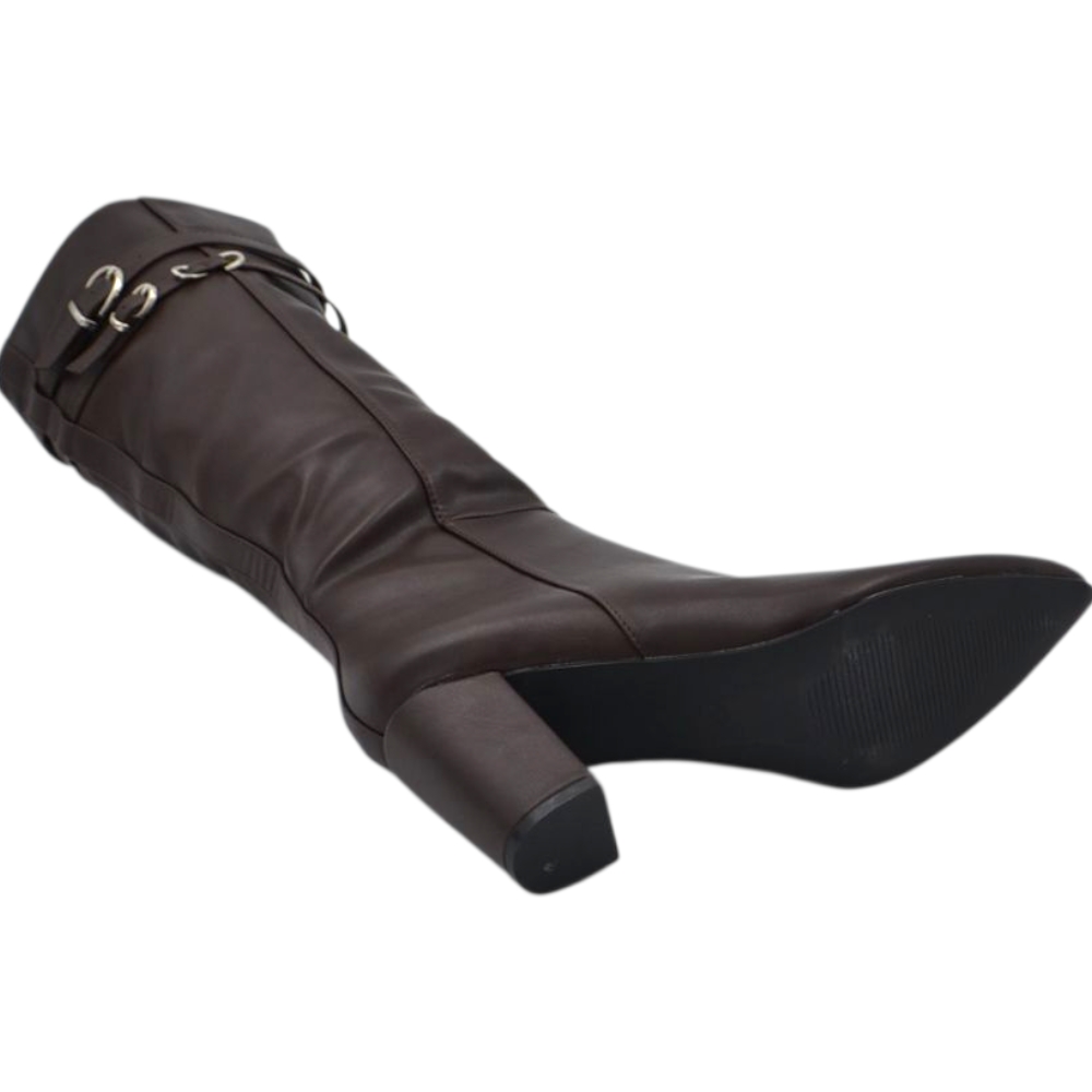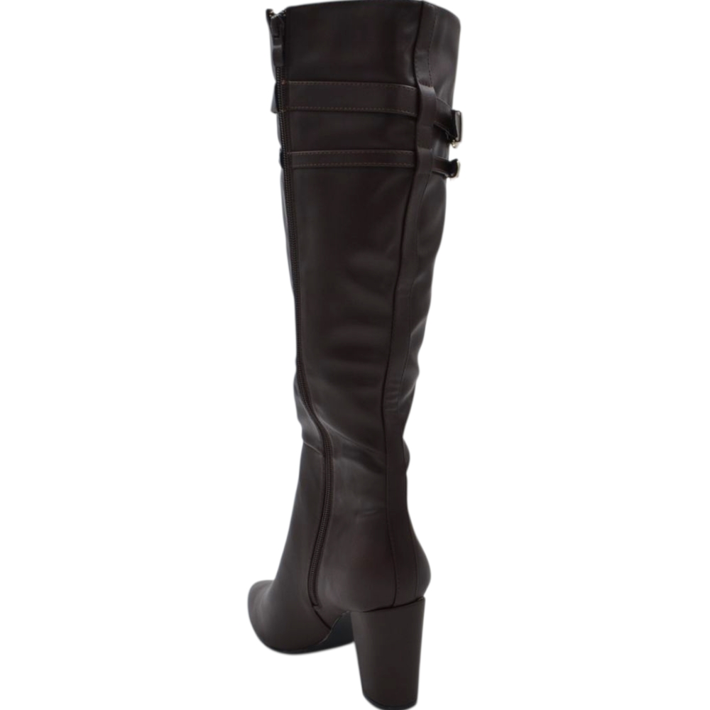 Stivale donna alto rigido in pelle marrone con tacco largo liscio linea basic a punta altezza ginocchio con fibbia