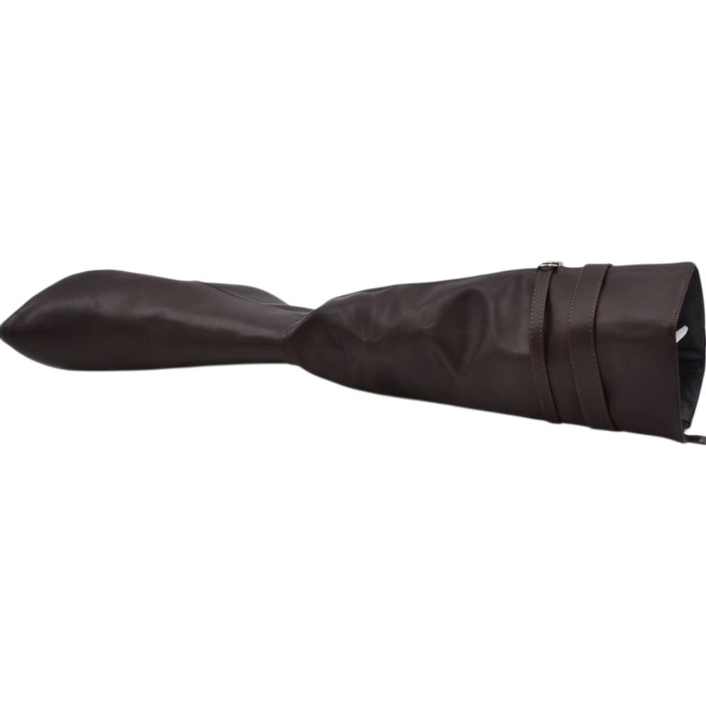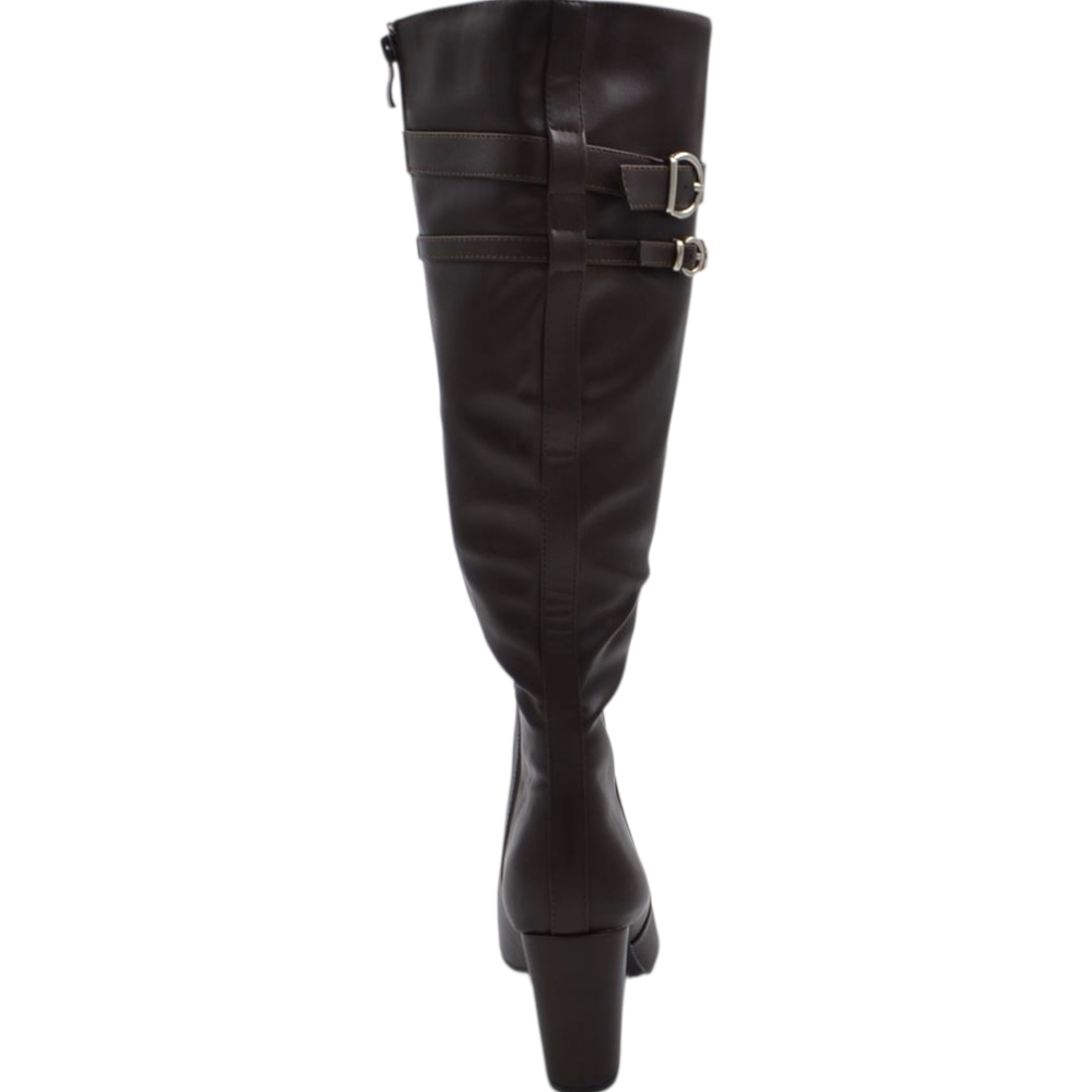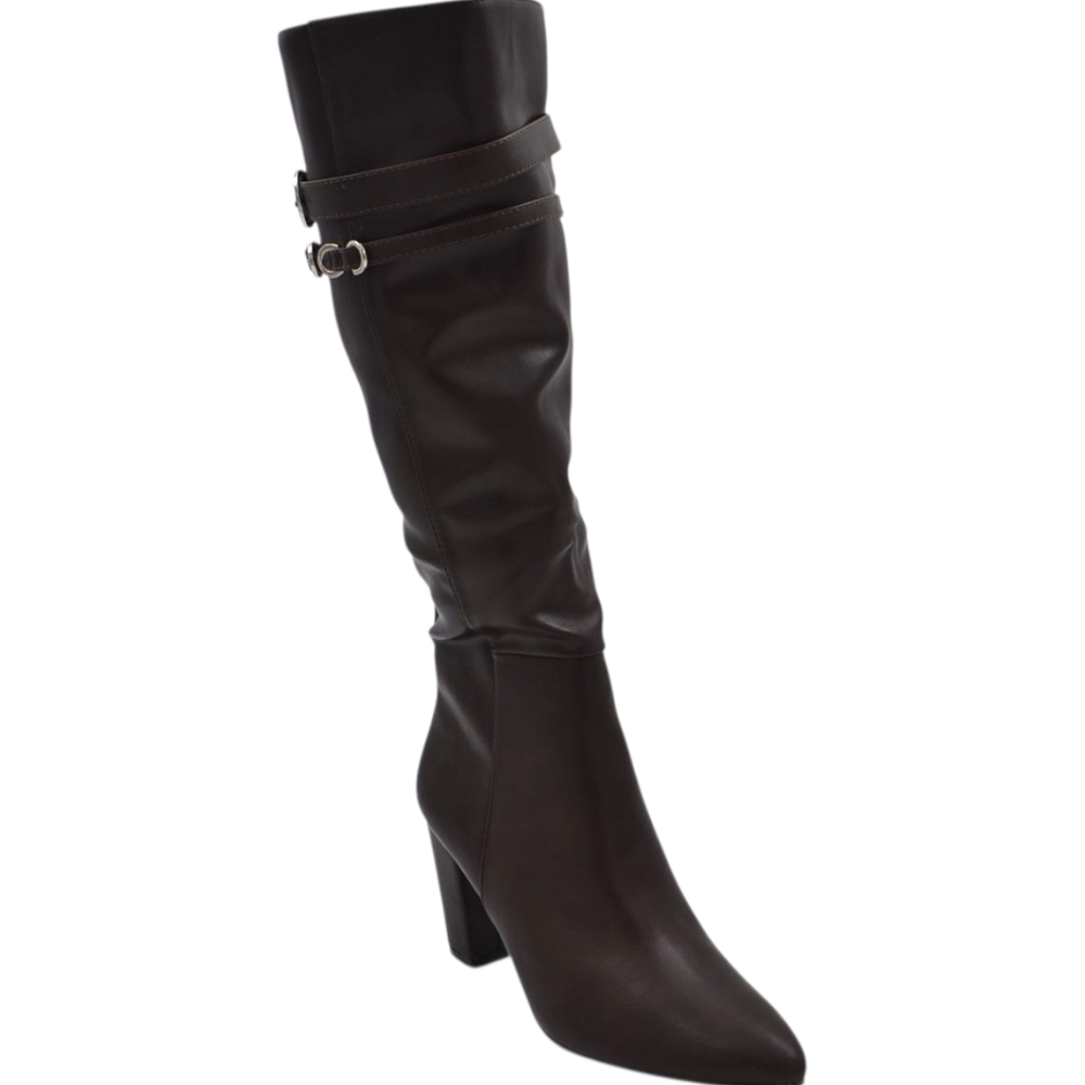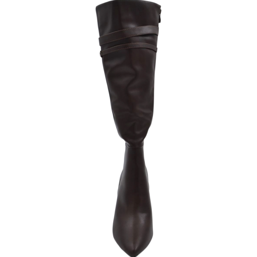 Stivale donna alto rigido in pelle marrone con tacco largo liscio linea basic a punta altezza ginocchio con fibbia