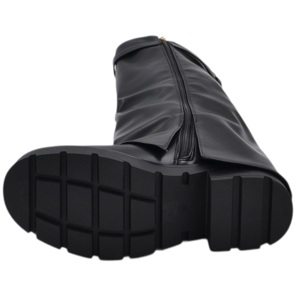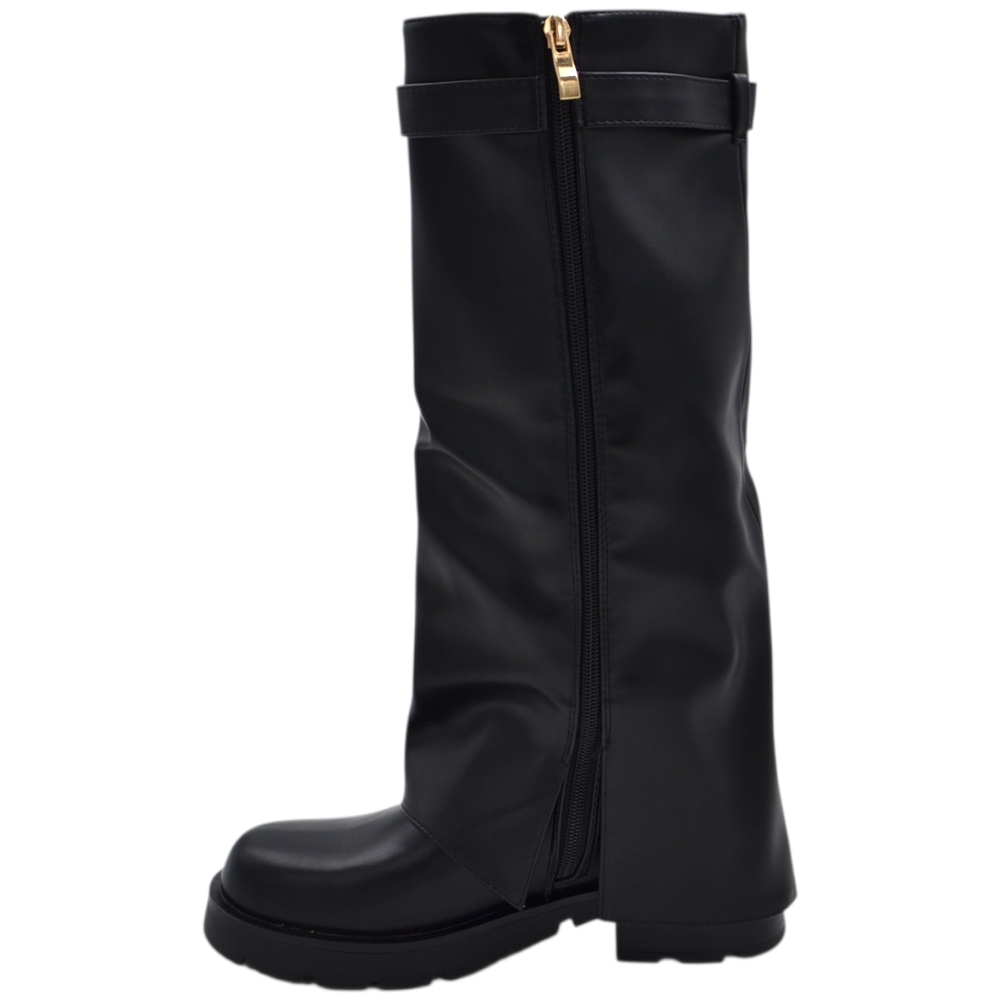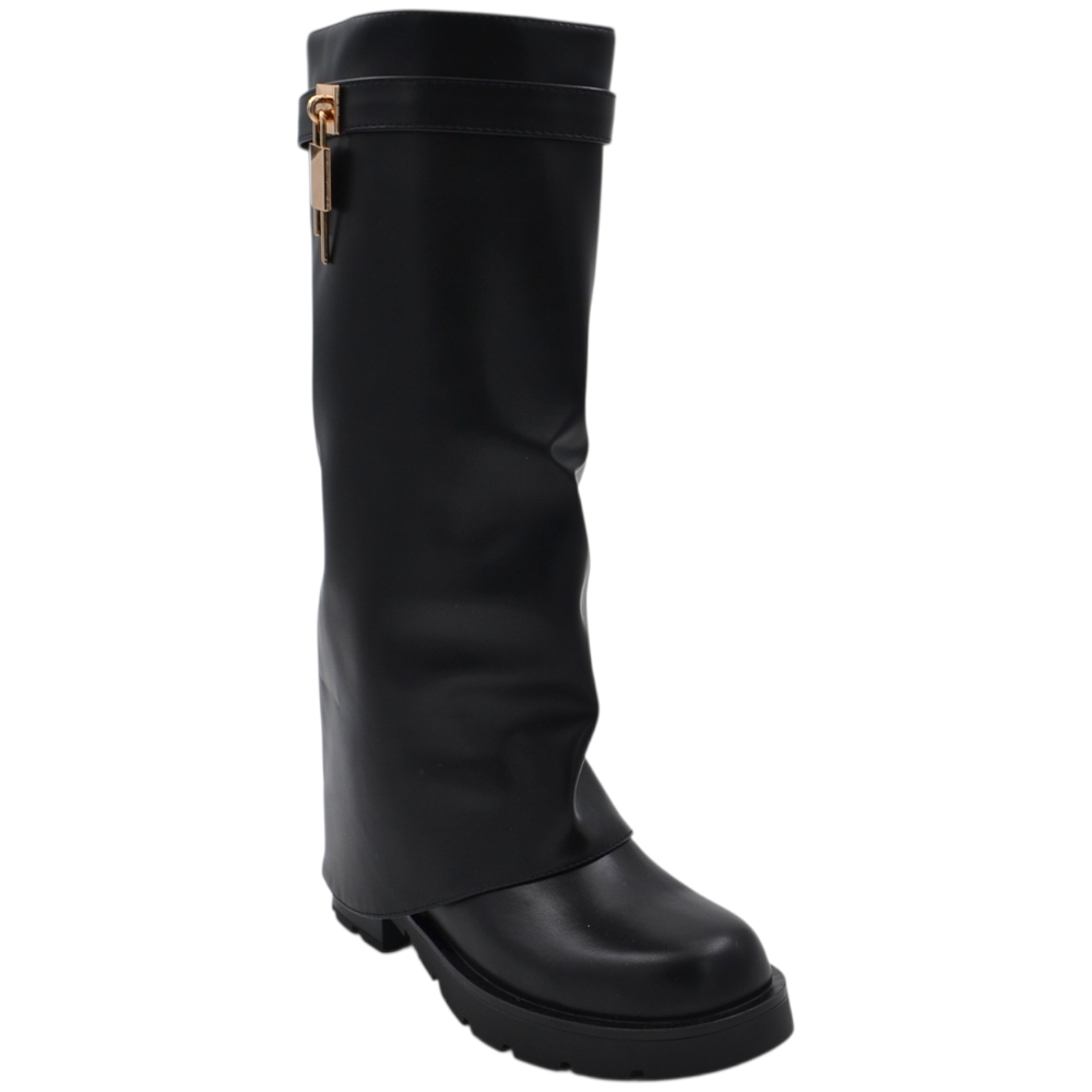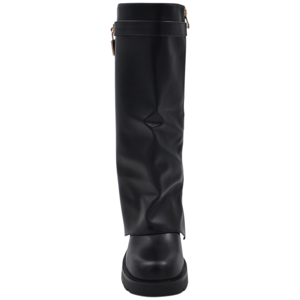 Stivali donna al ginocchio shark in pelle nera con risvolto gancio oro suola platform 3 cm zip interna nascosta