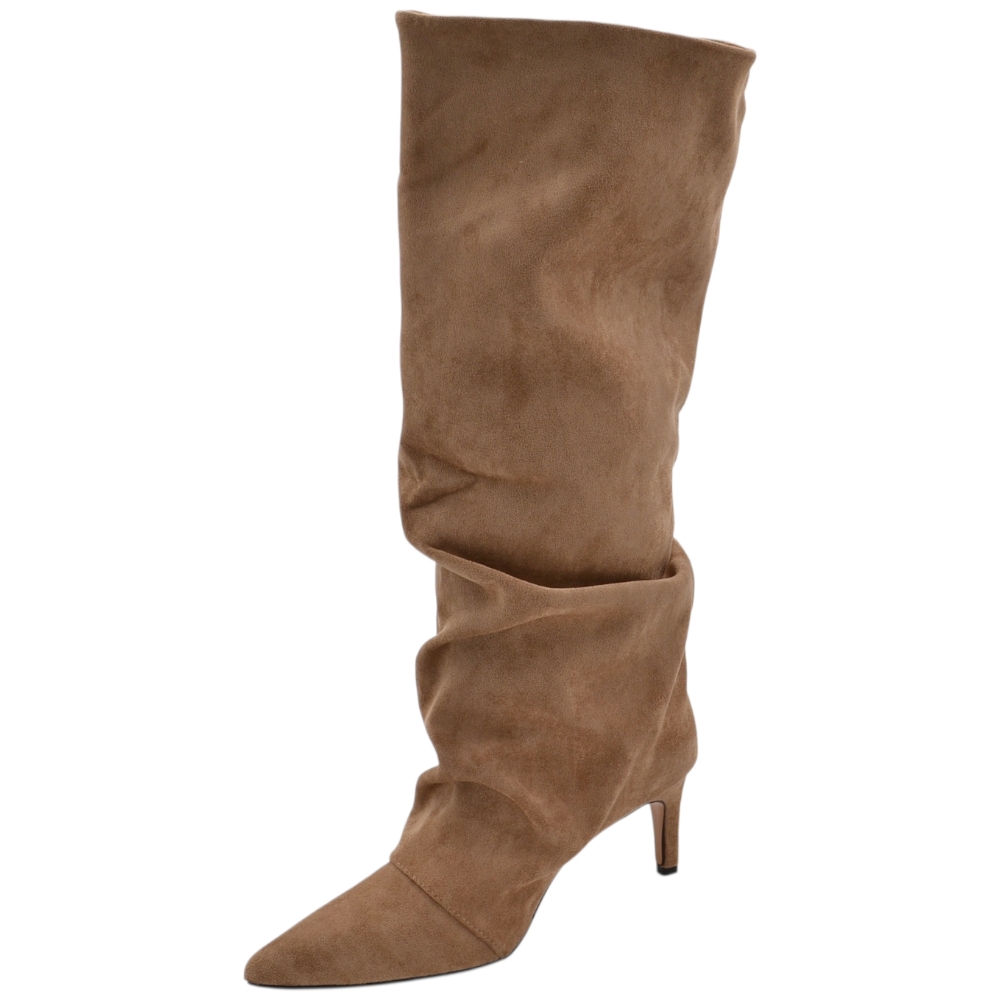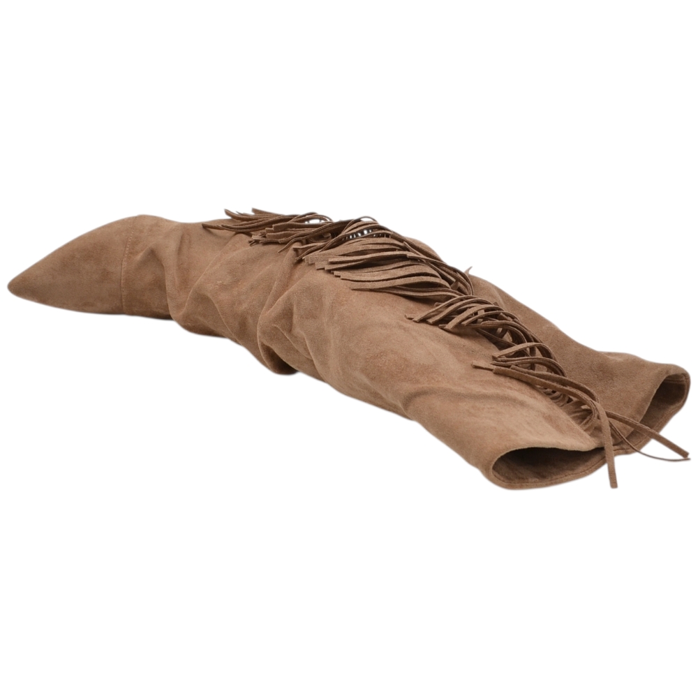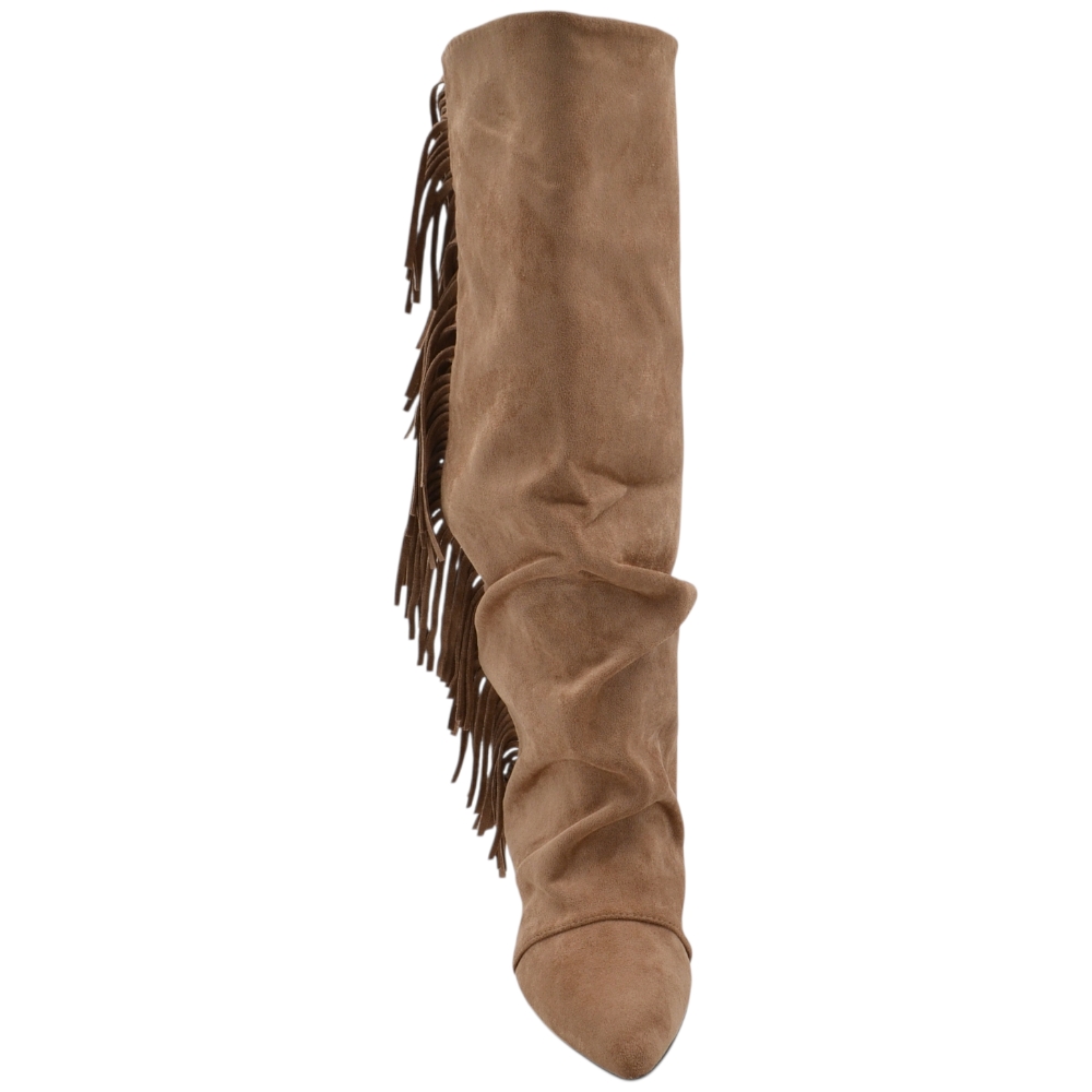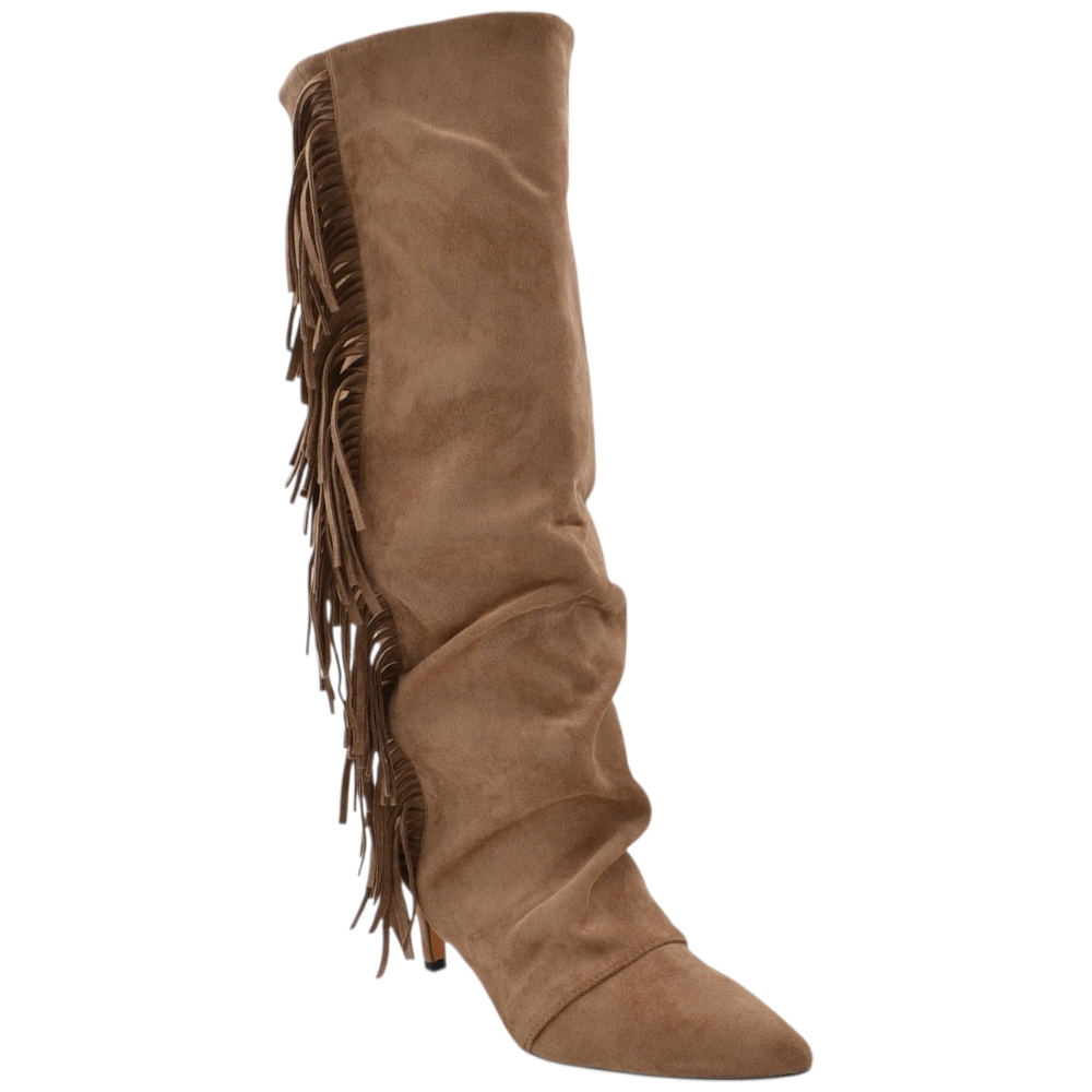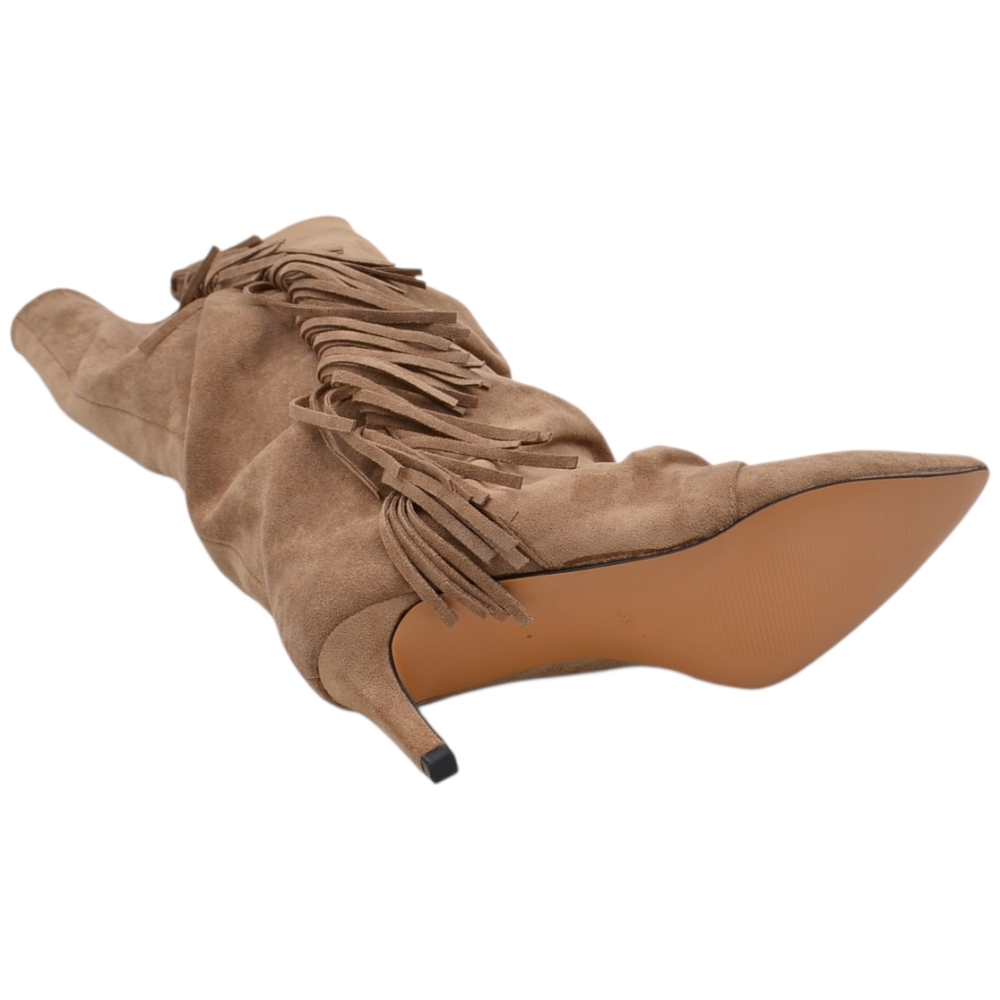 Stivale alto slouchy camoscio beige donna linea Basic con tacco a spillo kitten 3 cm gambale over a punta zip frange