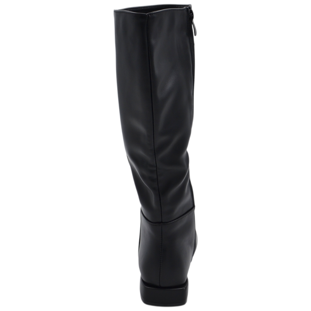 Stivali donna nero ecopelle altezza biker tinta unita traforato polpaccio morbido con fibbia gomma antiscivolo glam moda.
