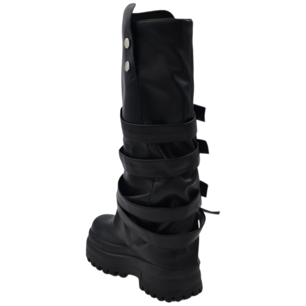 Stivali anfibi donna platform modello chiara doppio taschino zip altezza ginocchio moda street lacci lunghi regolabili.