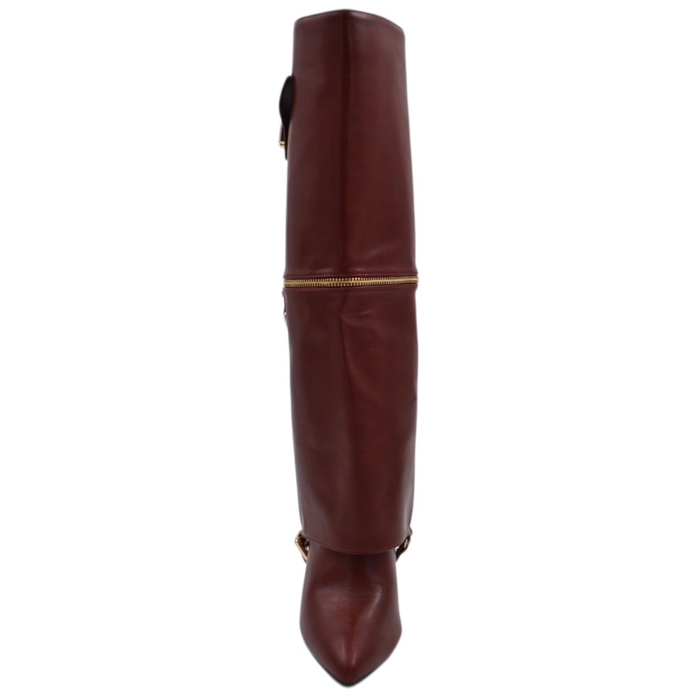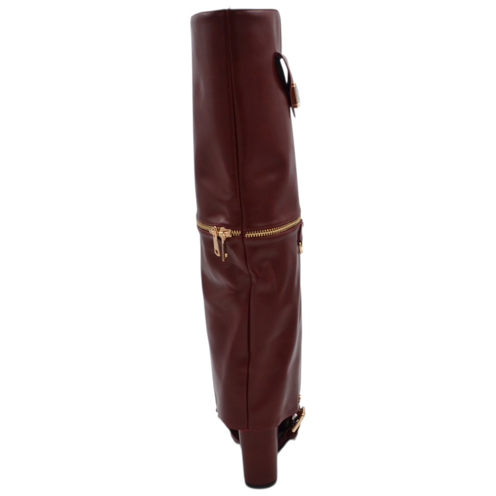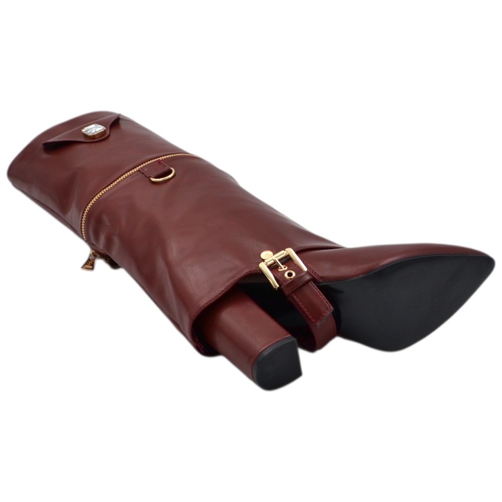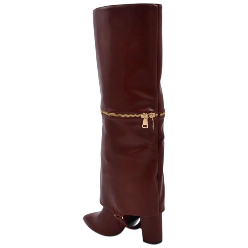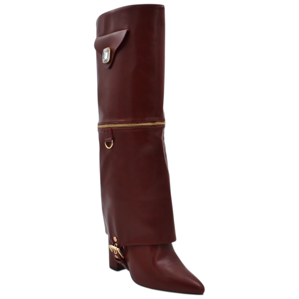 Stivali donna al ginocchio shark a punta in pelle bordeaux risvolto brillantino oro tacco largo 10 zip interna nascosta