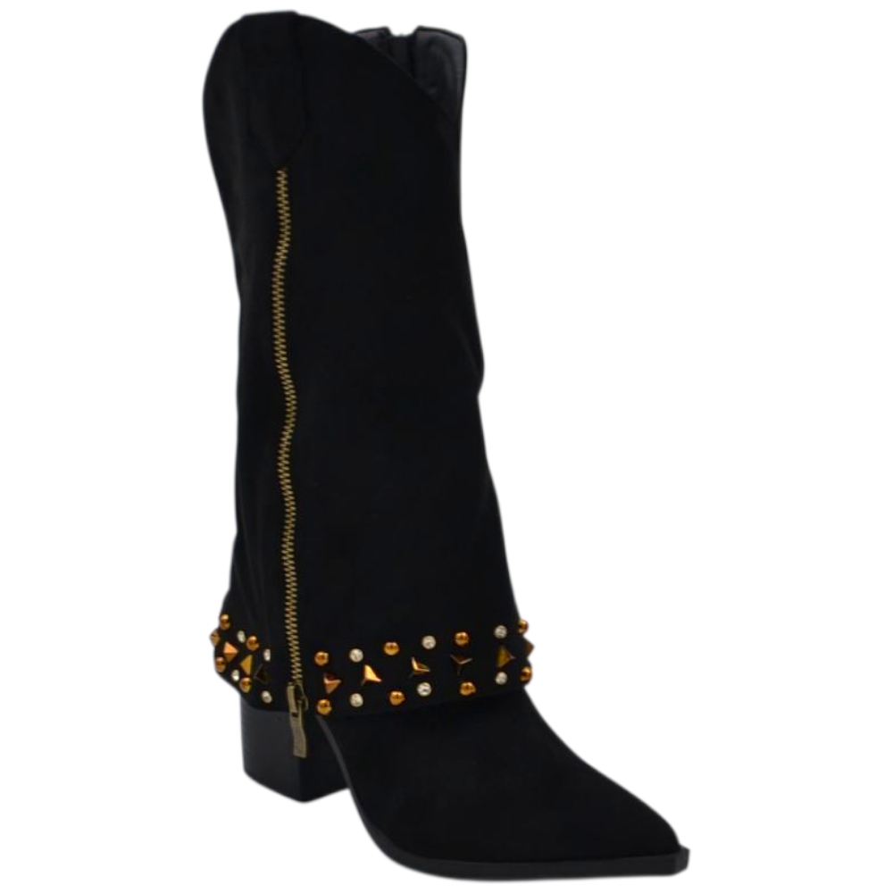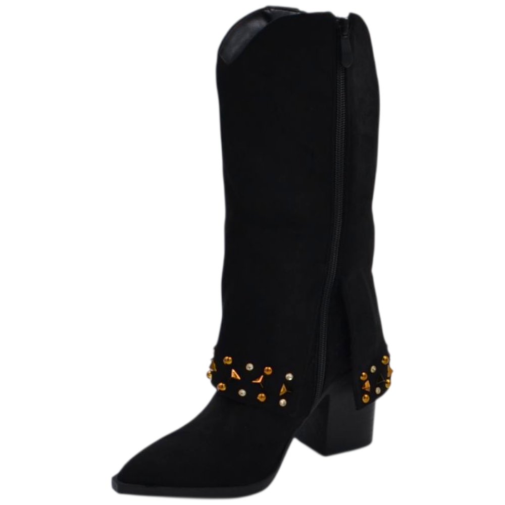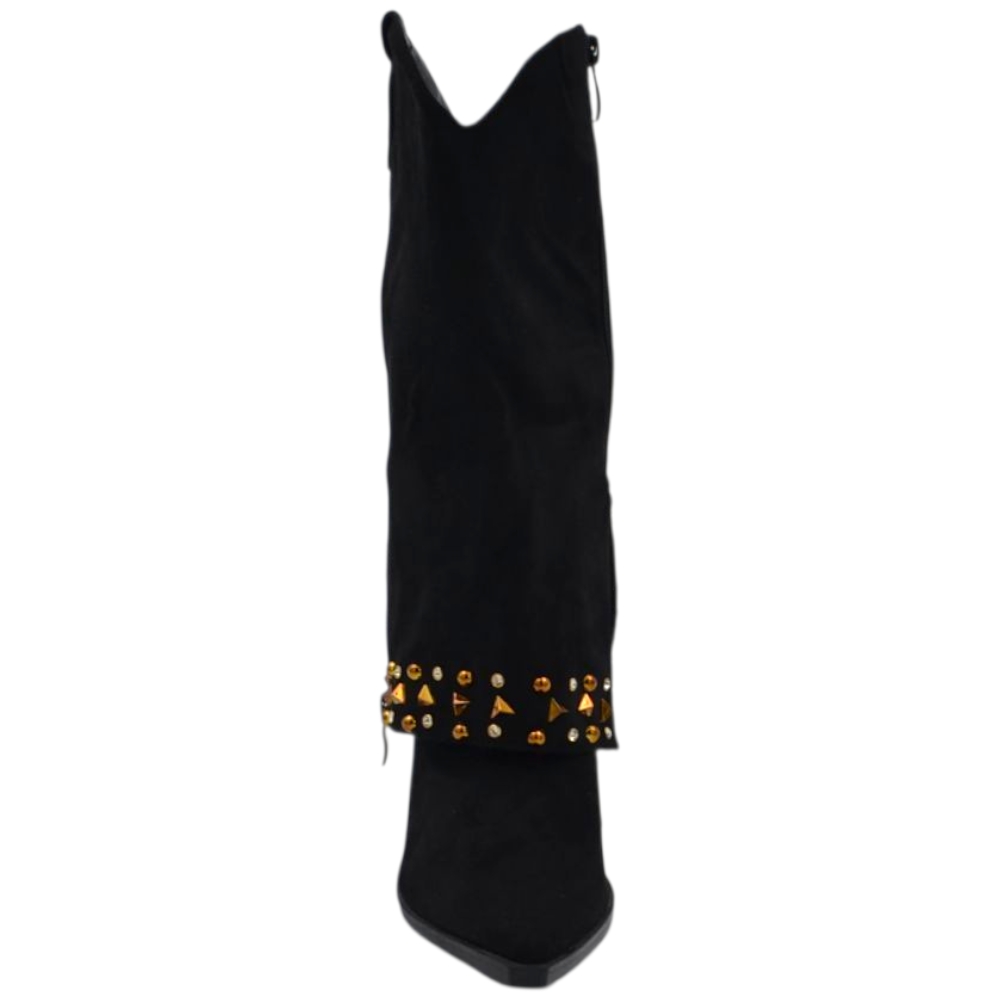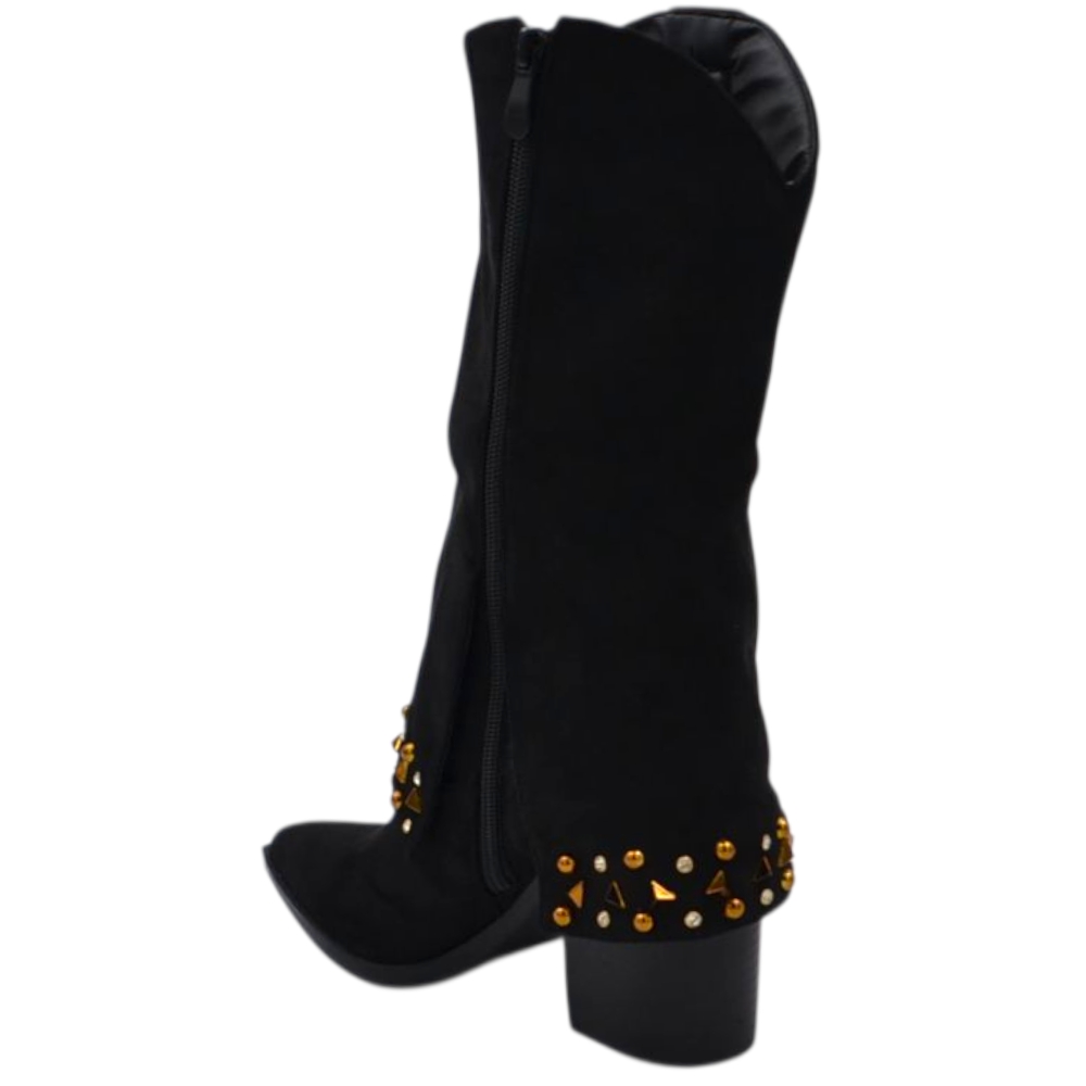 Stivaletti donna tronchetti camperos a punta in camoscio nero risvolto con brillantini oro tacco legno 10 cm
