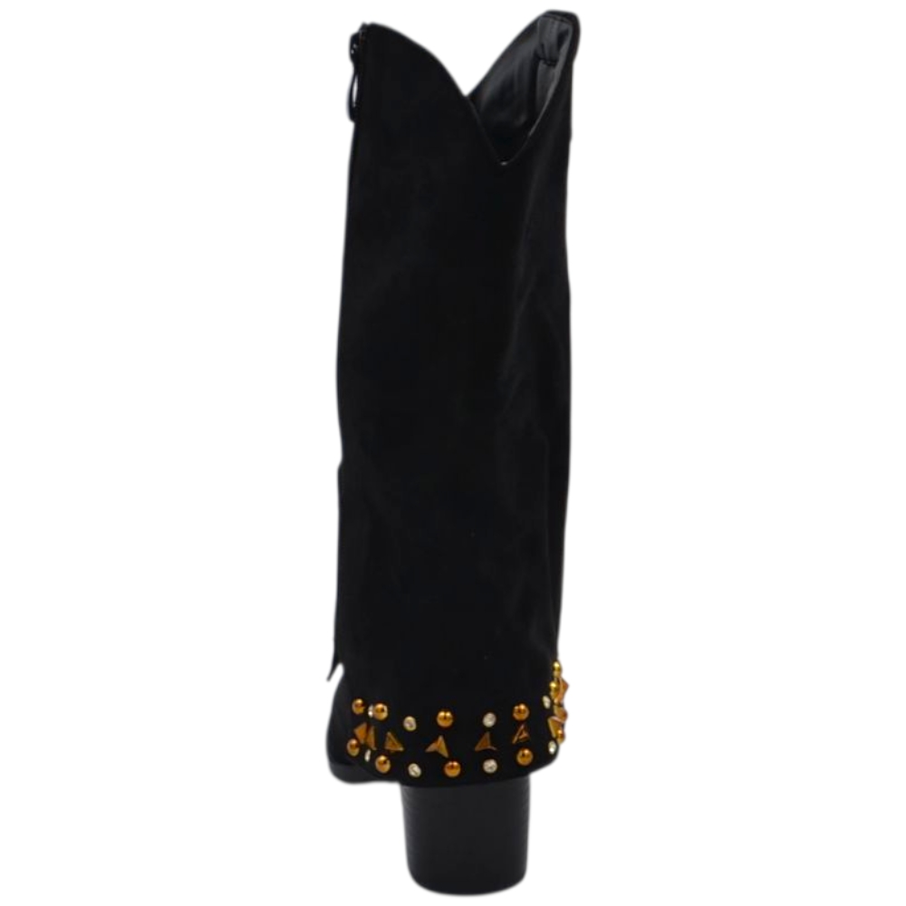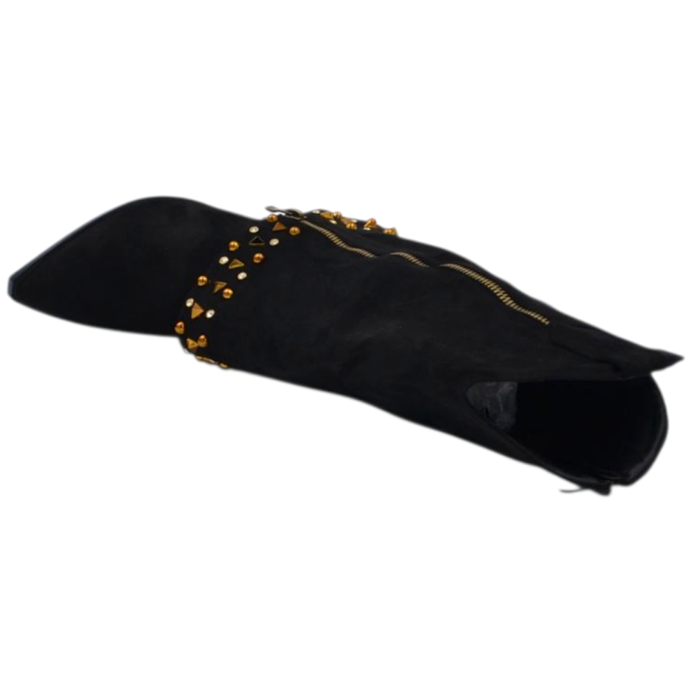 Stivaletti donna alti in camoscio nero applicazioni oro modello shark risvolto fino a terra zeppa 10 cm con zip .