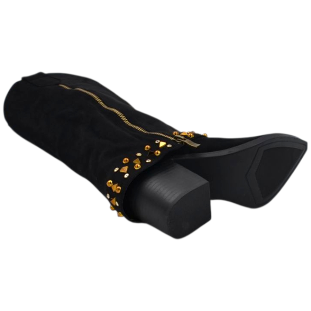Stivaletto tronchetto donna a punta camoscio cuoio con borchie oro tonde tacco kitten 3 cm zip.