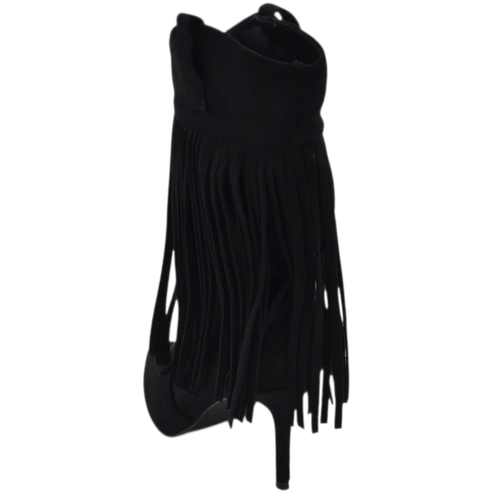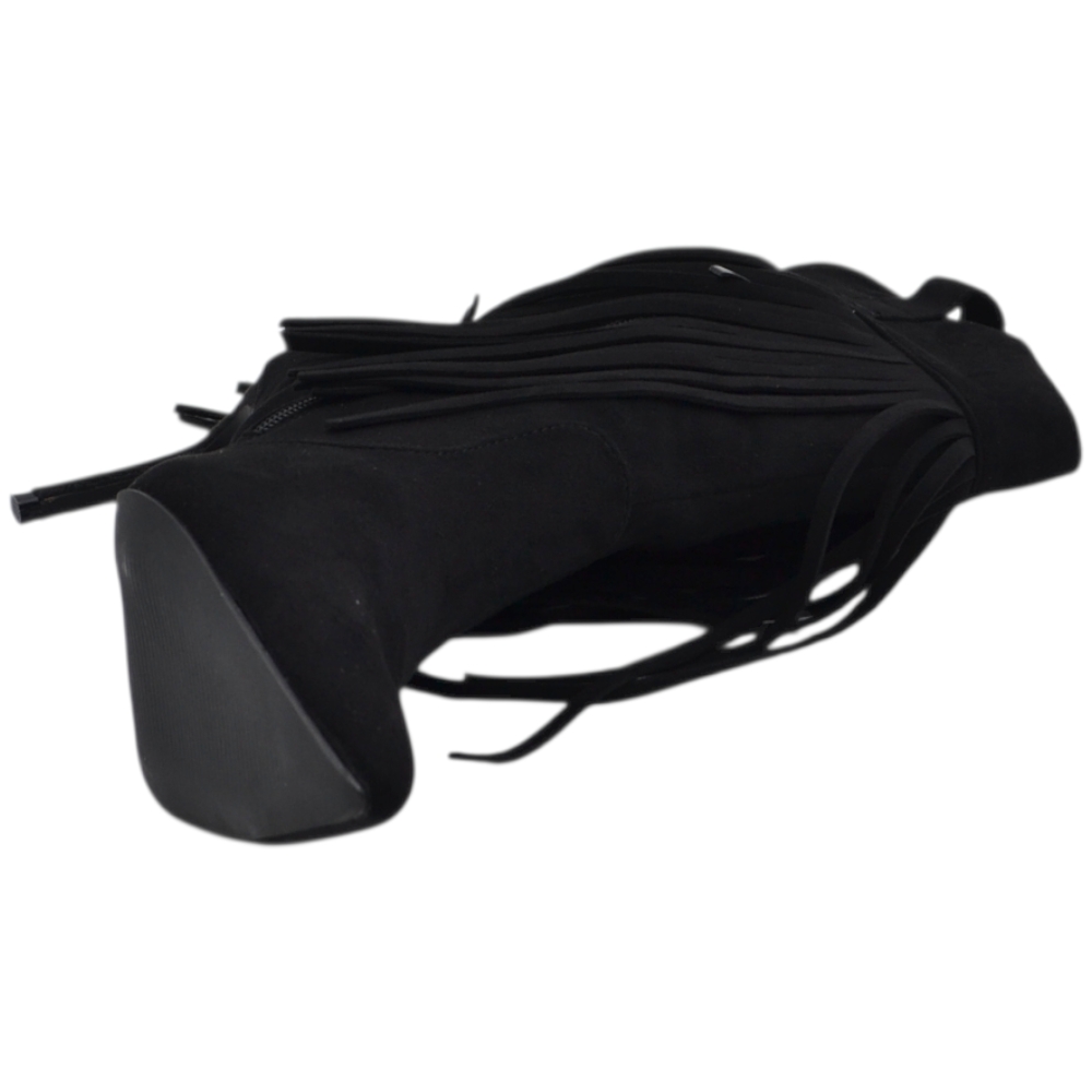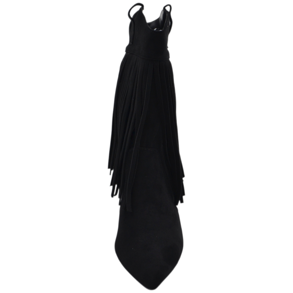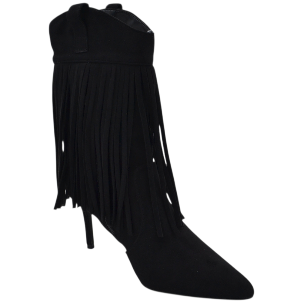 Stivaletto tronchetto donna meta' polpaccio a punta con frange camoscio nero tacco a spillo 10 zip
