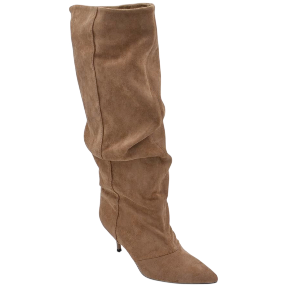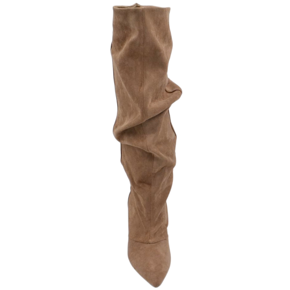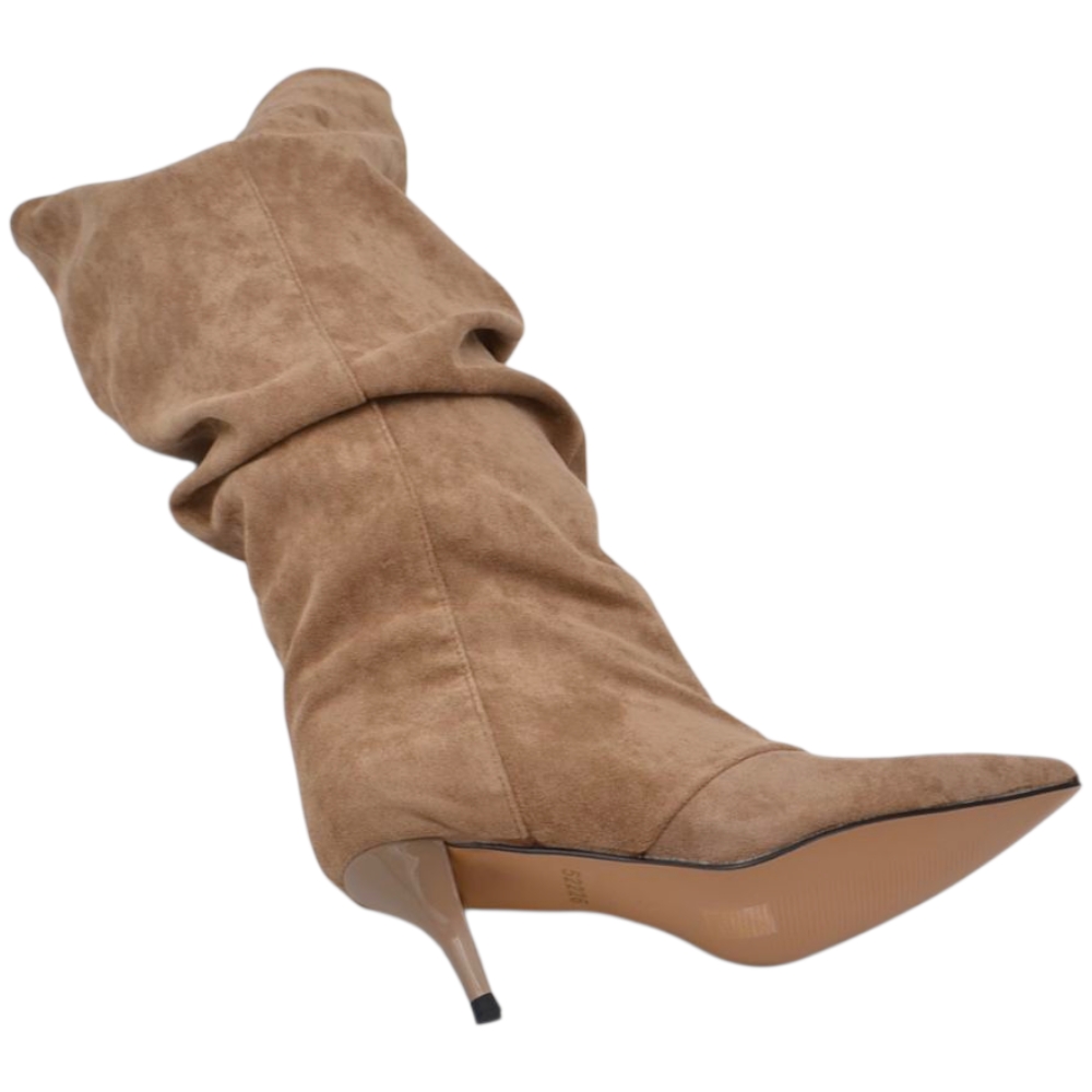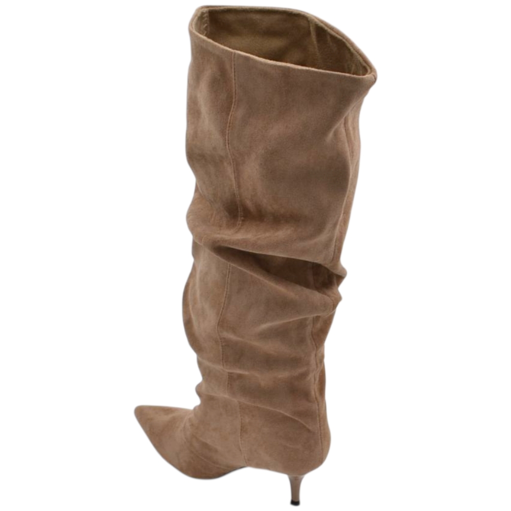 Stivale alto slouchy camoscio beige donna linea Basic con tacco a spillo kitten 5 cm gambale over a punta zip
