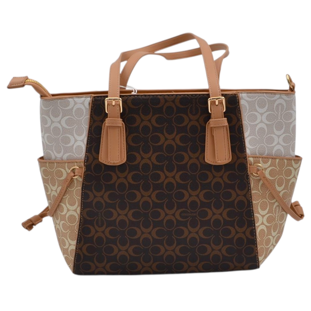 Borsa donna firmata Coconuda con manico e tracolla trapezio con tasche e zip marrone bianco e beige monogramma