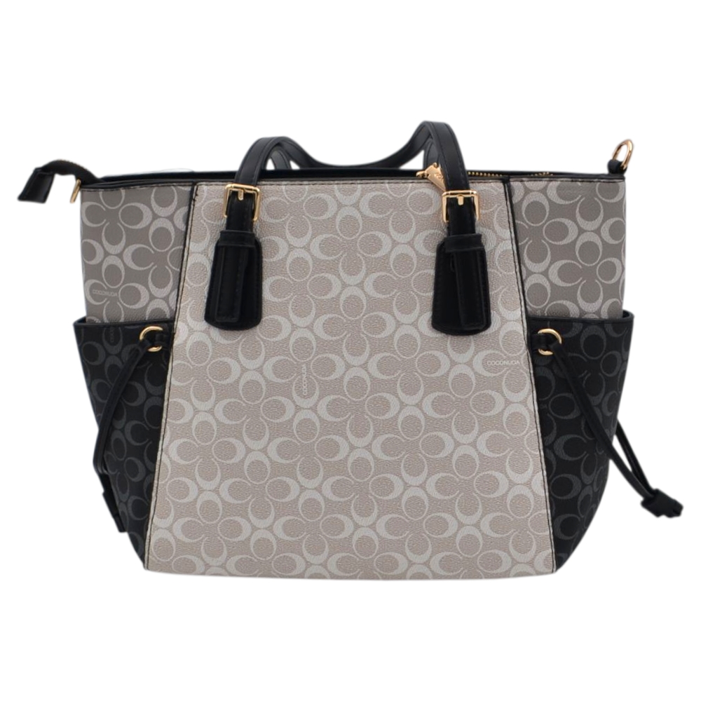 Borsa donna firmata coconuda con manico e tracolla trapezio con tasche e zip grigia nera e beige monogramma