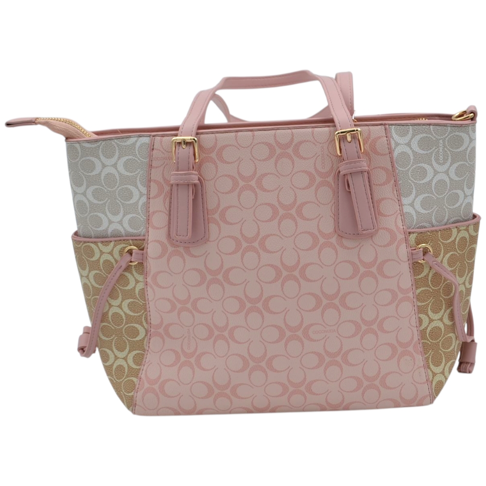 Borsa donna firmata Coconuda con manico e tracolla trapezio con tasche e zip beige rosa e grigio monogramma