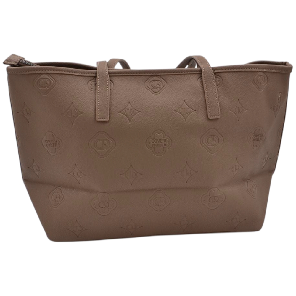 Borsa shopping donna firmata Coveri World morbida tinta unita tortora con fantasia monogramma zip