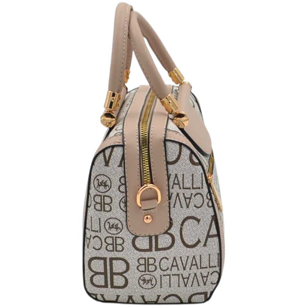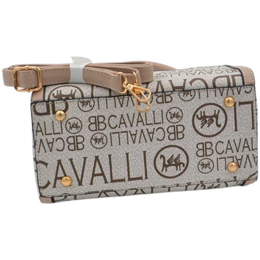 Borsa Donna a Mano Bauletto Beige Logo Cavalli Materiale Sintetico Rigido Manici Strutturati Dettagli Oro.