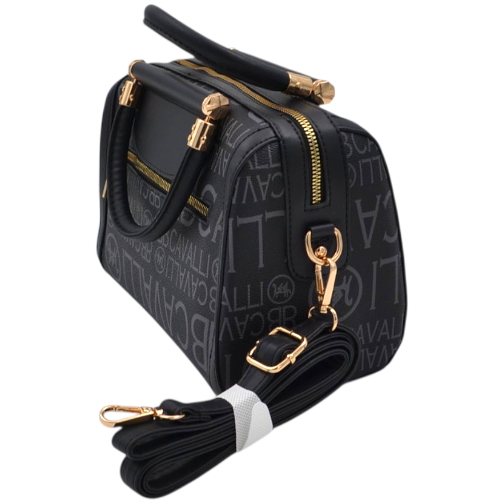 Elegante e raffinata, questa borsa donna a mano modello bauletto è caratterizzata dall’iconico logo Cavalli ripetuto su tutta la superficie, che dona un look moderno e riconoscibile. Il colore nero con stampa a contrasto la rende versatile e facile da abbinare a qualsiasi outfit, dal casual chic al più elegante.