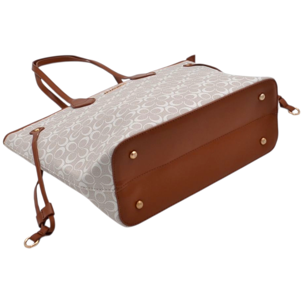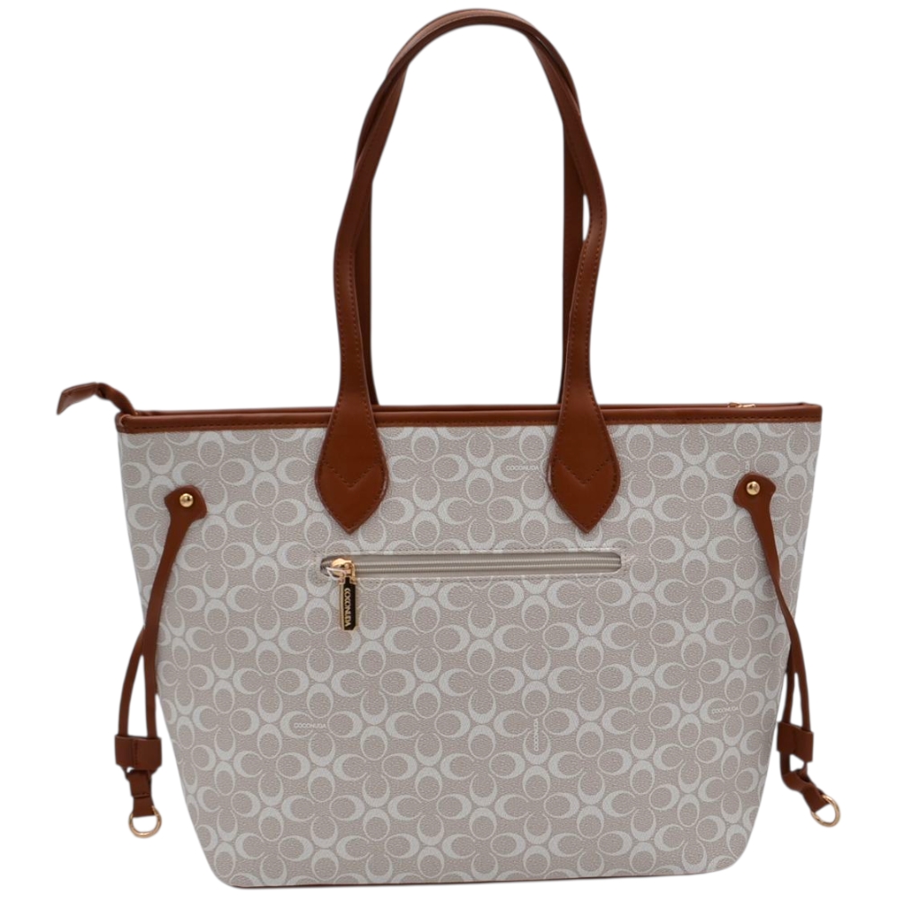 Borsa firmata Coconuda con manici fissi e lacci regolabili fantasia monogramma beige e cuoio zip dorata