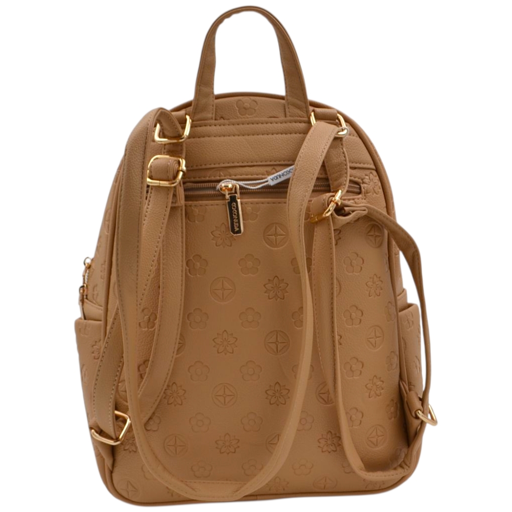 Zaino donna firmato Coconuda cuoio con motivo in rilievo monogramma e logo cerniere dorate