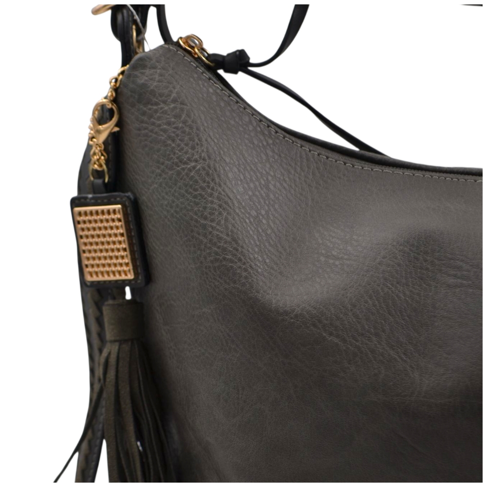 Borsa morbida donna firmata Charro a spalla sacco grigio con accessorio frangia e zip dorate
