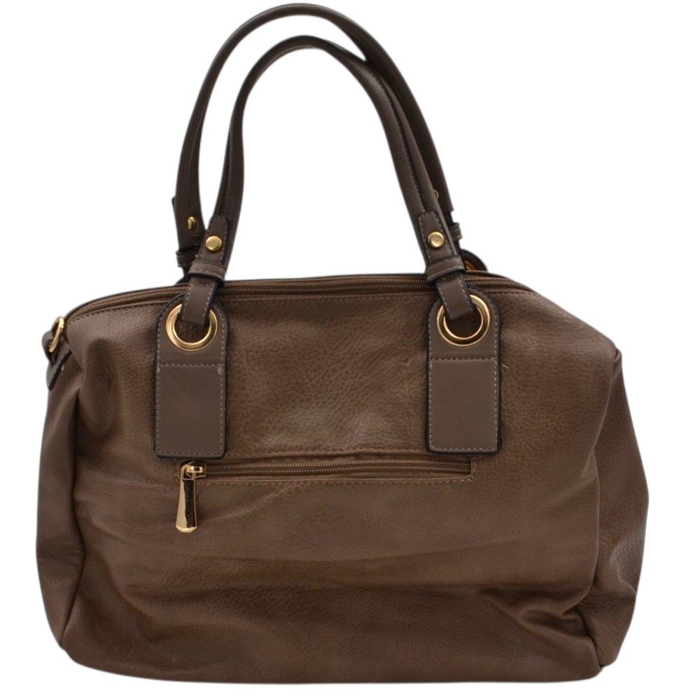 Borsa firmata coconuda con manici fissi e lacci regolabili fantasia monogramma marrone e cuoio zip dorata	.