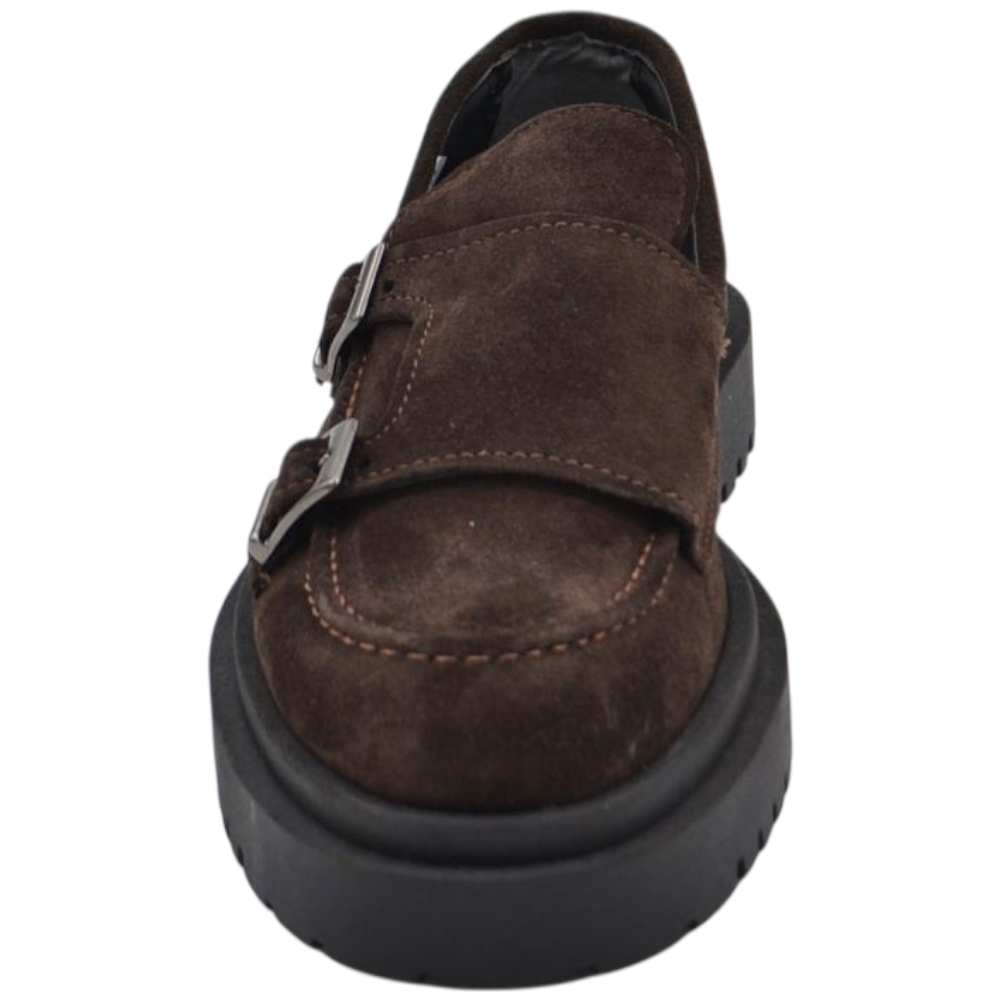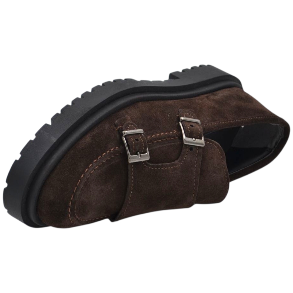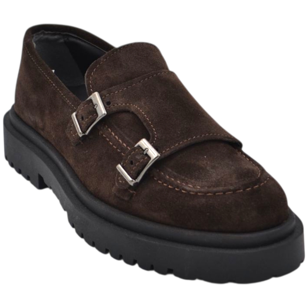 Scarpe uomo mocassino fibbia doppia marrone in vera pelle scamosciata business fondo gomma zigrinato alto 3 cm