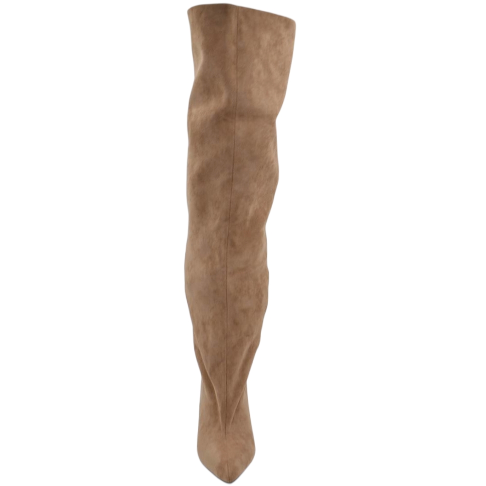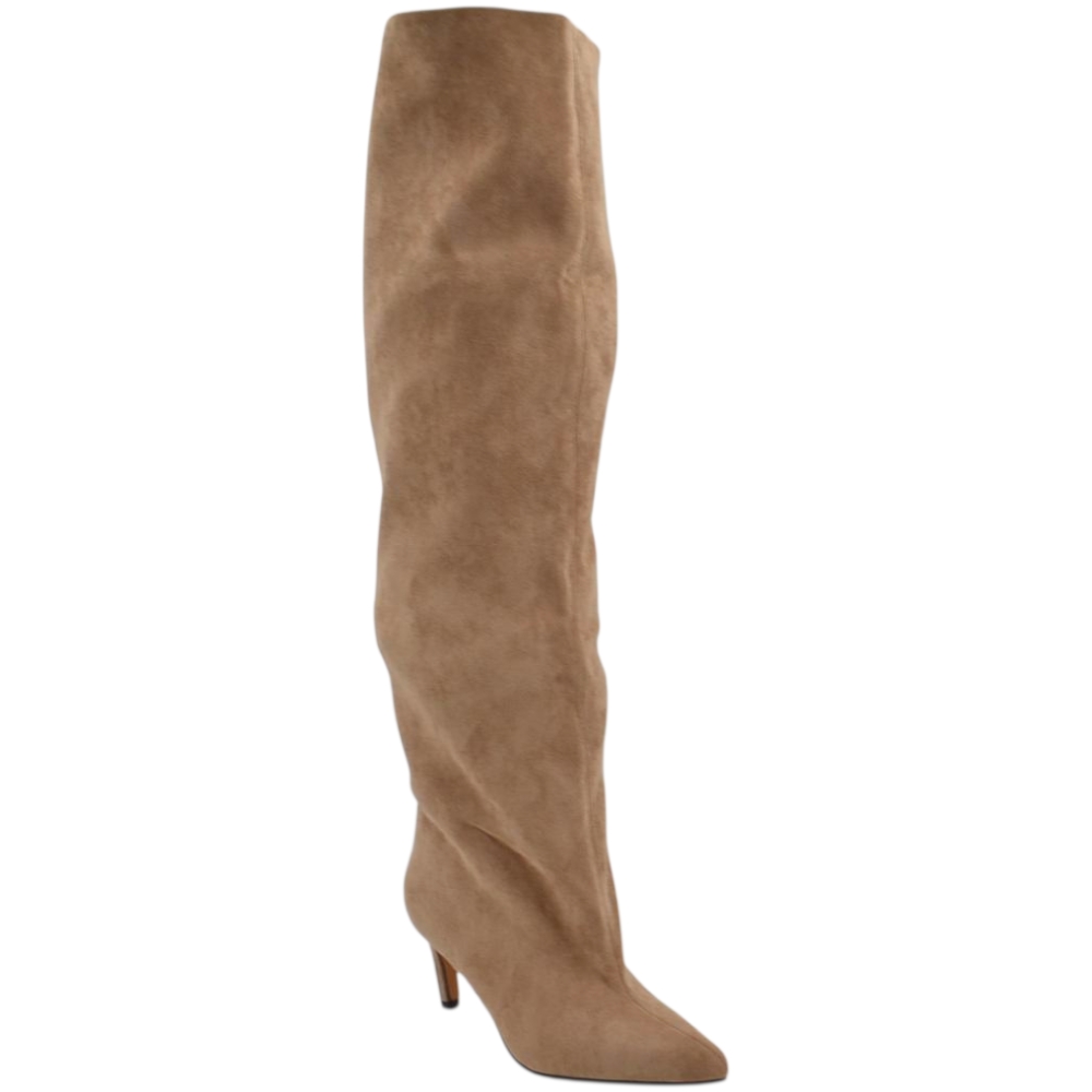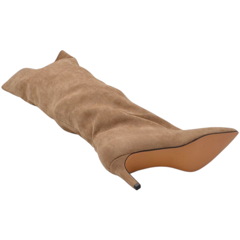 Stivali slouchy alto arricciato camoscio beige a punta con tacco basso kitten 5 cm gambale over