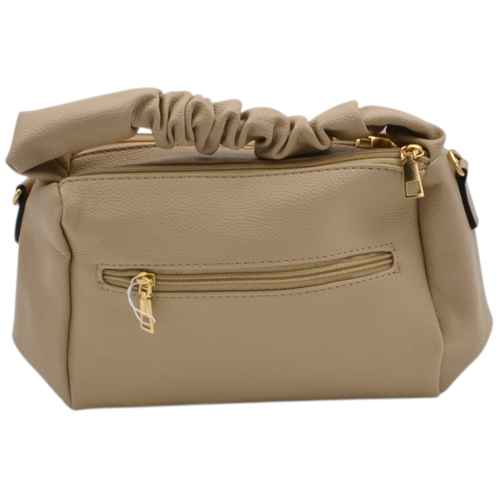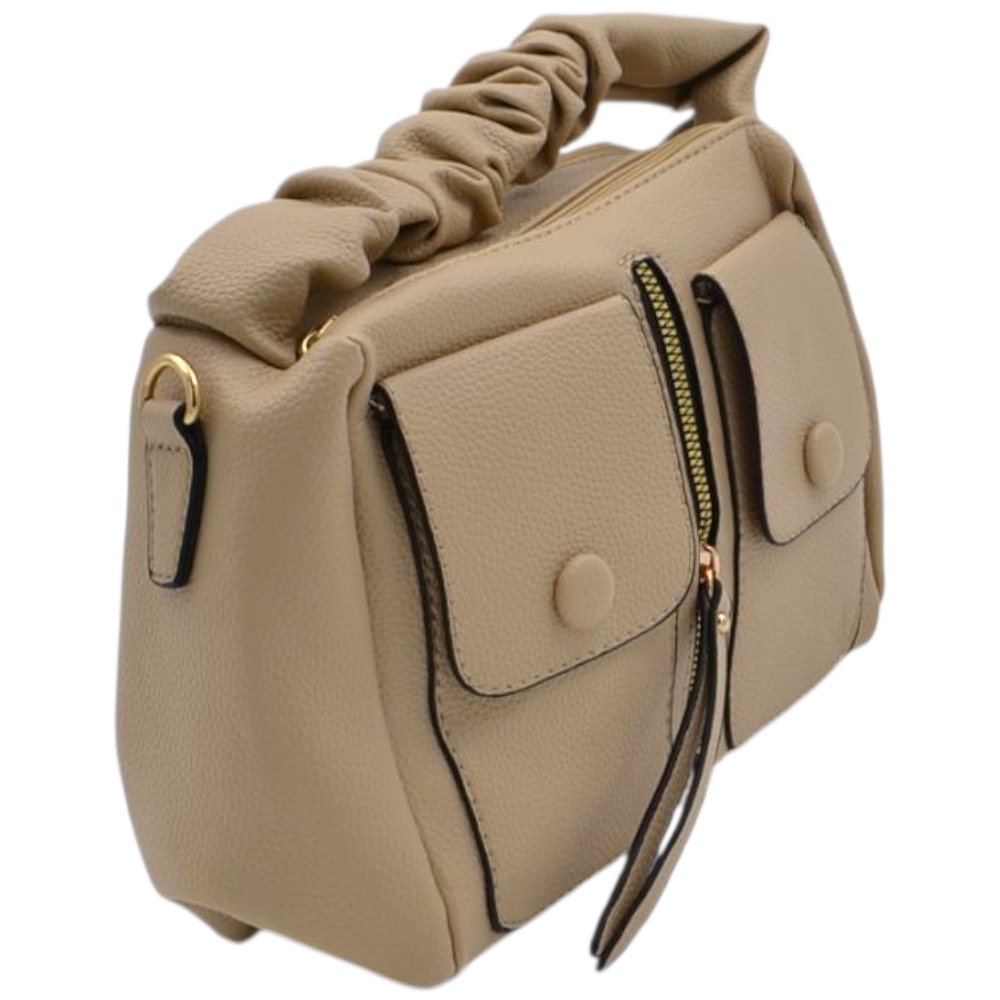 Borsa a mano donna small in pelle beige sabbia con zip tasche frontali e manico arricciato