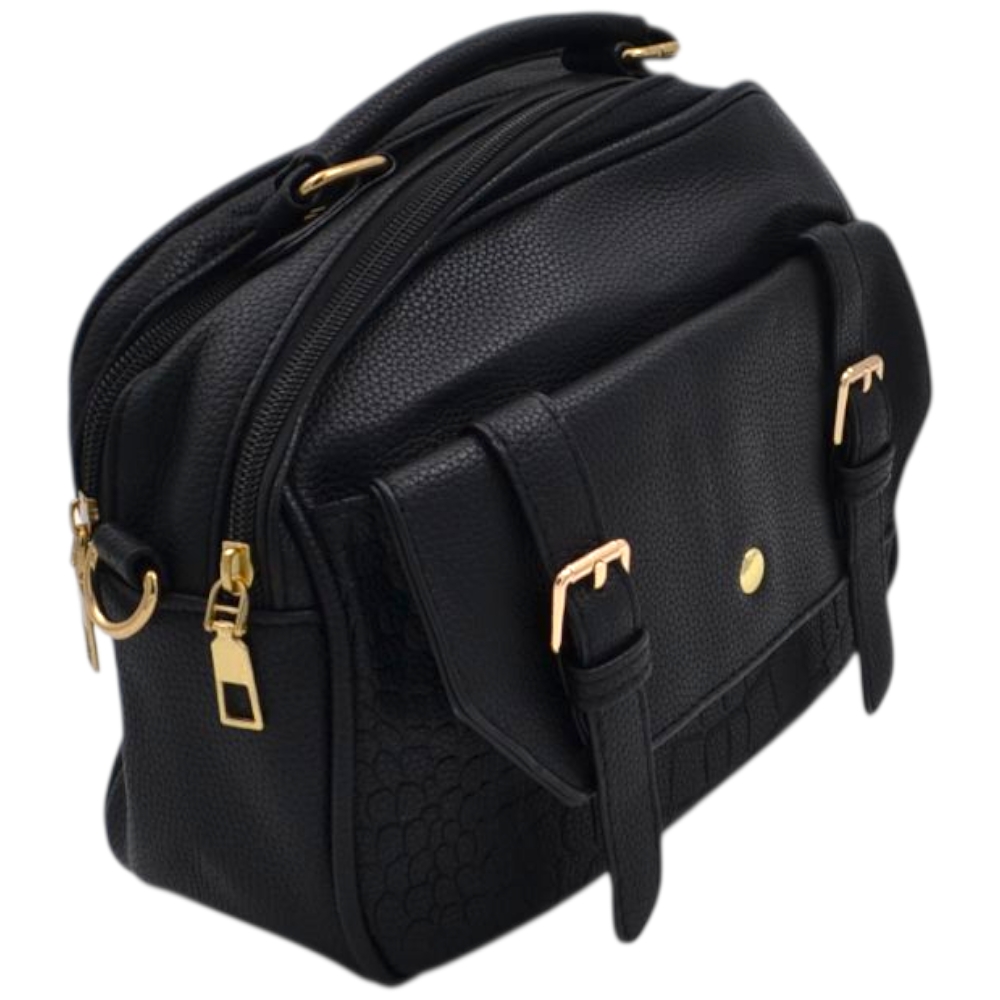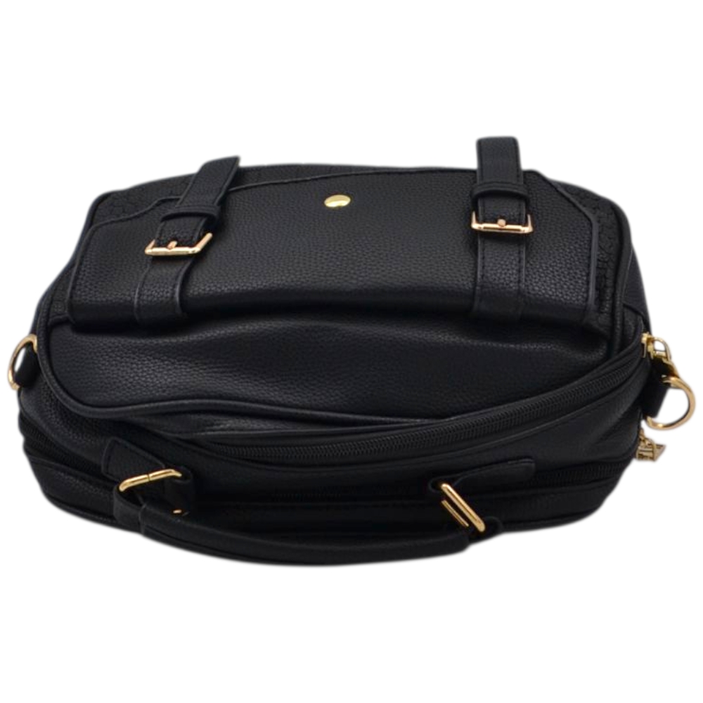 Borsa a mano e tracolla regolabile donna in pelle nera con zip tasche frontali e fibbie oro