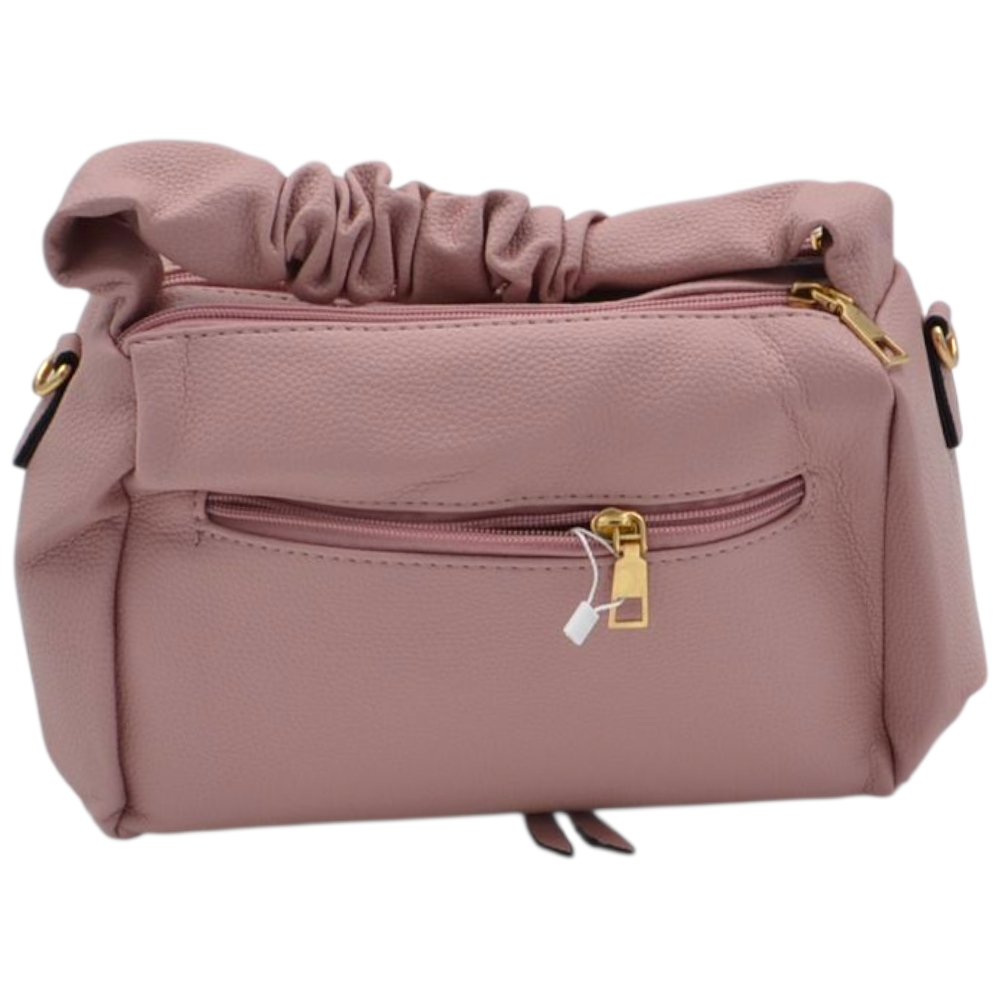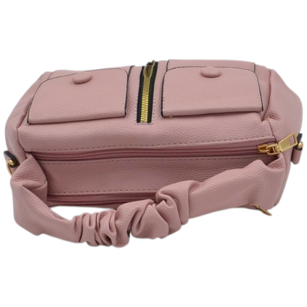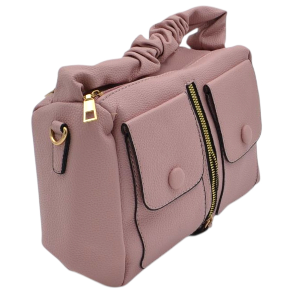 Borsa a mano donna small in pelle rosa cipria con zip tasche frontali e manico arricciato