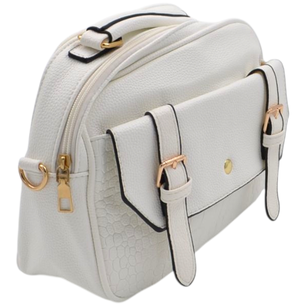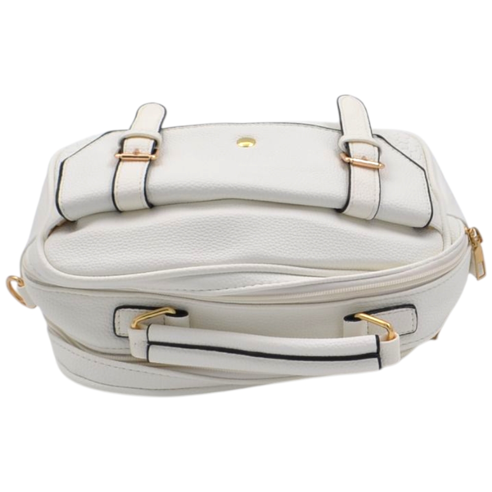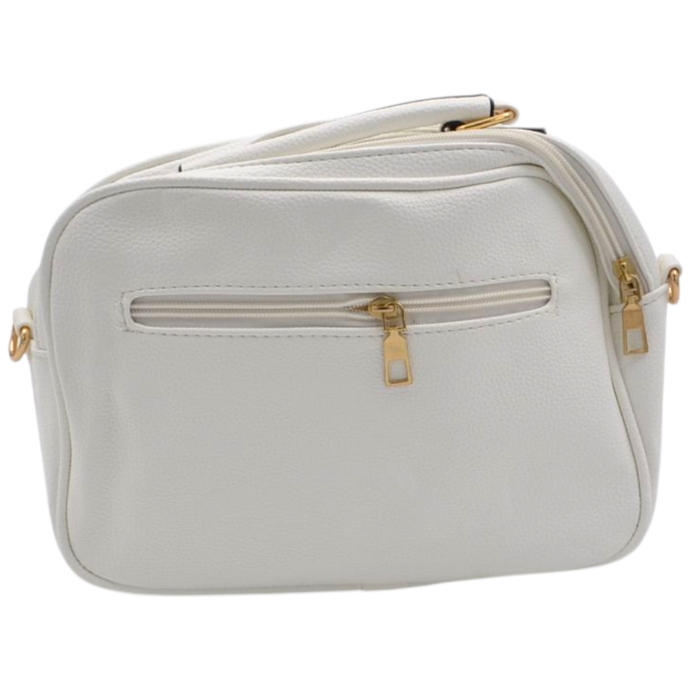 Borsa a mano e tracolla regolabile donna in pelle bianca con zip tasche frontali e fibbie oro