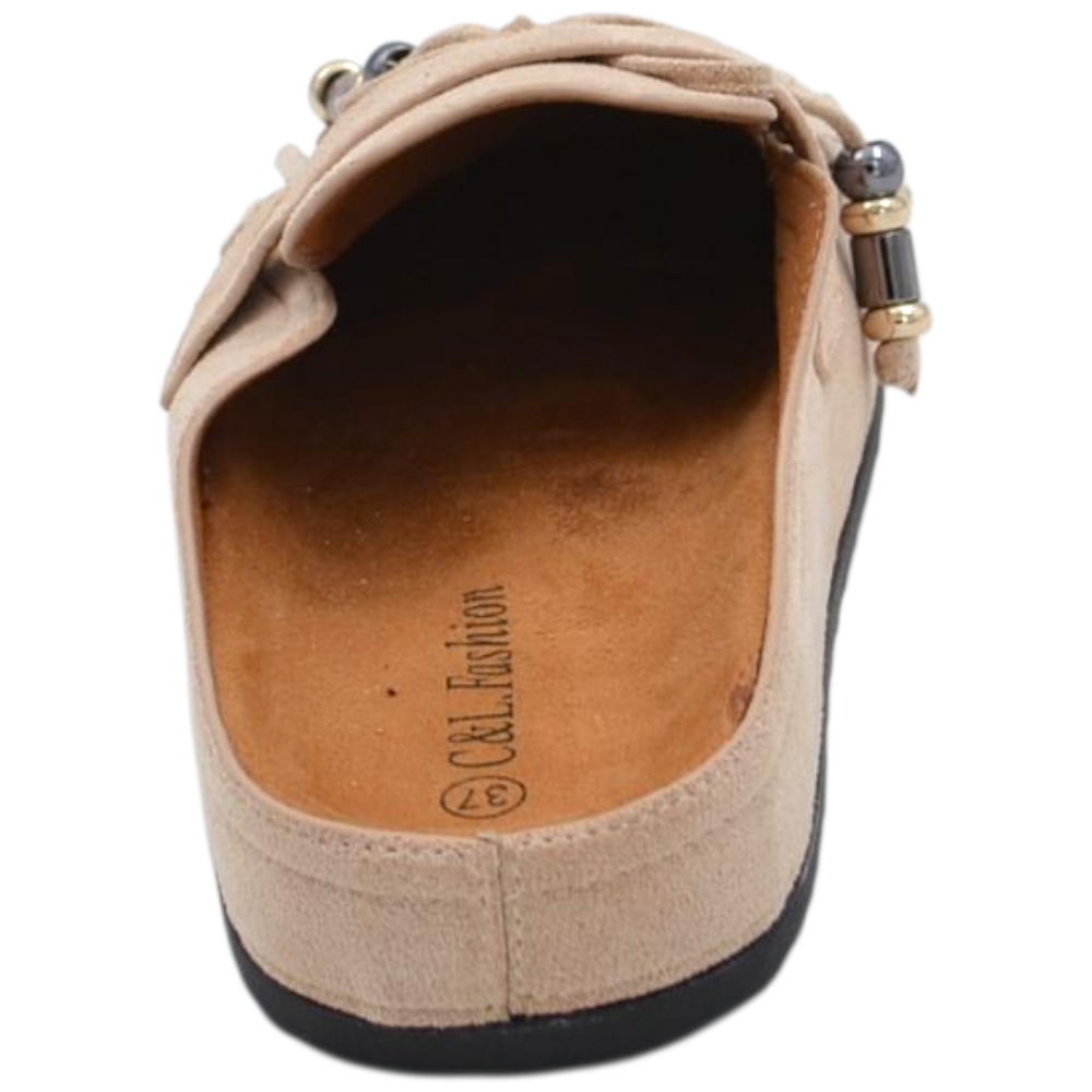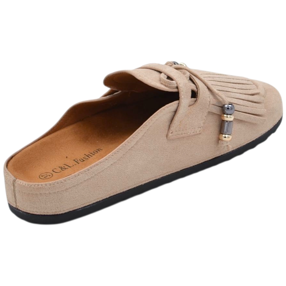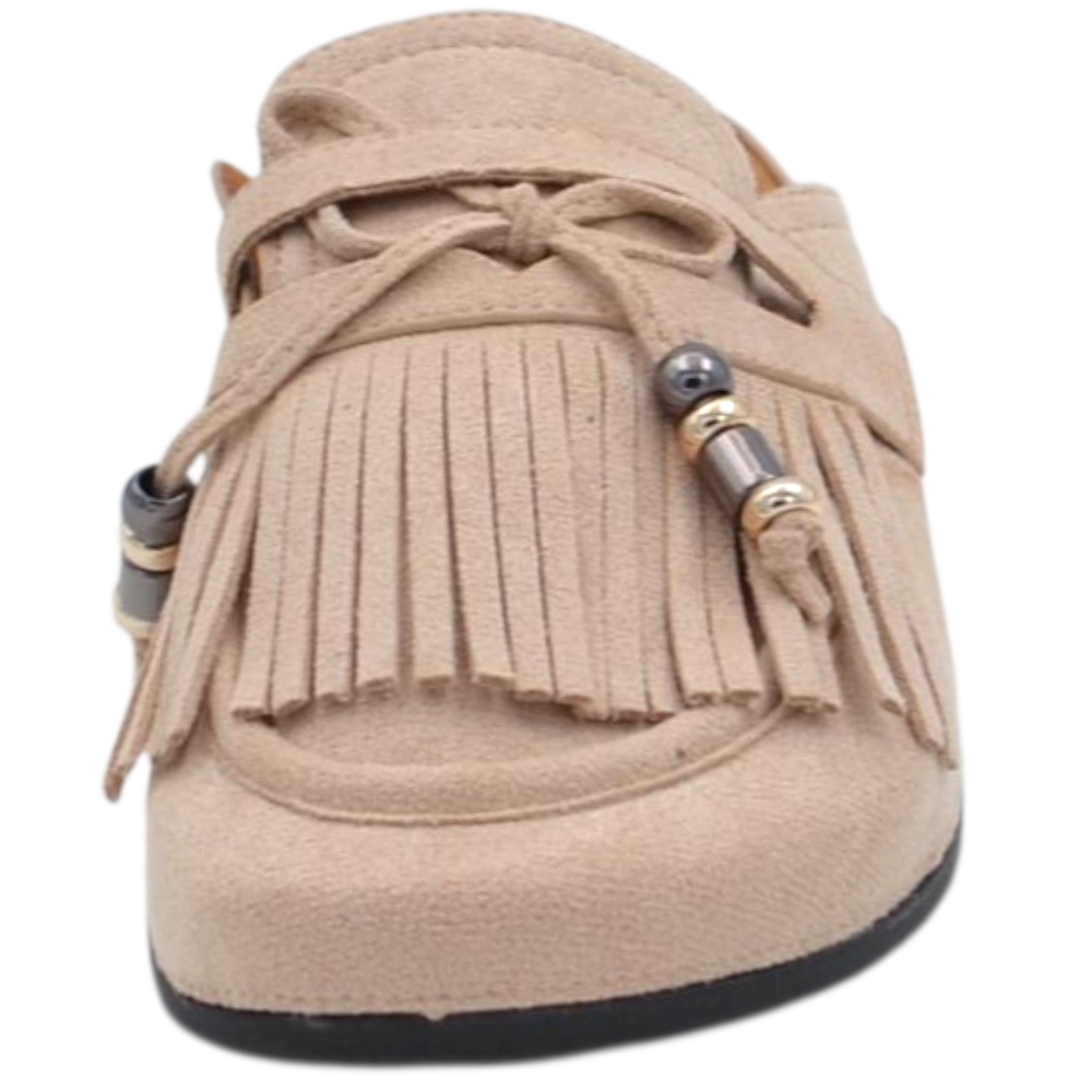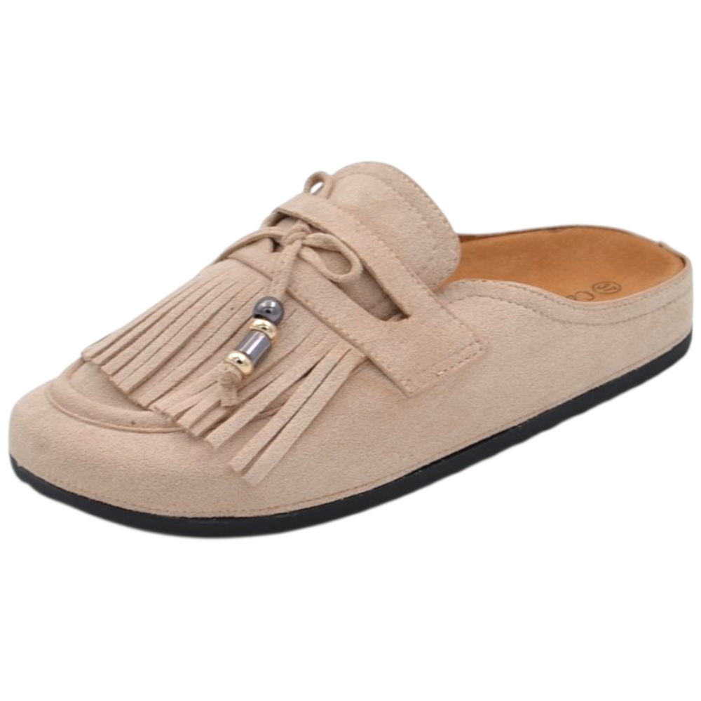 Pantofolina mule donna beige in camoscio con frange e fiocco sottopiede anatomico in sughero e suola in gomma