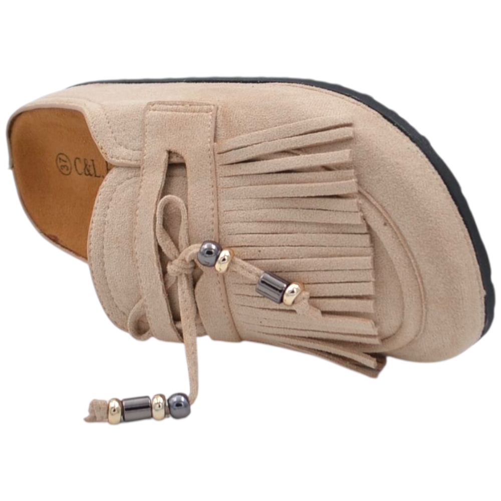 La tomaia è realizzata in camoscio sintetico di alta qualità, resistente all’usura e piacevole al tatto, lavorata con frange frontali e laccetto decorativo con inserti metallici che aggiungono un elemento estetico distintivo.