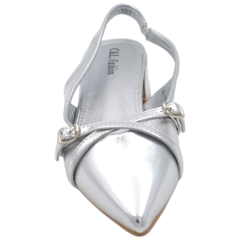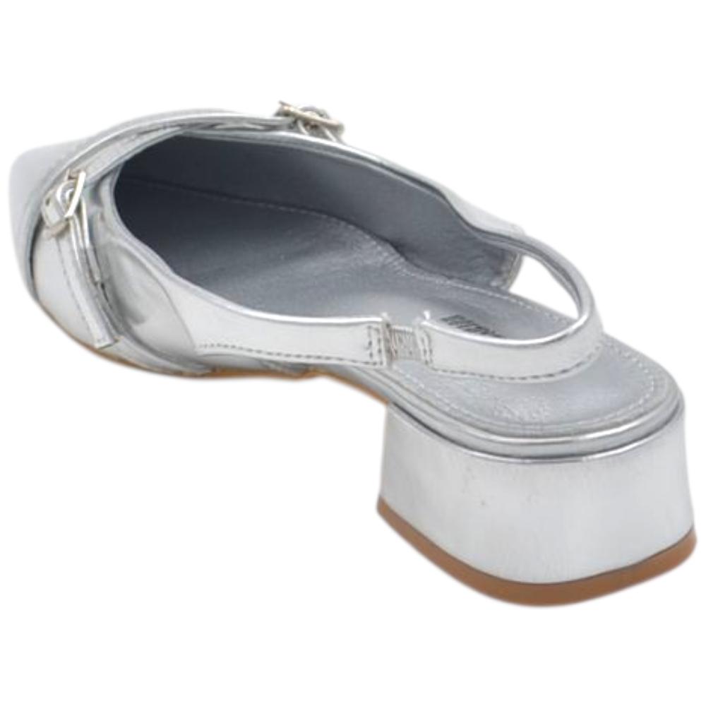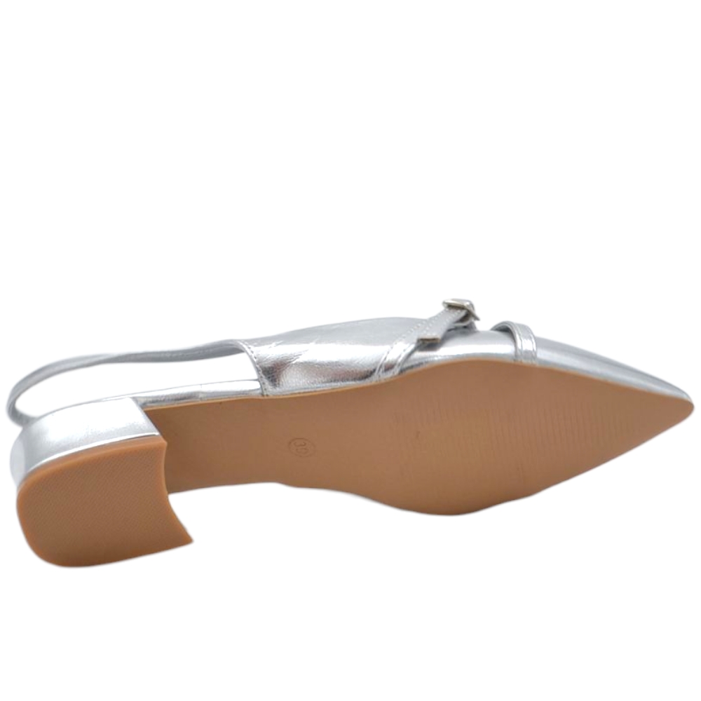 Decollete donna a punta in pelle argento effetto metallizzato con fibbie cinturino regolabile caviglia tacco doppio 4cm