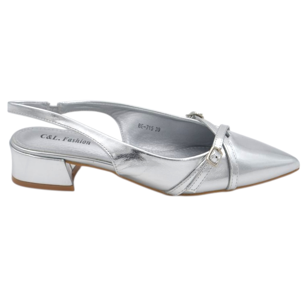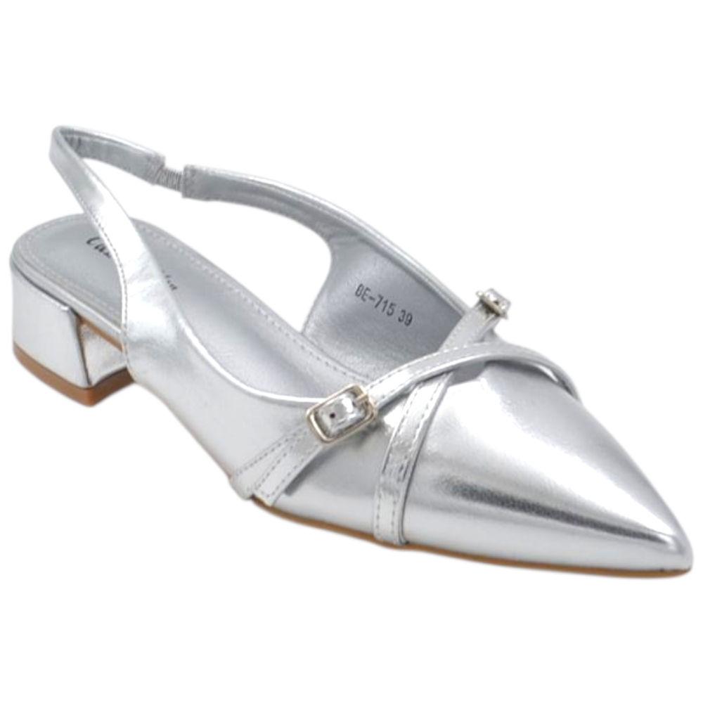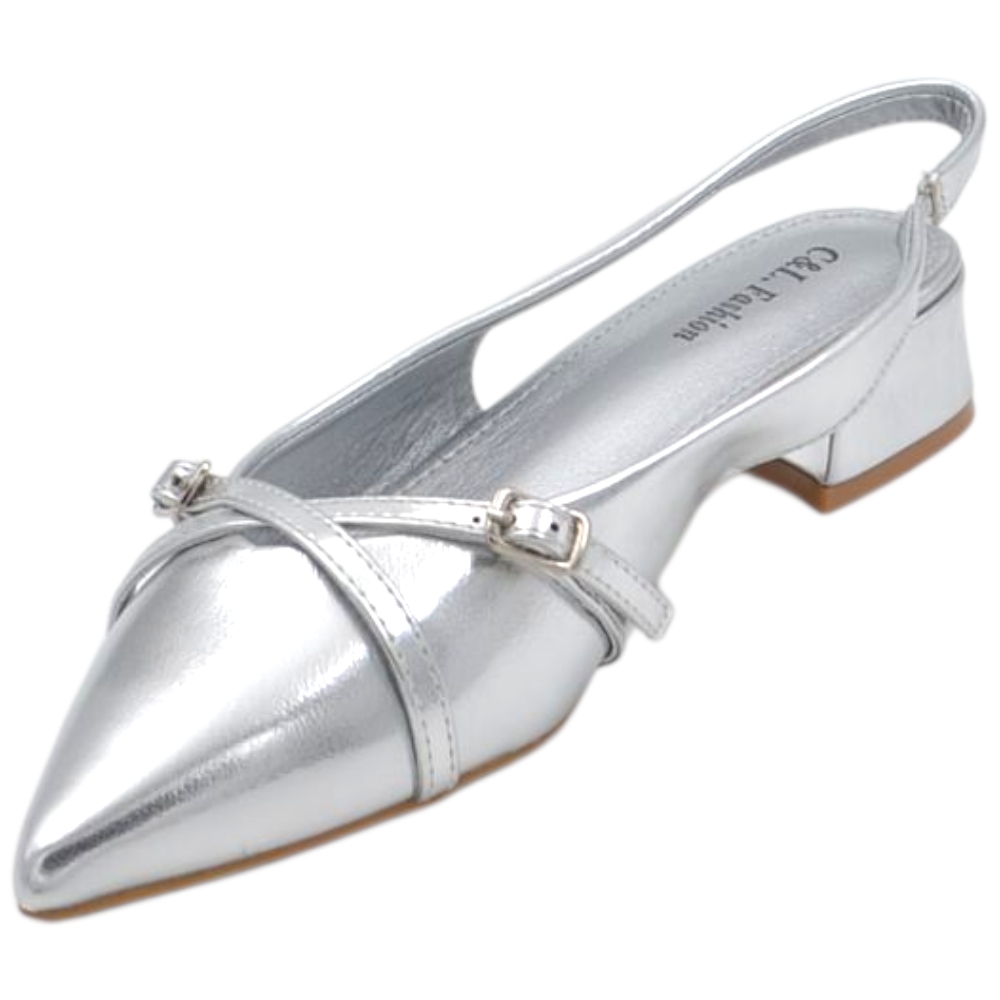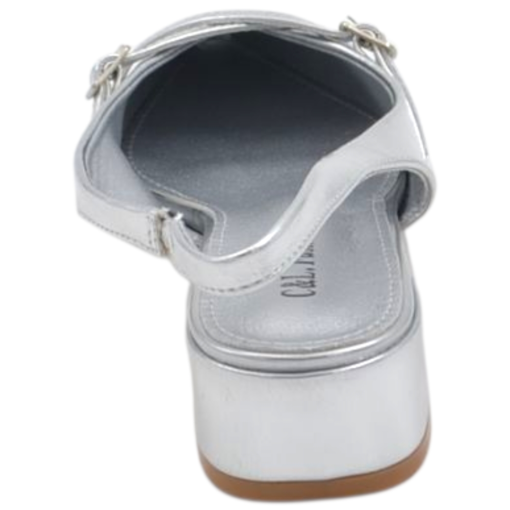 Decollete donna a punta in pelle argento effetto metallizzato con fibbie cinturino regolabile caviglia tacco doppio 4cm