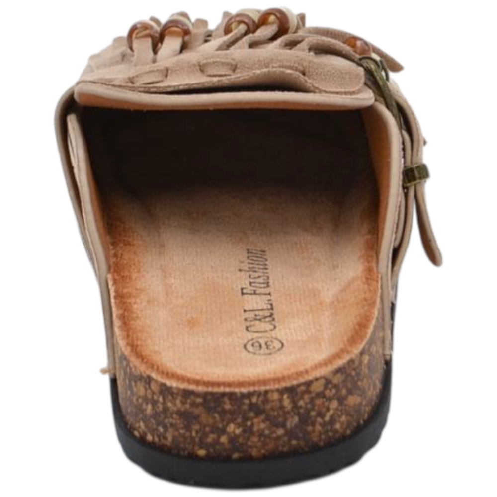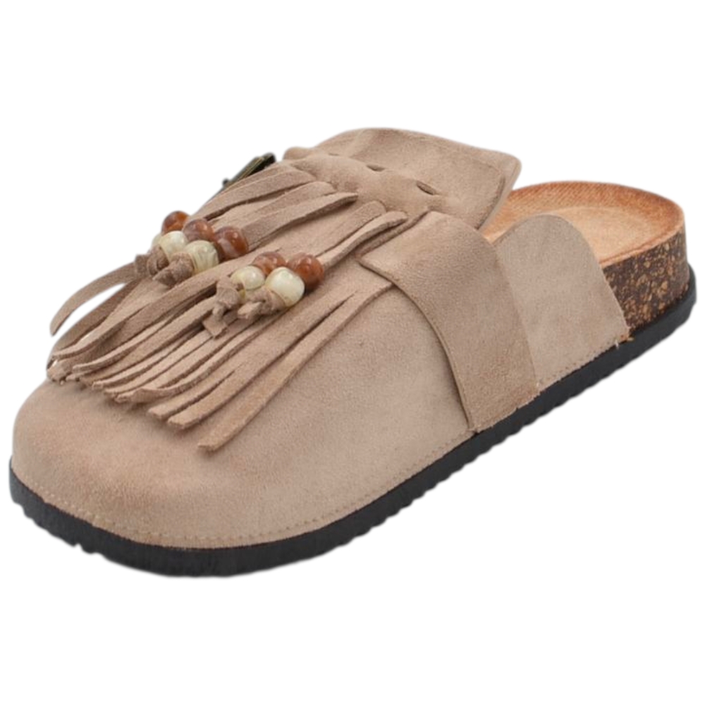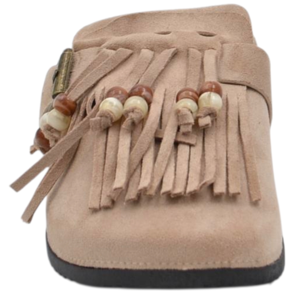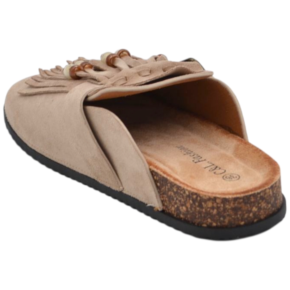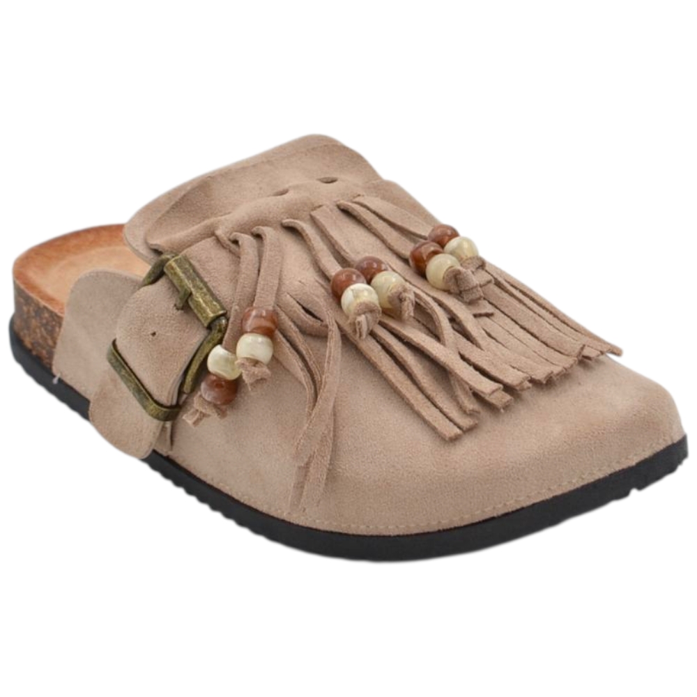 Pantofolina mule donna taupe in camoscio con frange sottopiede anatomico in sughero e suola in gomma
