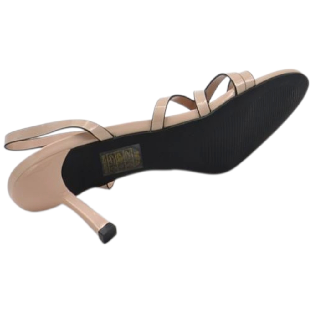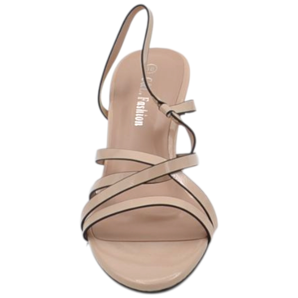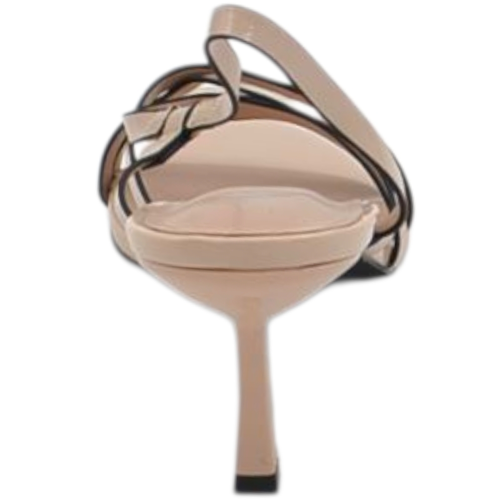Sandalo donna in vernice beige nude con fascette sottili incrociate e tacco sottile 7 cm chiusura regolabile caviglia