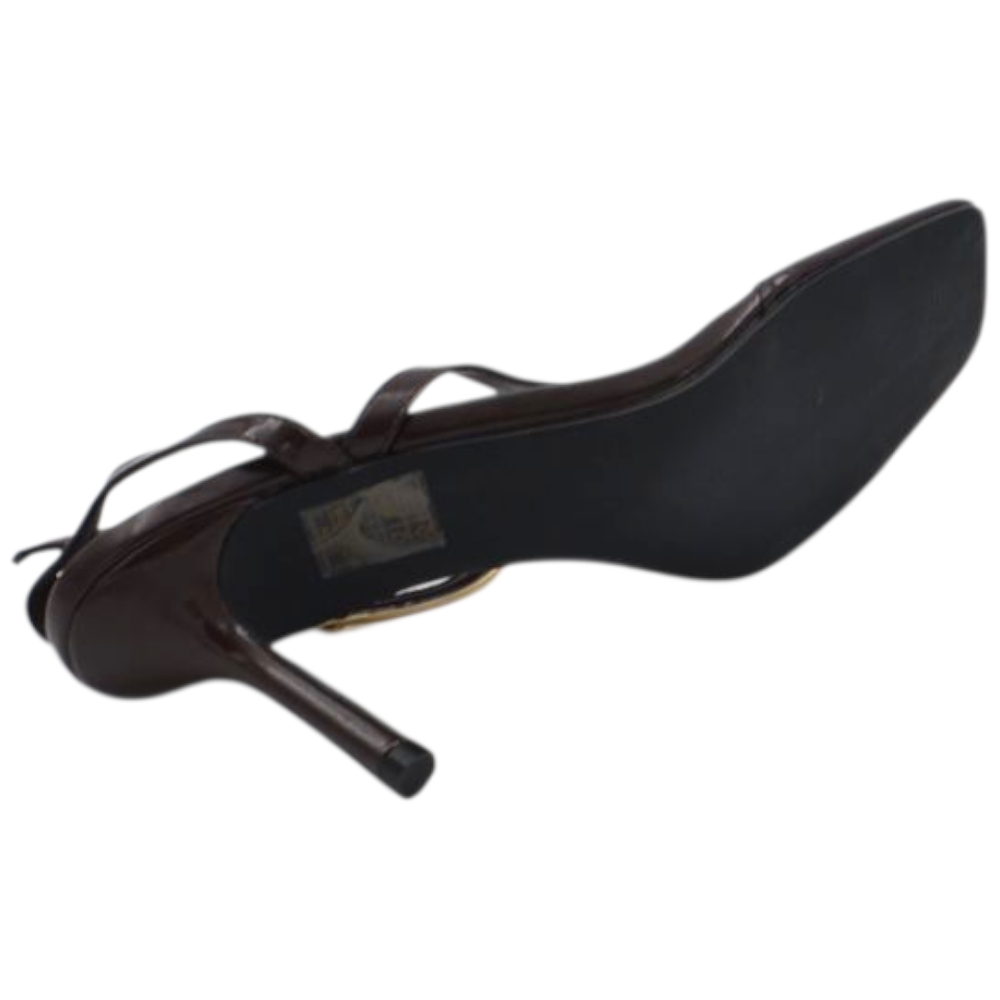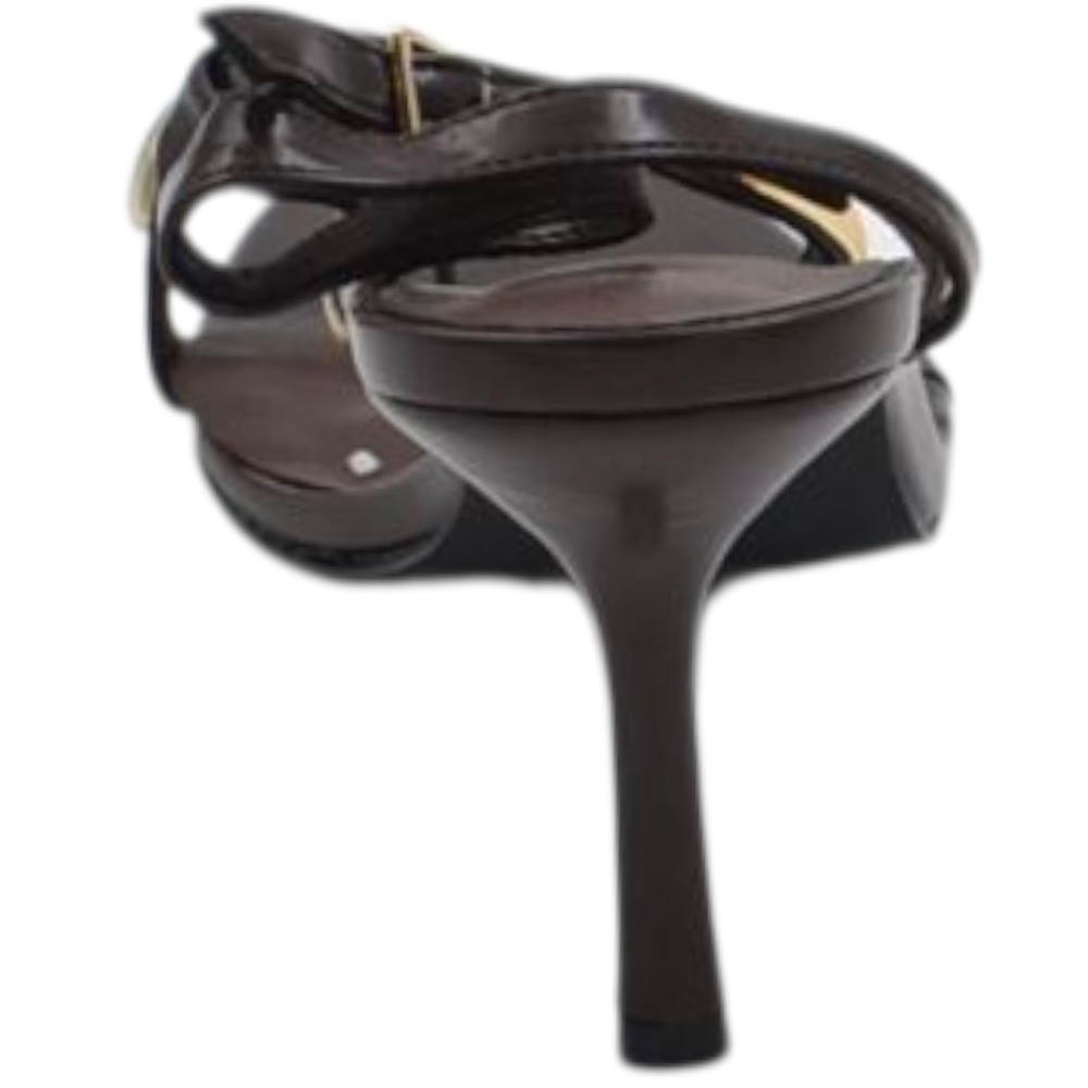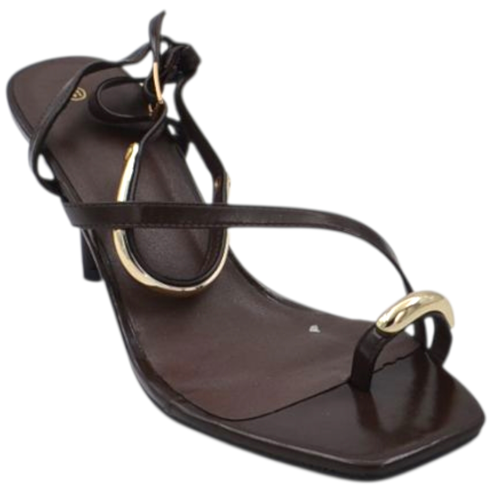 Sandalo donna in pelle marrone con infradito dettaglio metallico oro e chiusura alla caviglia tacco 10 cm sottile
