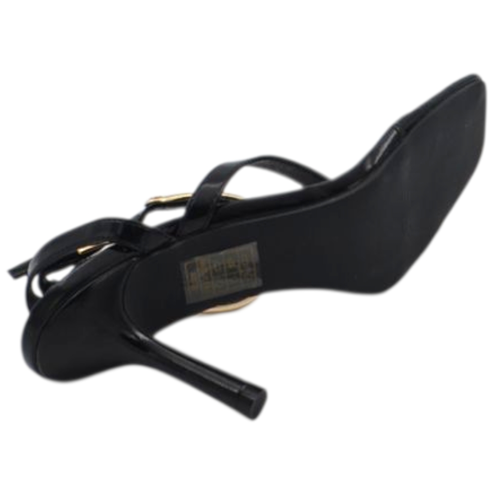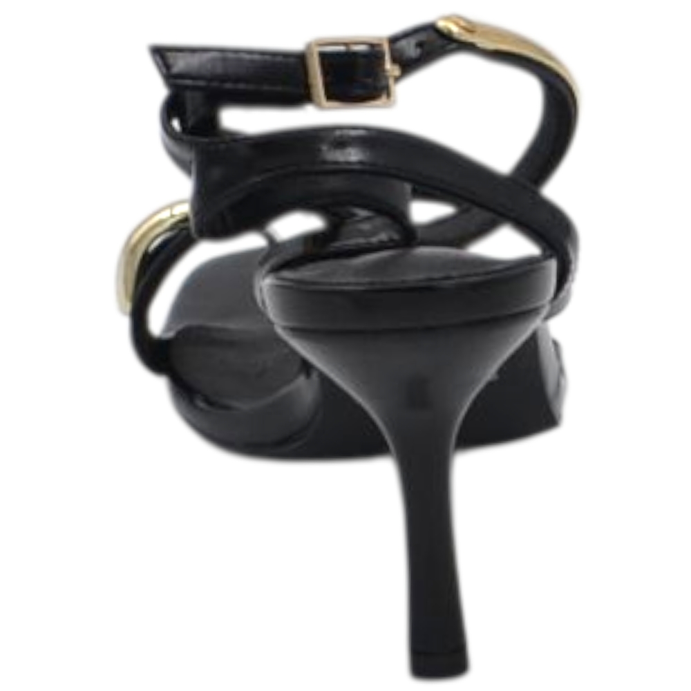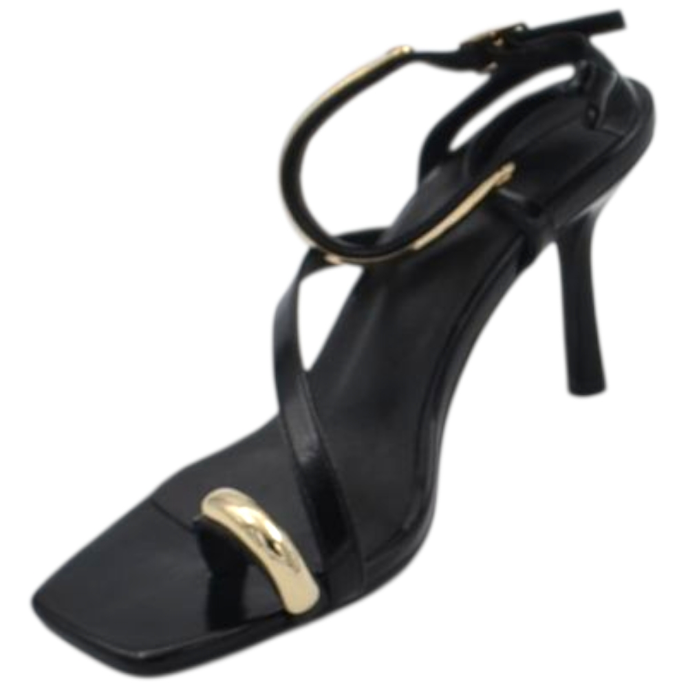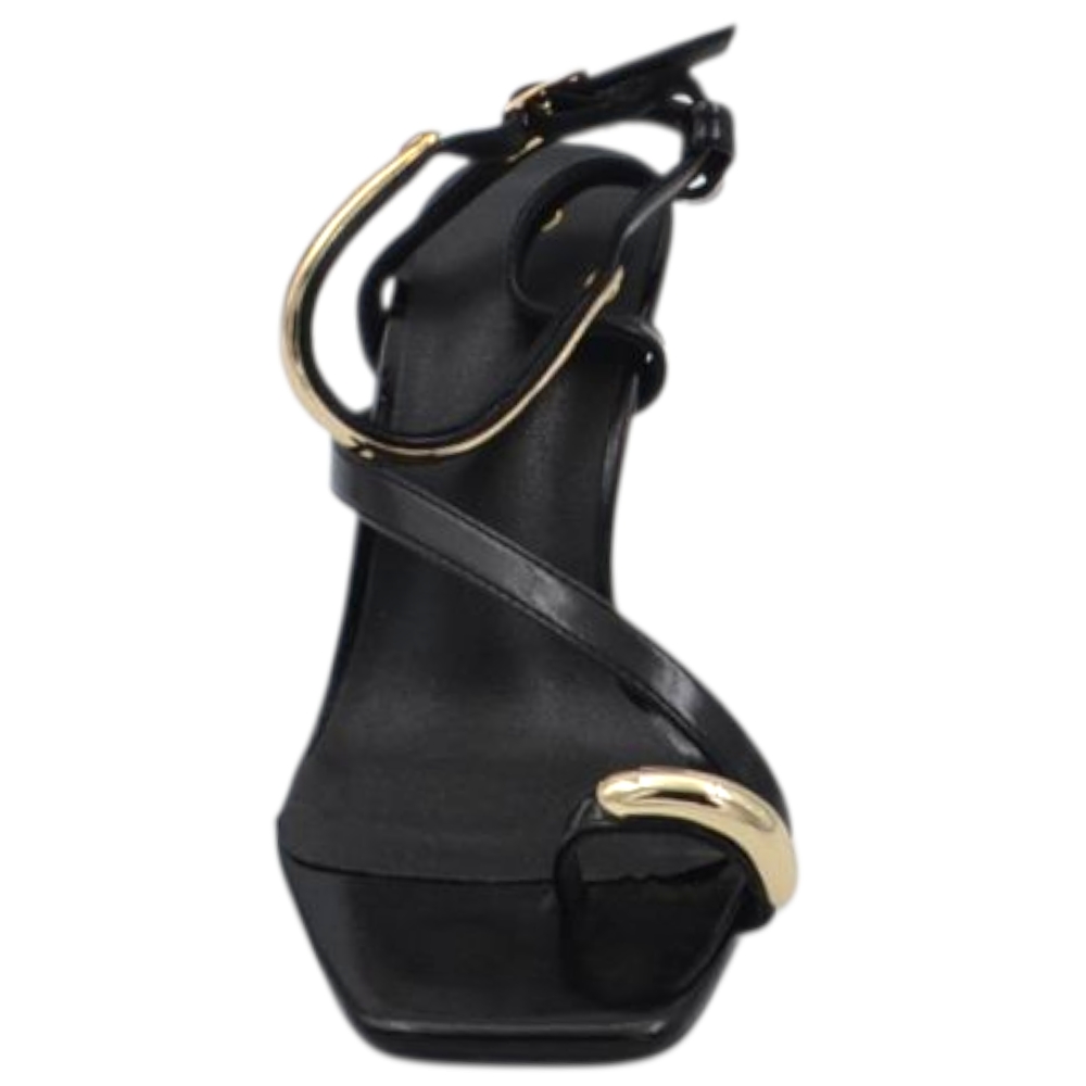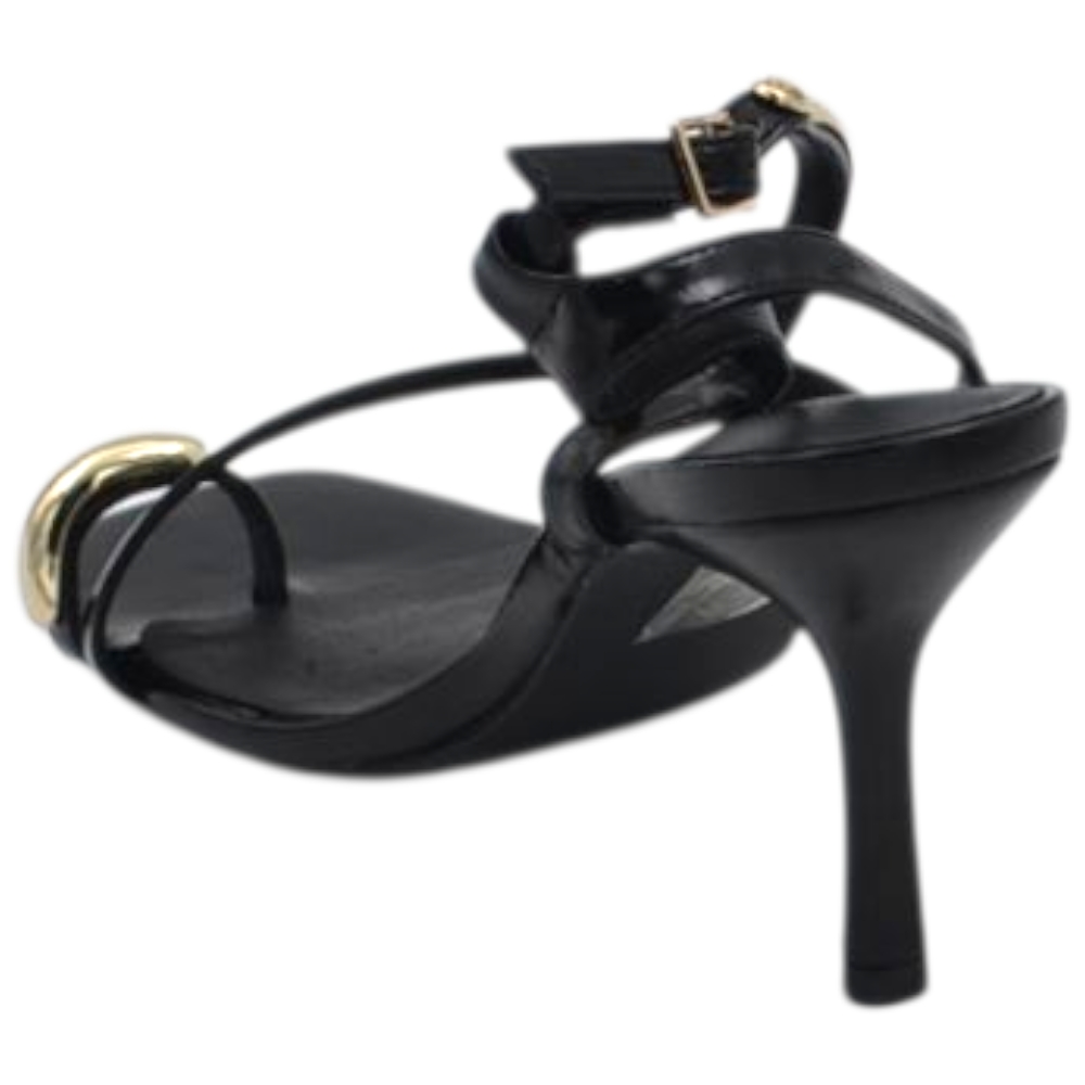 Sandalo donna in pelle nera con infradito dettaglio metallico oro e chiusura alla caviglia tacco 10 cm sottile