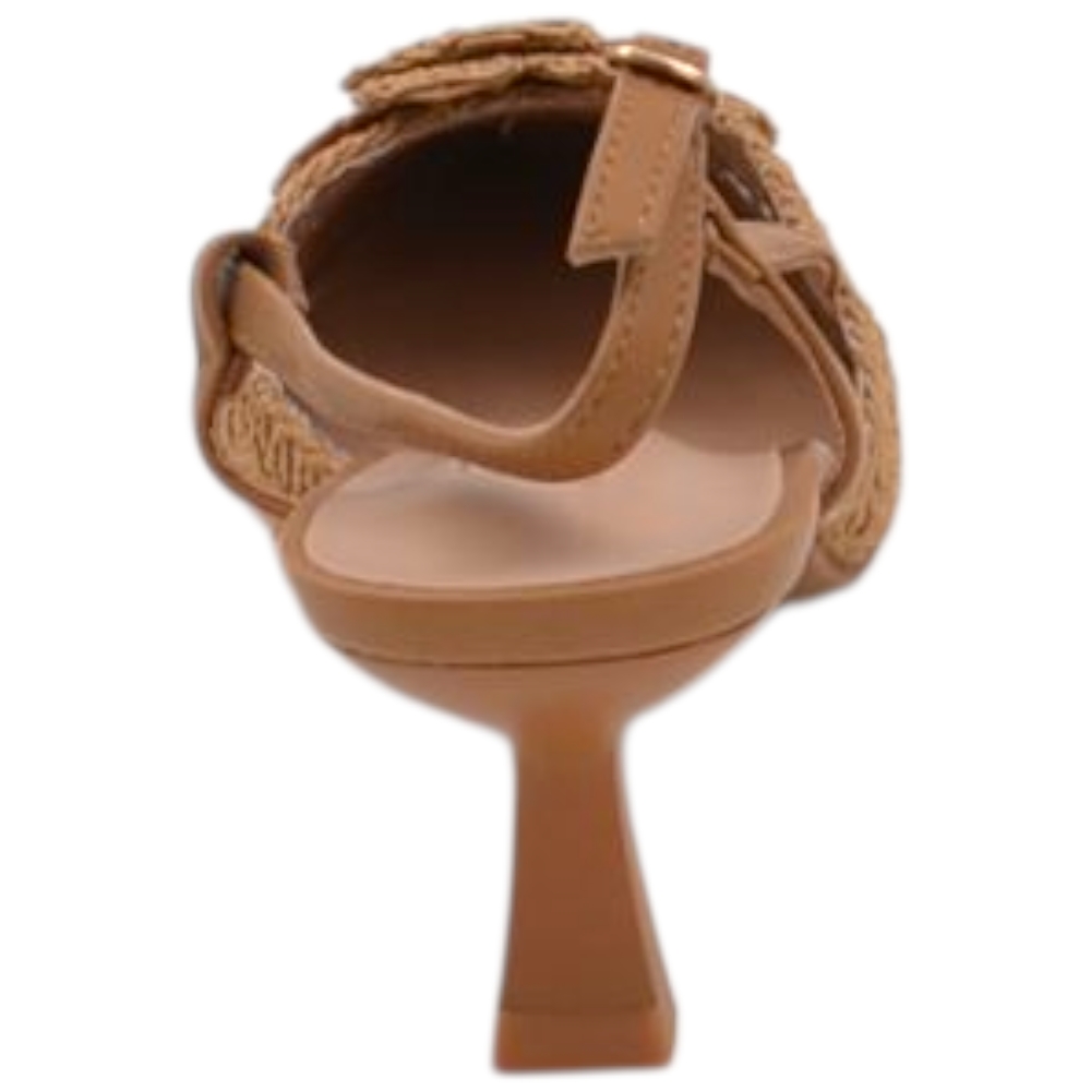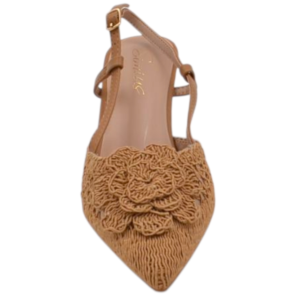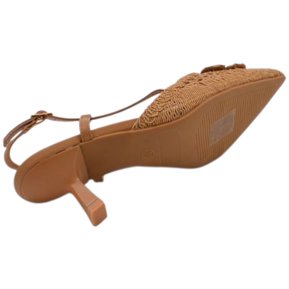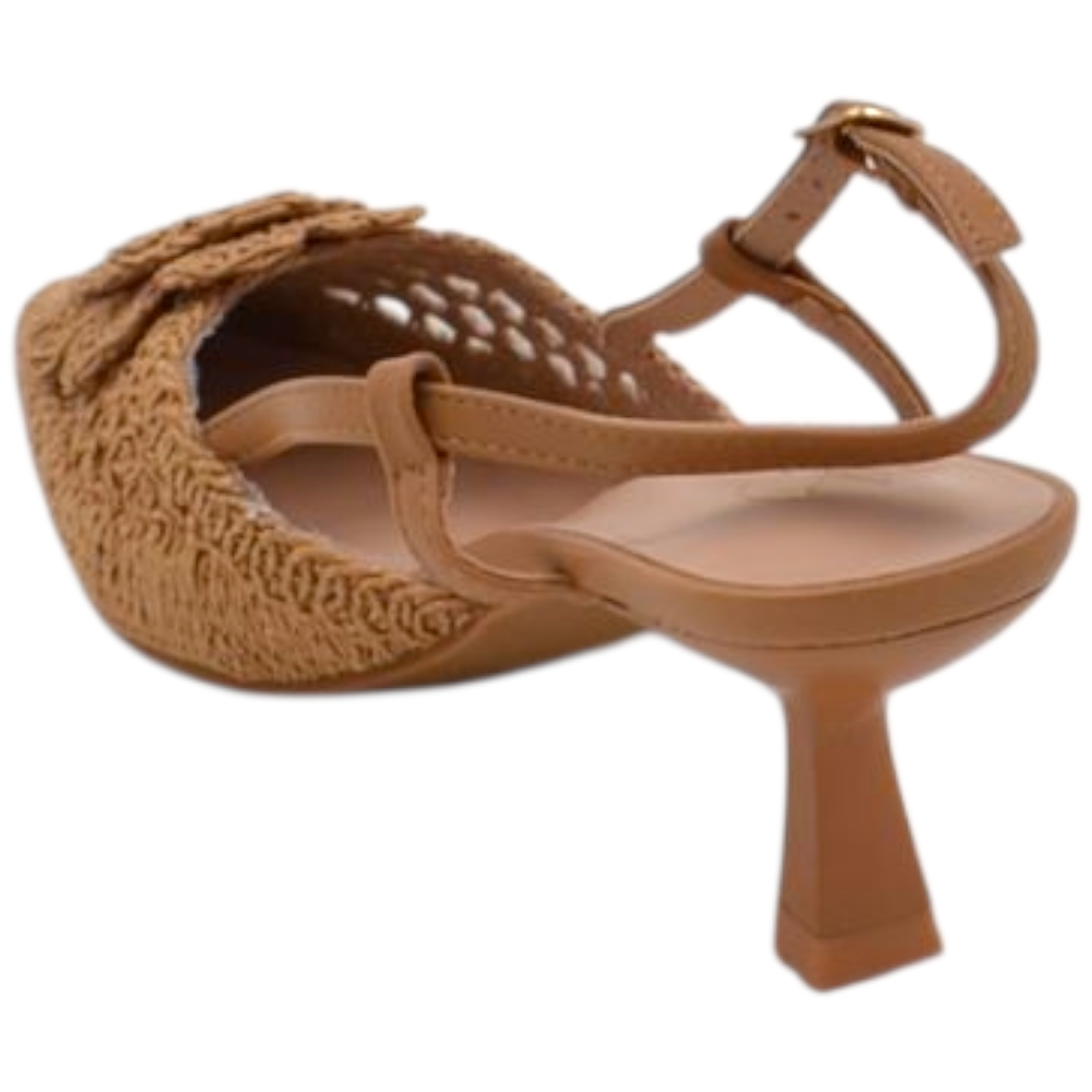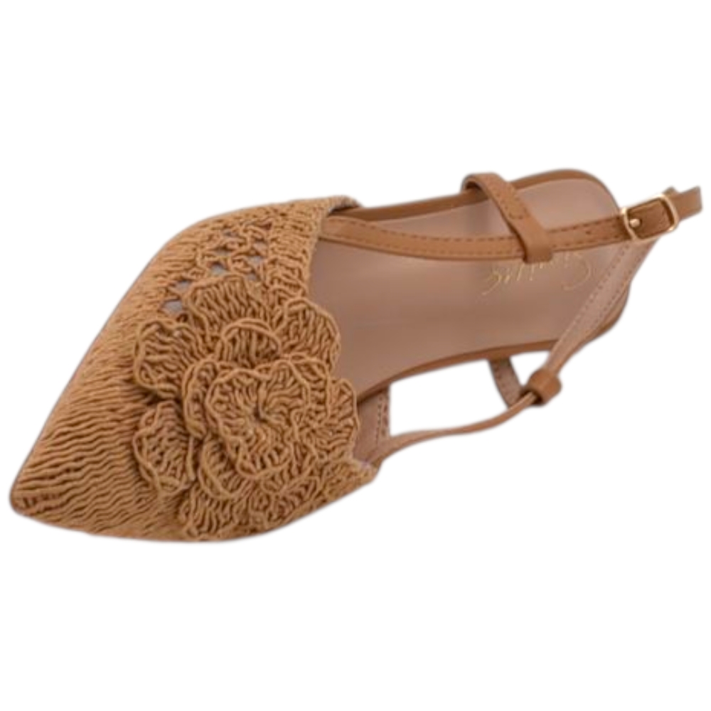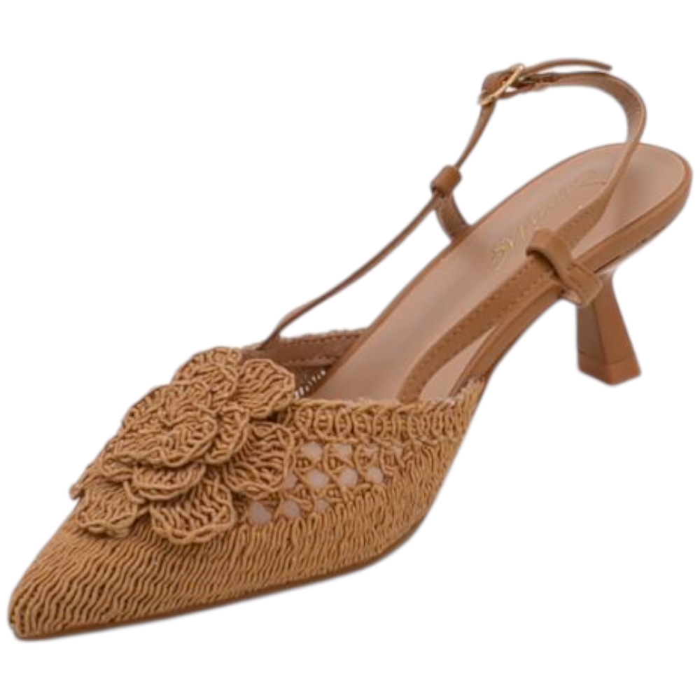 Decollete donna a punta slingback cuoio in tessuto intrecciato e fiore tacco sottile 5cm e cinturino regolabile