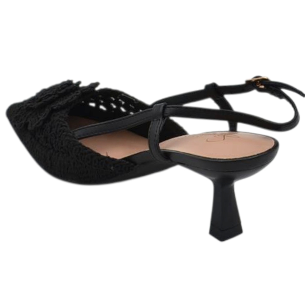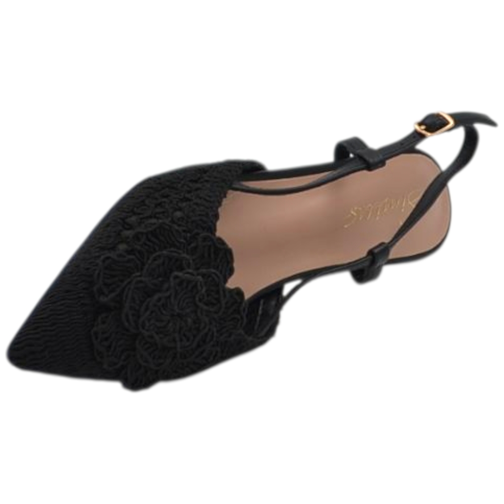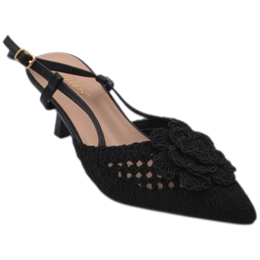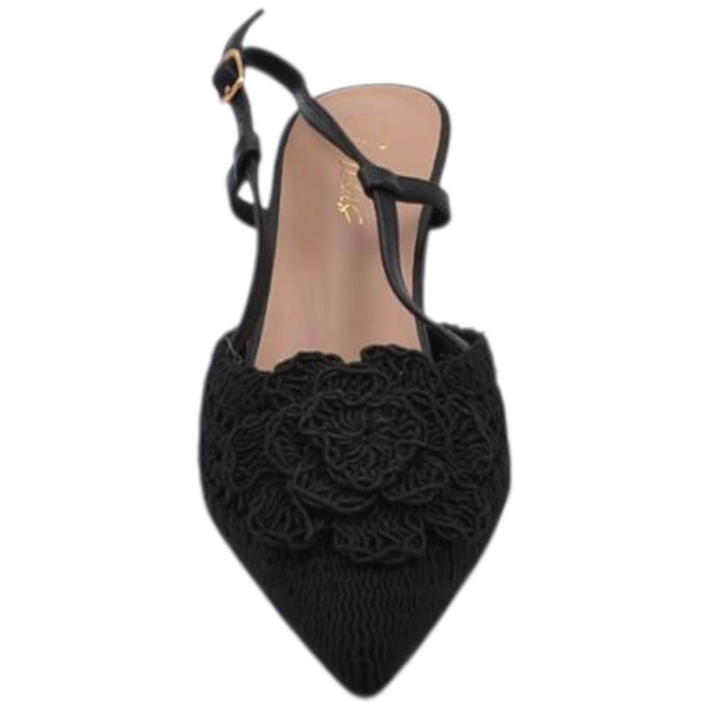Decollete donna a punta slingback nero in tessuto intrecciato e fiore tacco sottile 5cm e cinturino regolabile caviglia