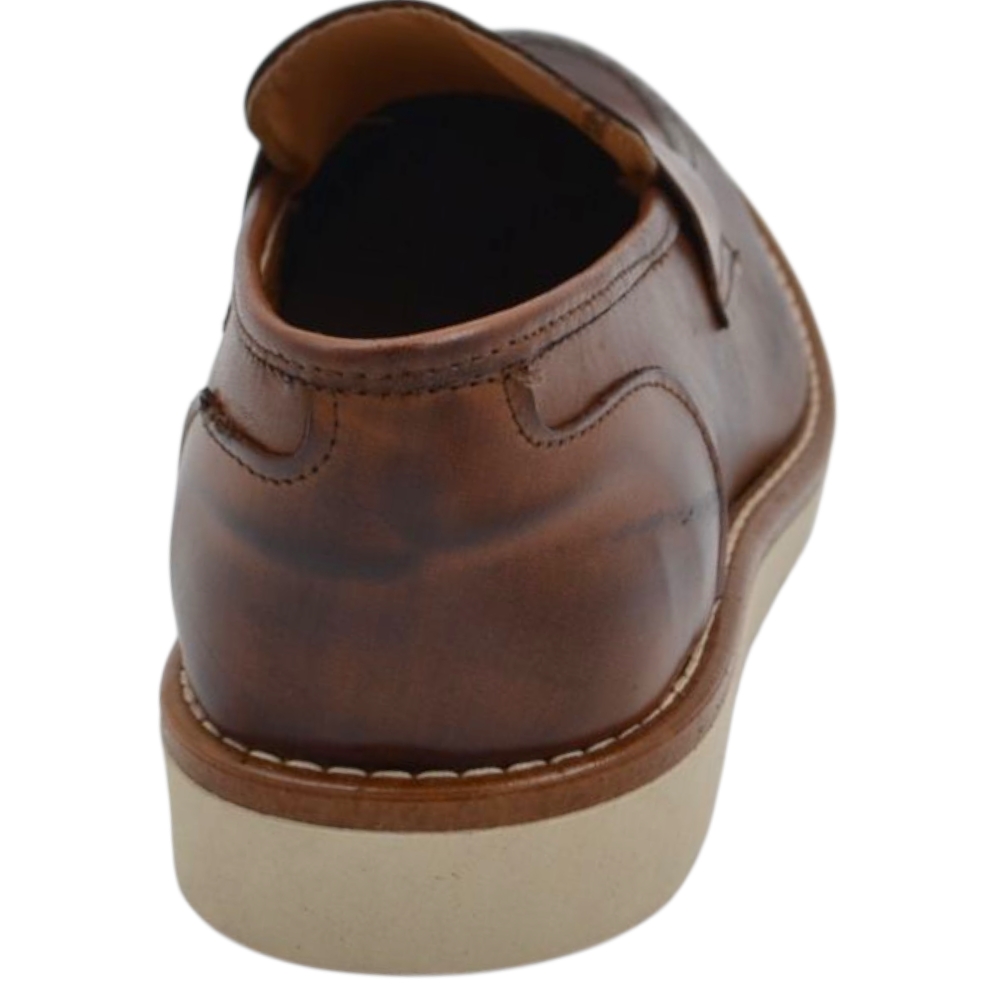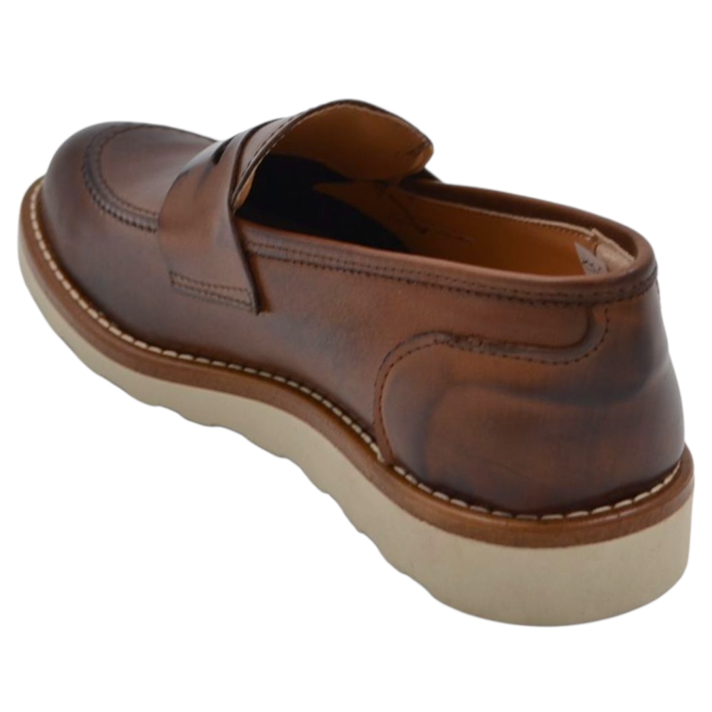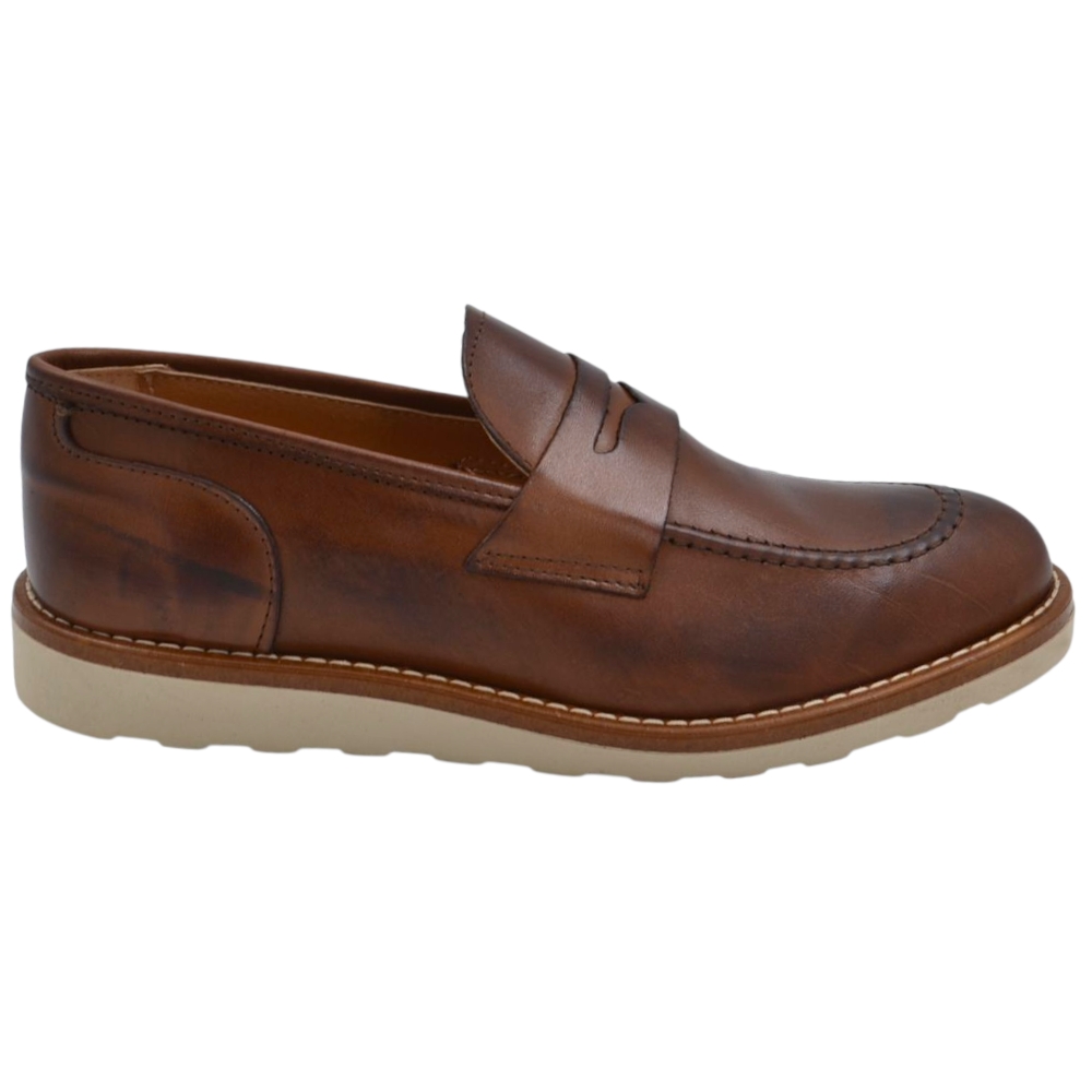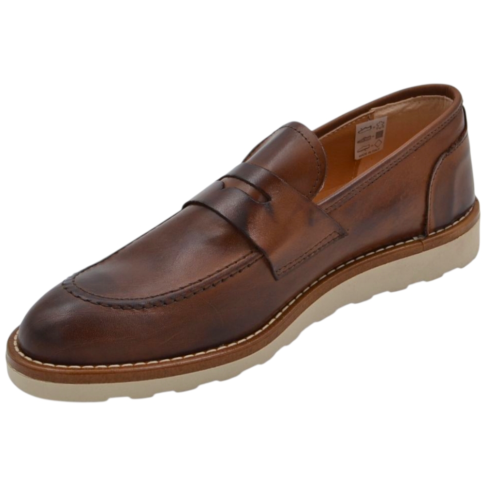 Scarpa mocassino uomo in vera pelle cuoio con bendina suola in gomma zigrinata 3 cm cuciture a vista