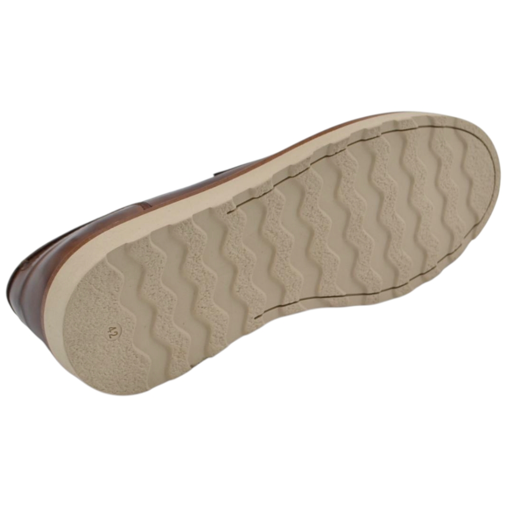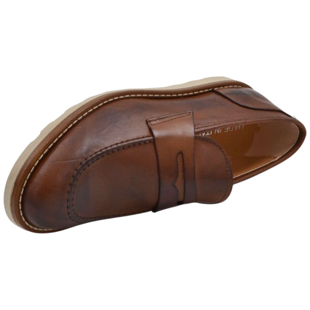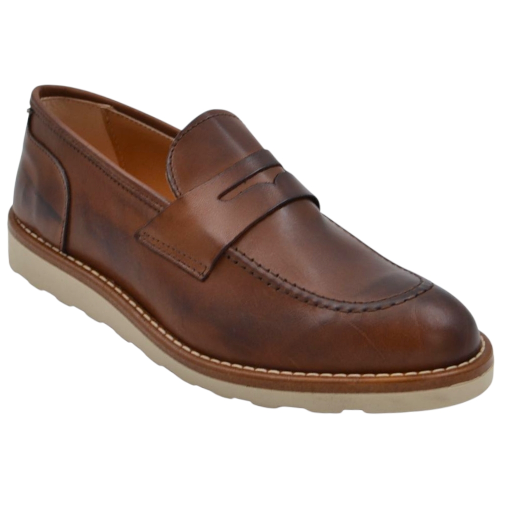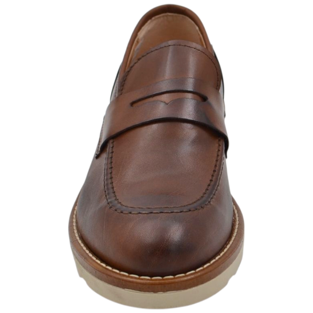 Scarpa mocassino uomo in vera pelle cuoio con bendina suola in gomma zigrinata 3 cm cuciture a vista