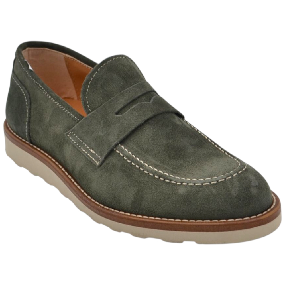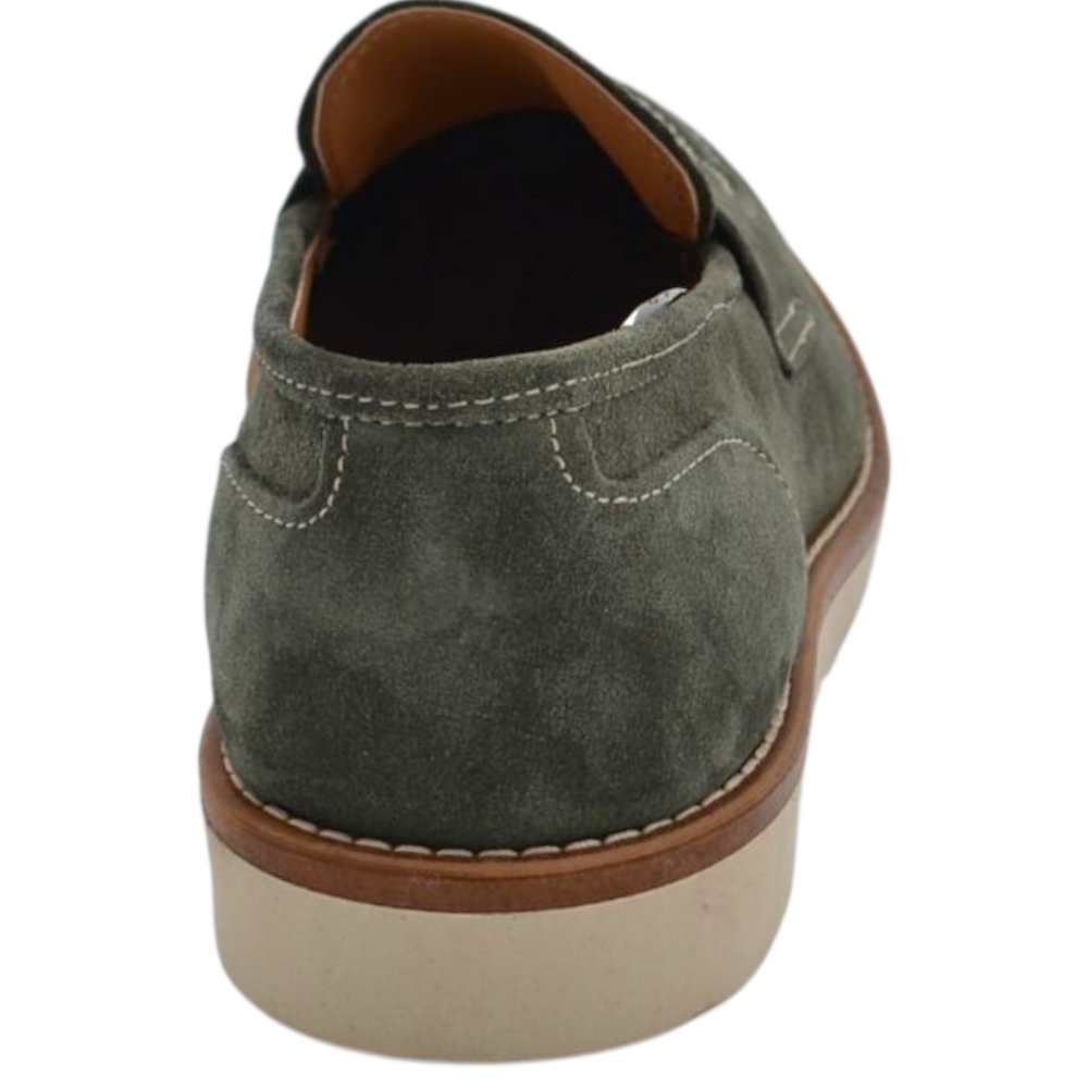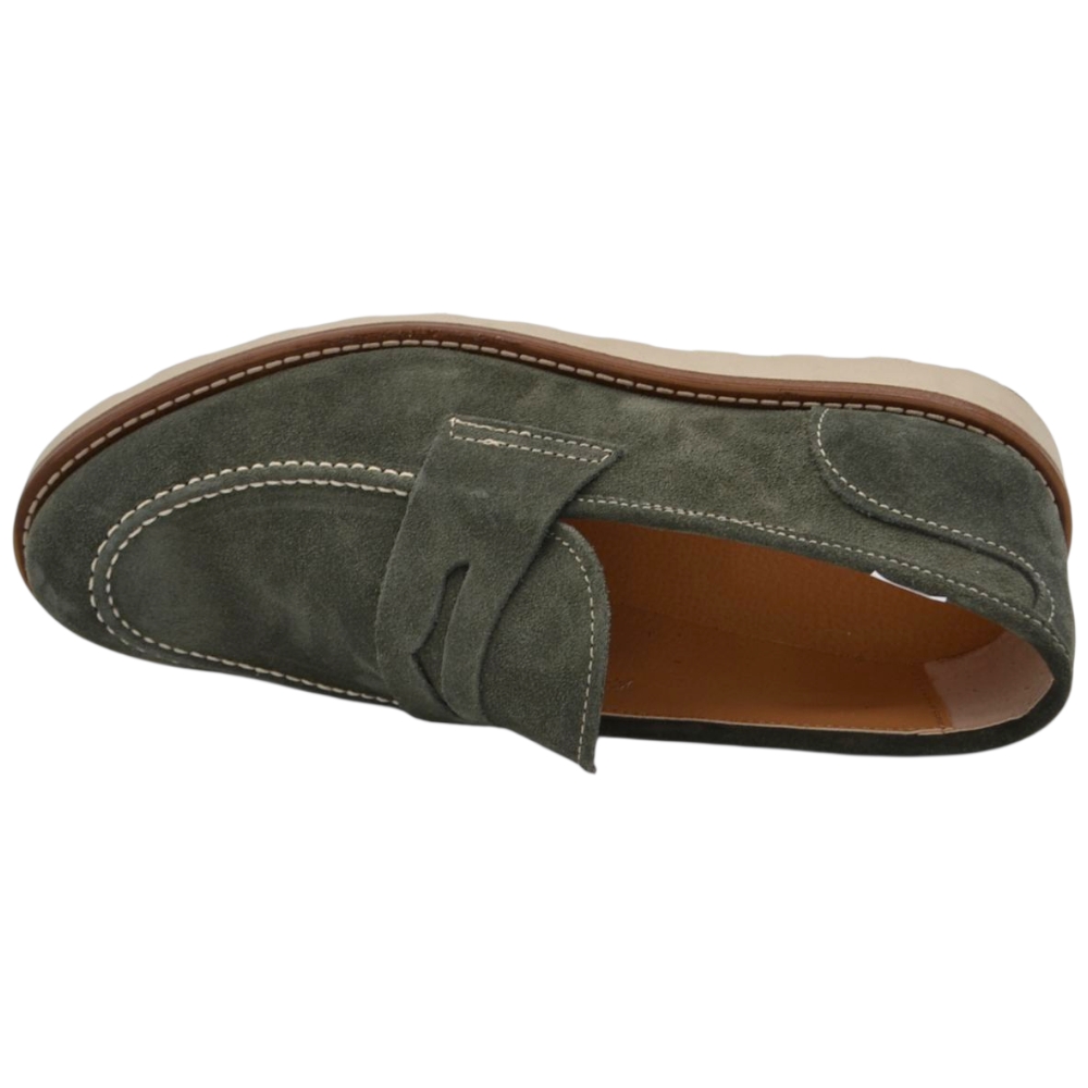 Scarpa mocassino uomo in vero camoscio verde con bendina suola in gomma zigrinata 3 cm cuciture a vista