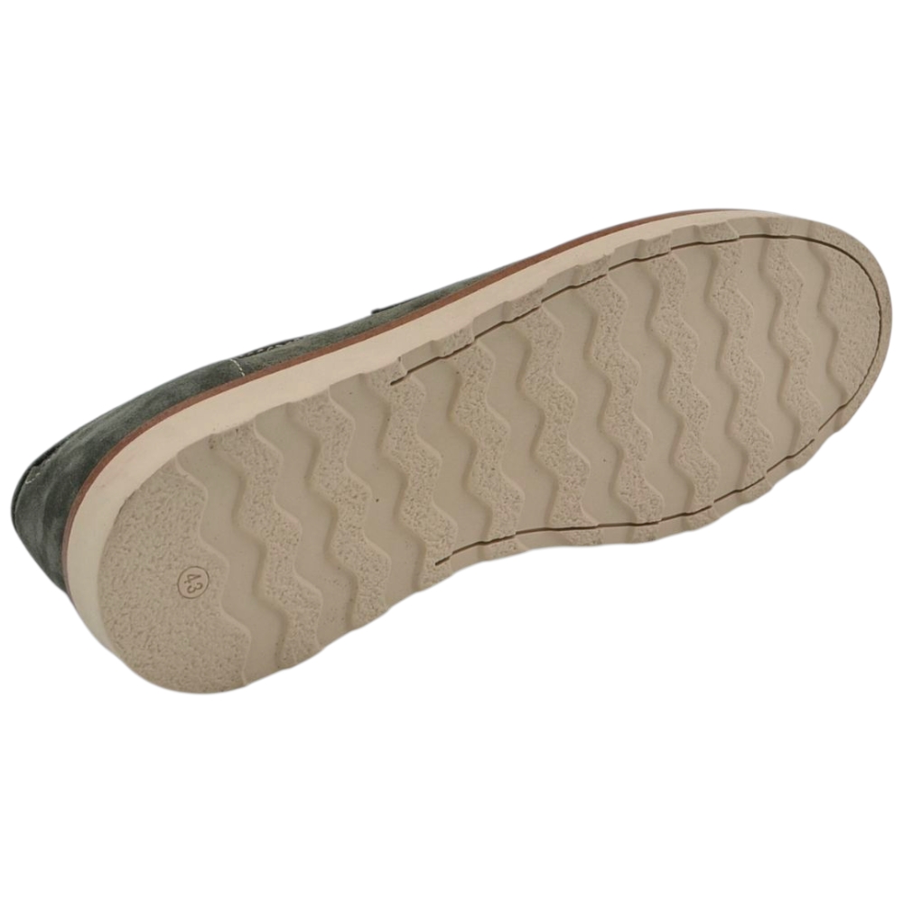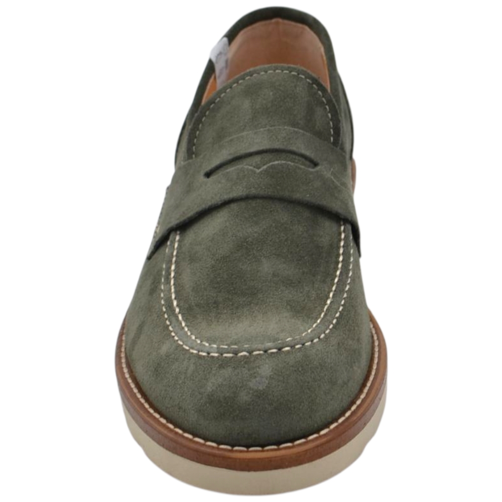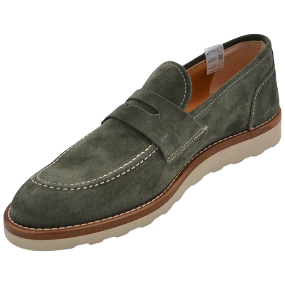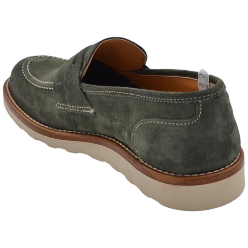 Scarpa mocassino uomo in vero camoscio verde con bendina suola in gomma zigrinata 3 cm cuciture a vista