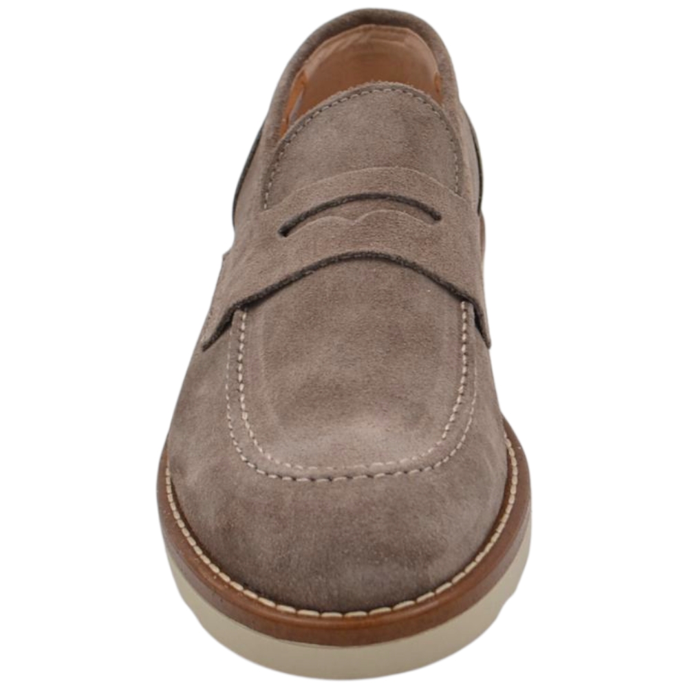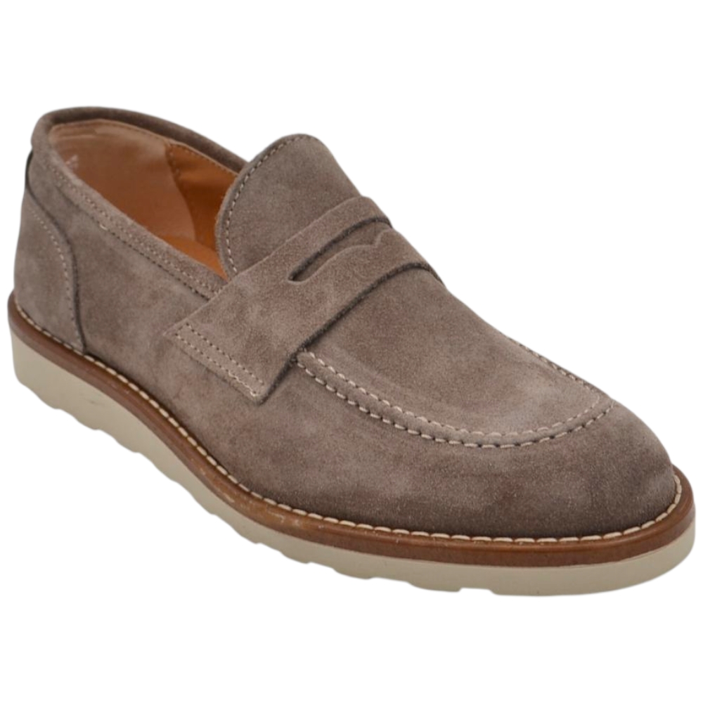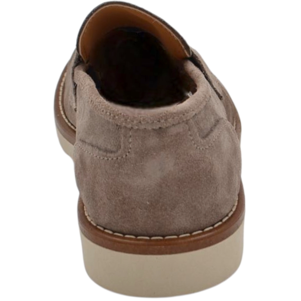 Scarpa mocassino uomo in vero camoscio beige taupe con bendina suola in gomma zigrinata 3 cm cuciture a vista