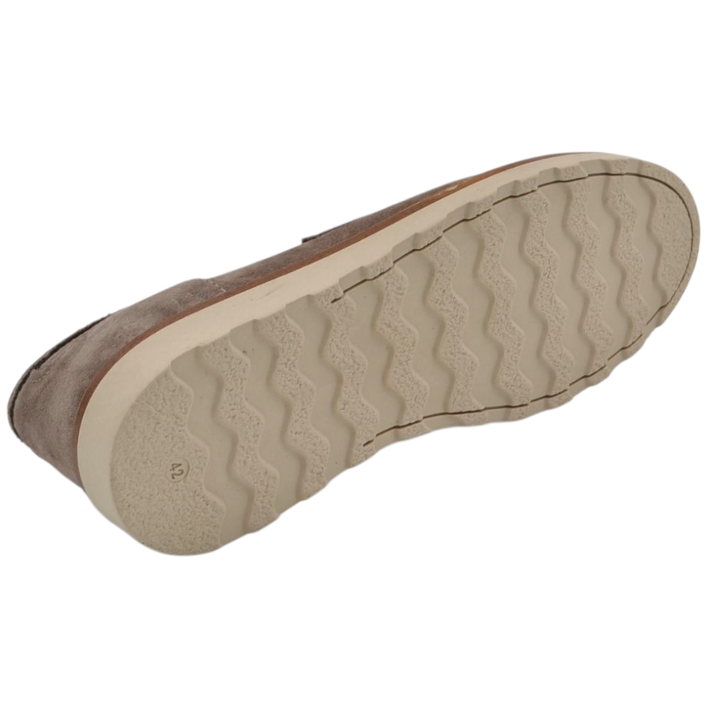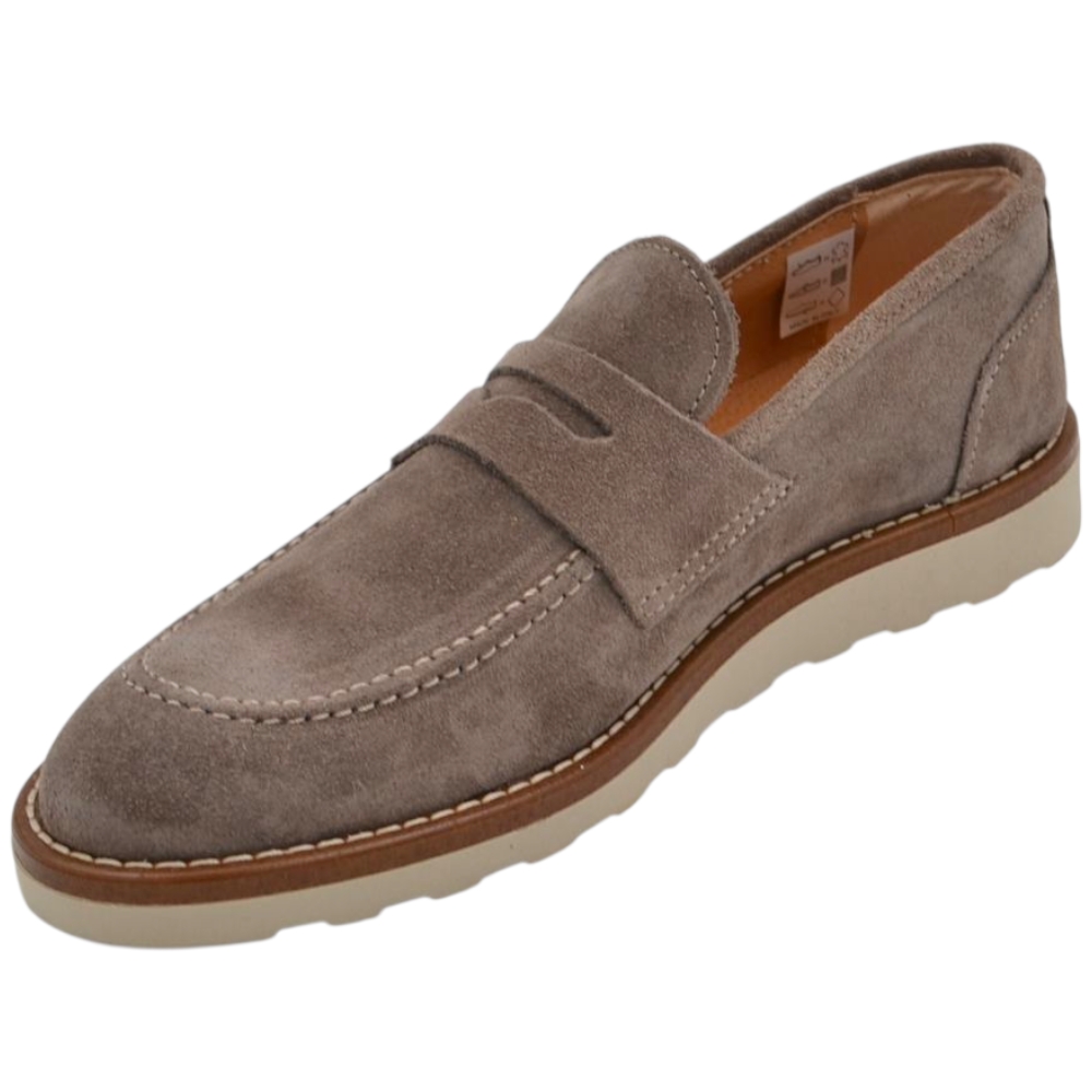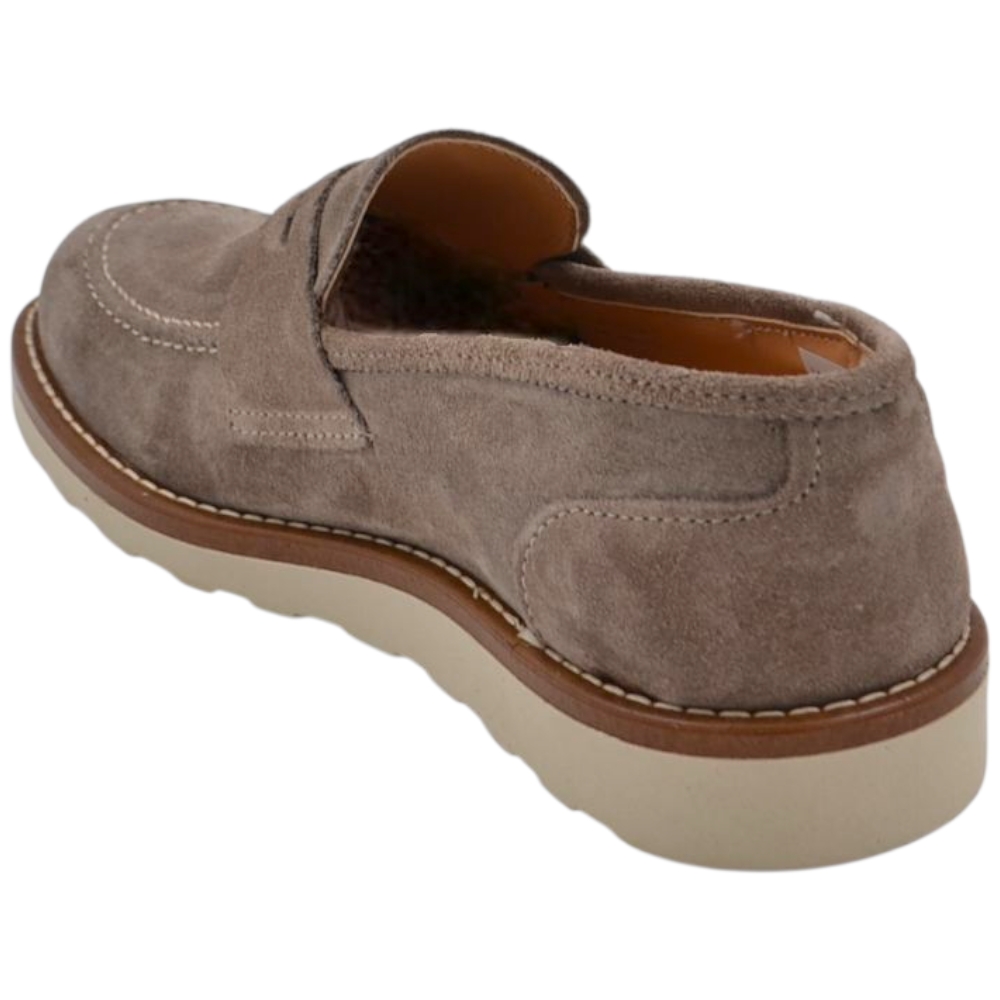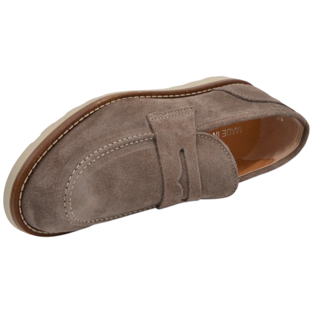 Scarpa mocassino uomo in vero camoscio beige taupe con bendina suola in gomma zigrinata 3 cm cuciture a vista