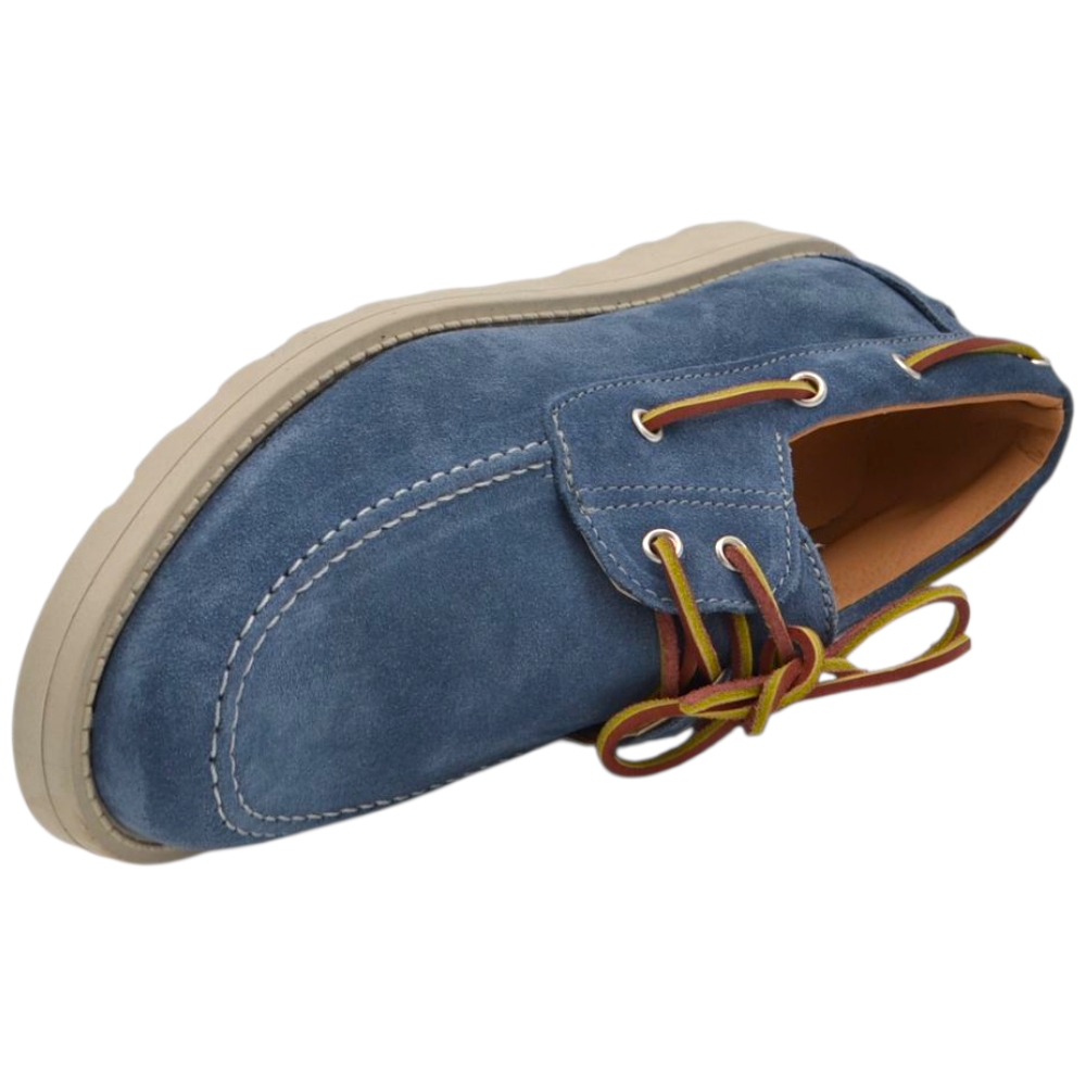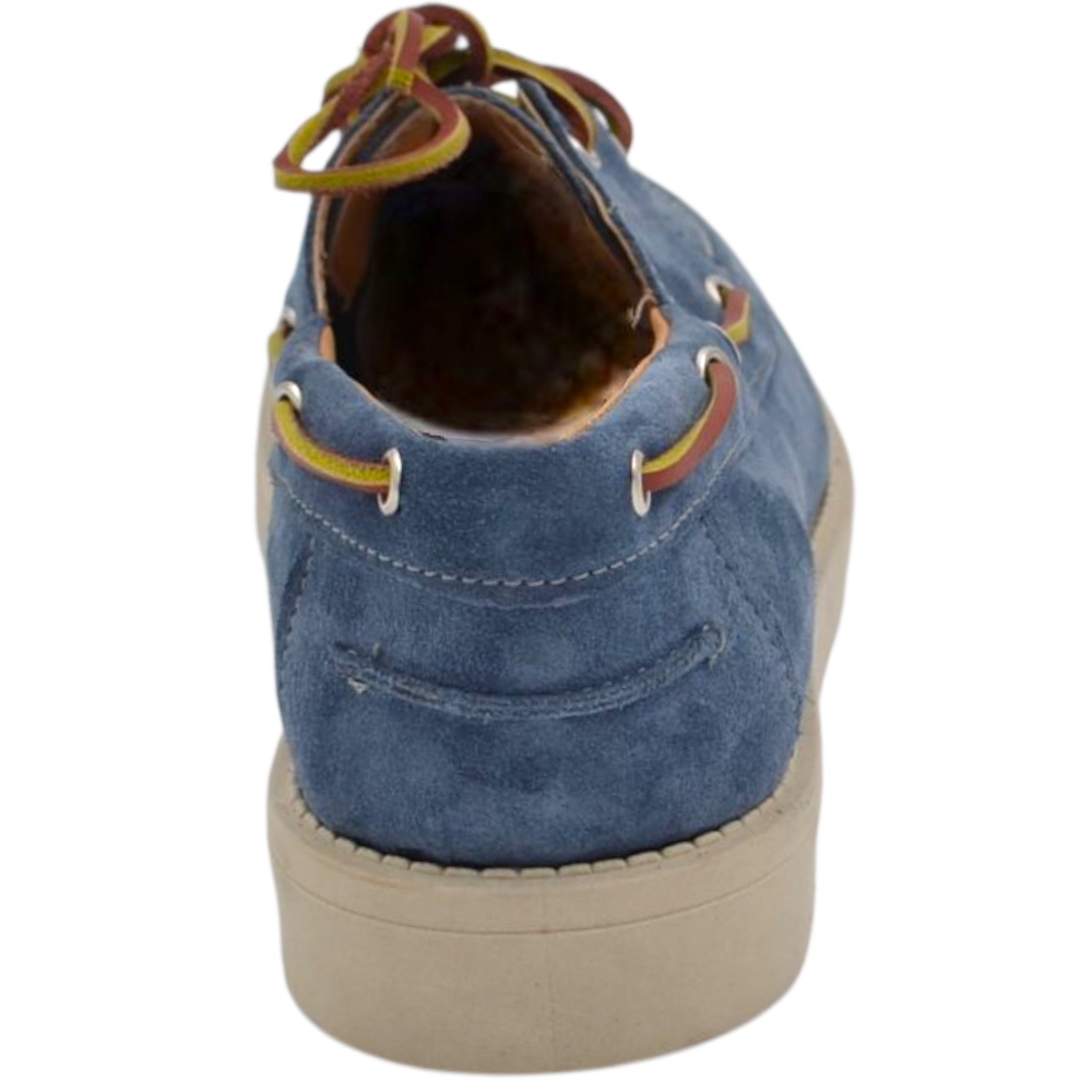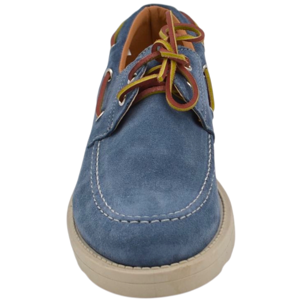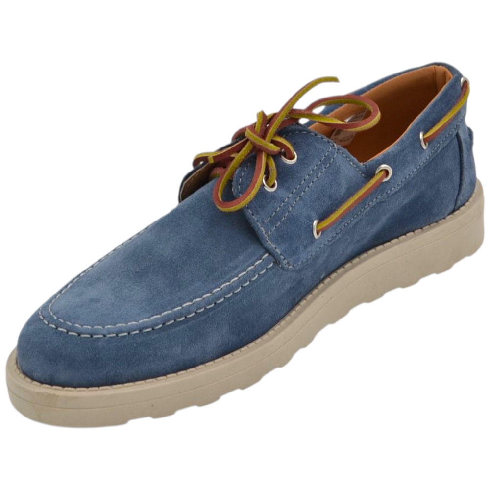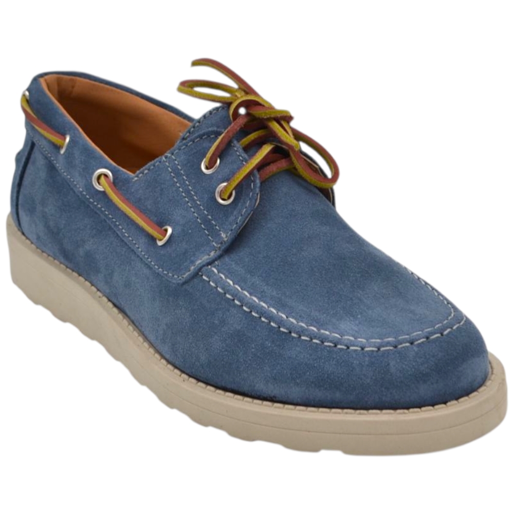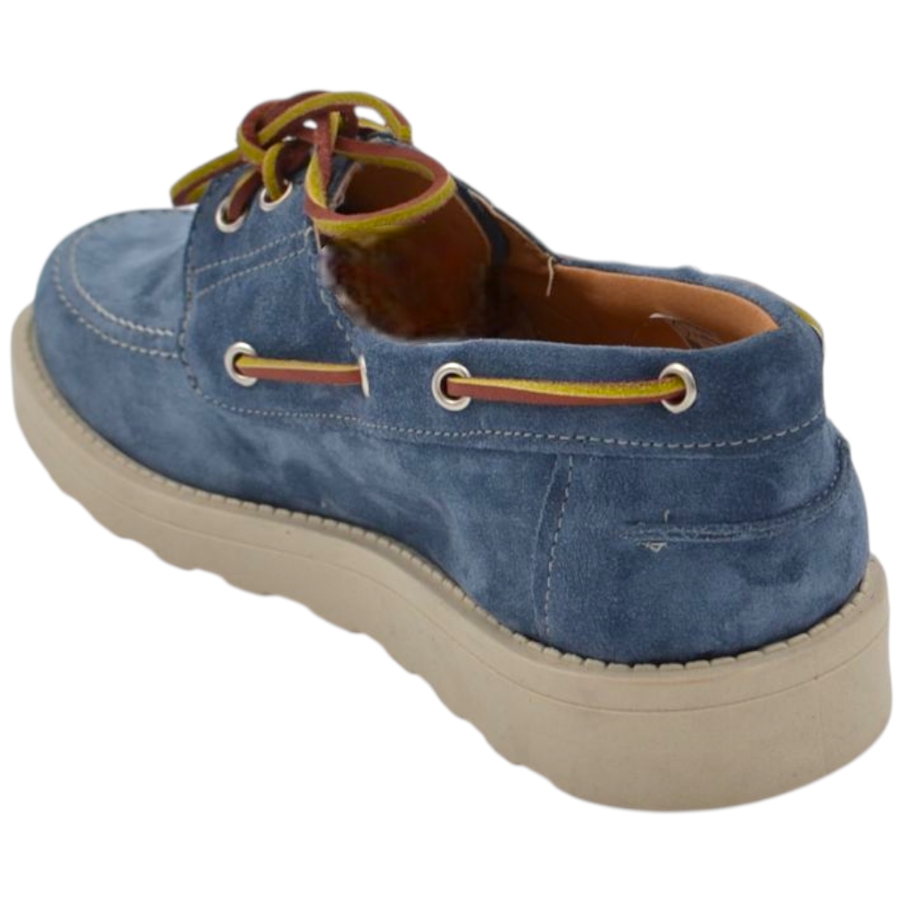 Scarpa mocassino uomo in vero camoscio celeste con lacci in pelle occhielli argento suola in gomma zigrinata 3 cm