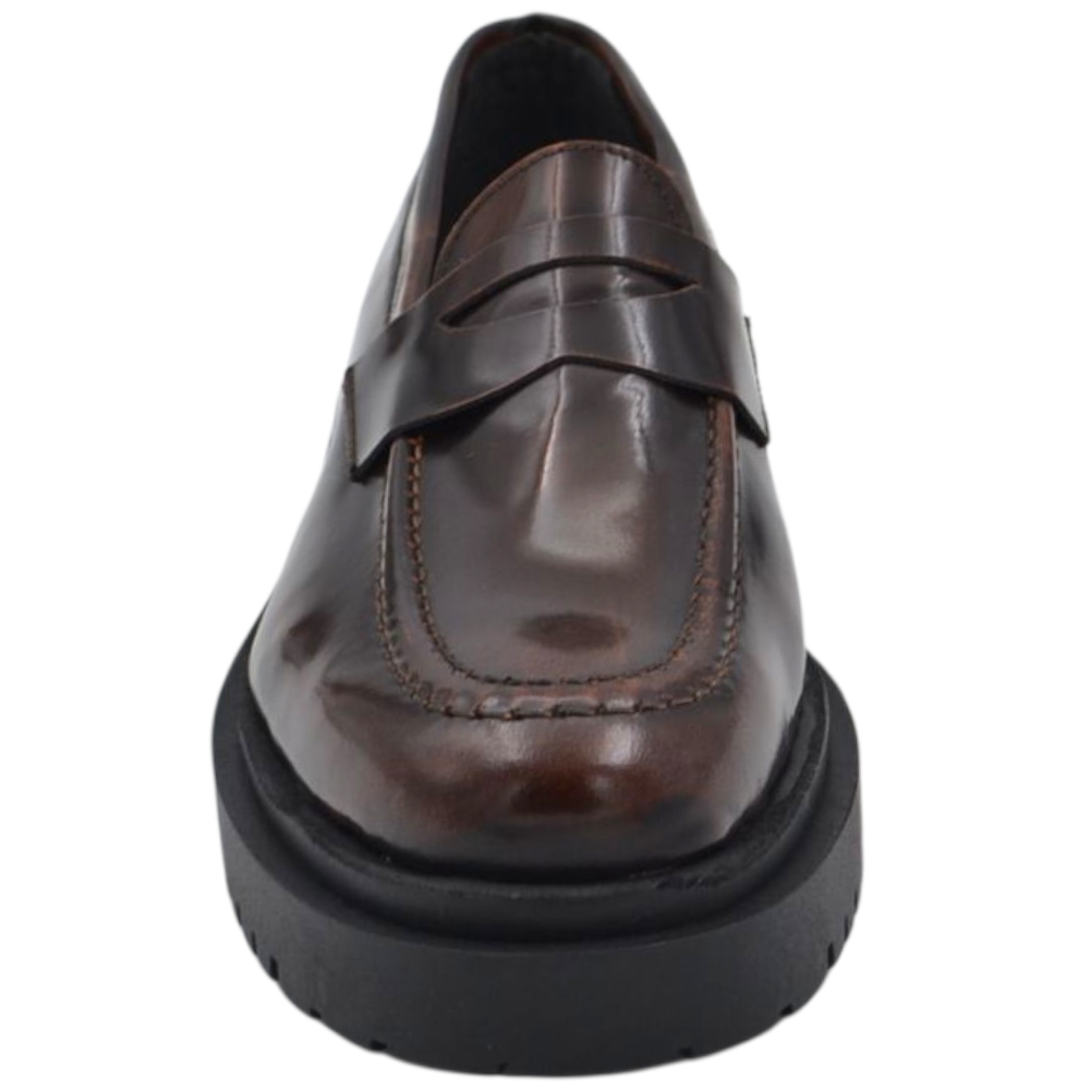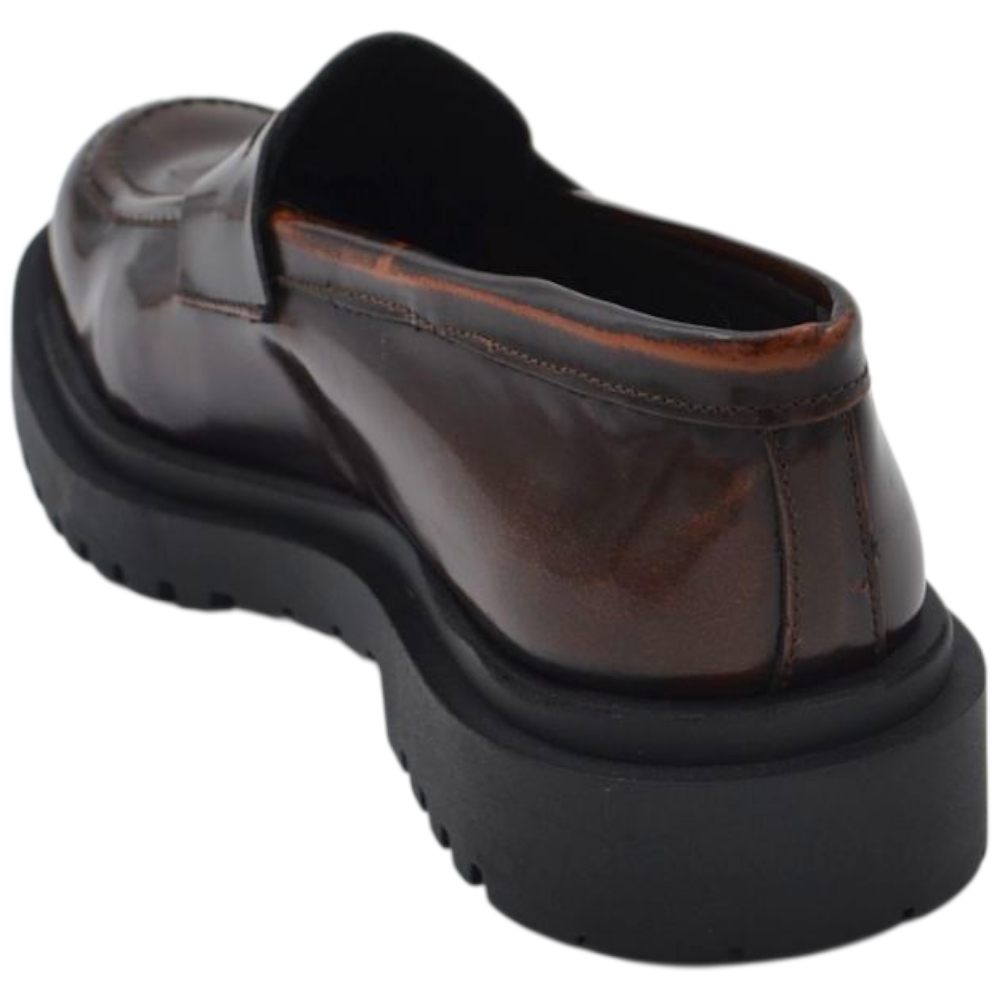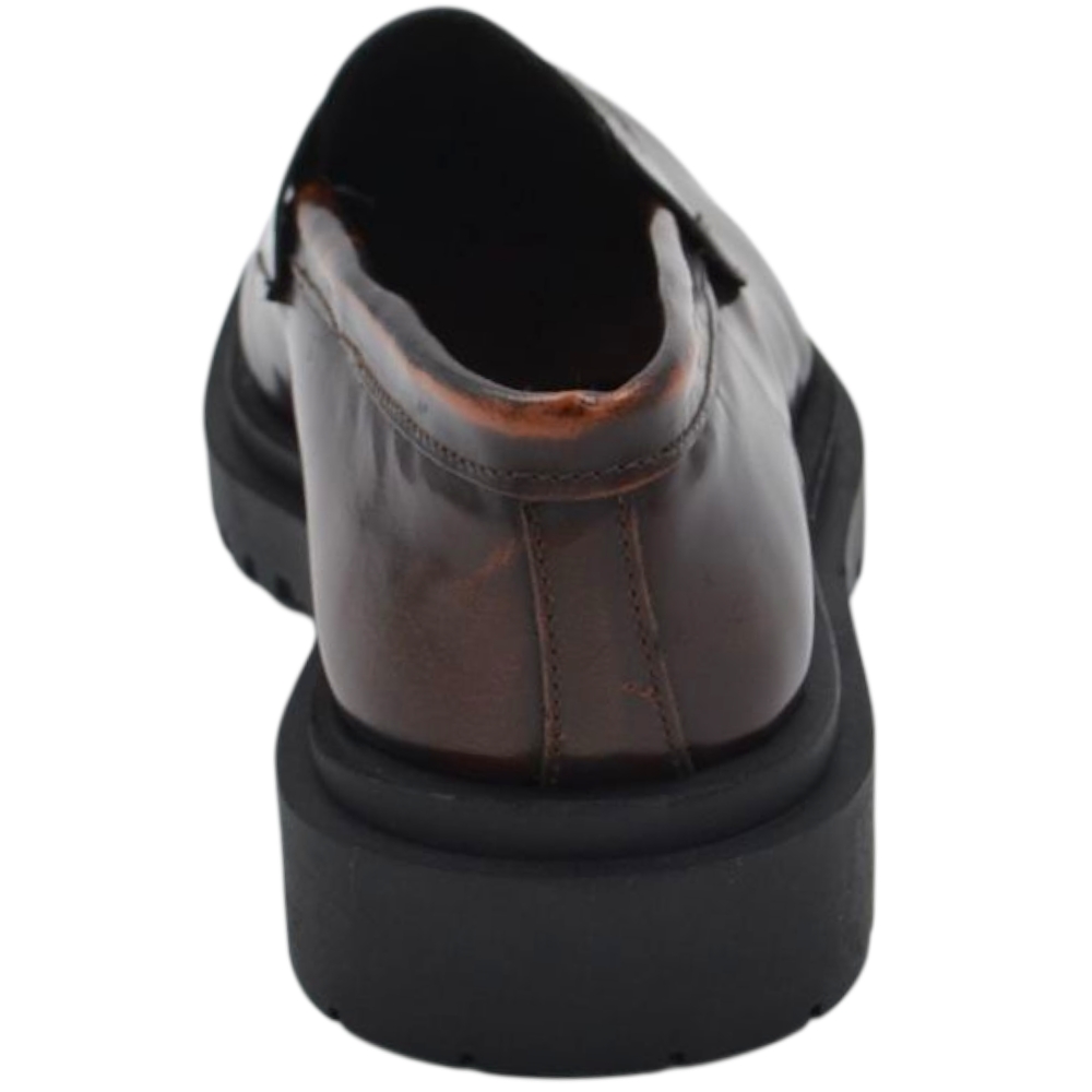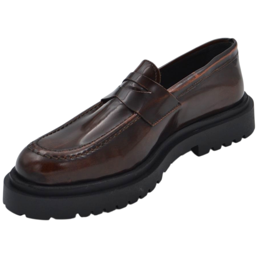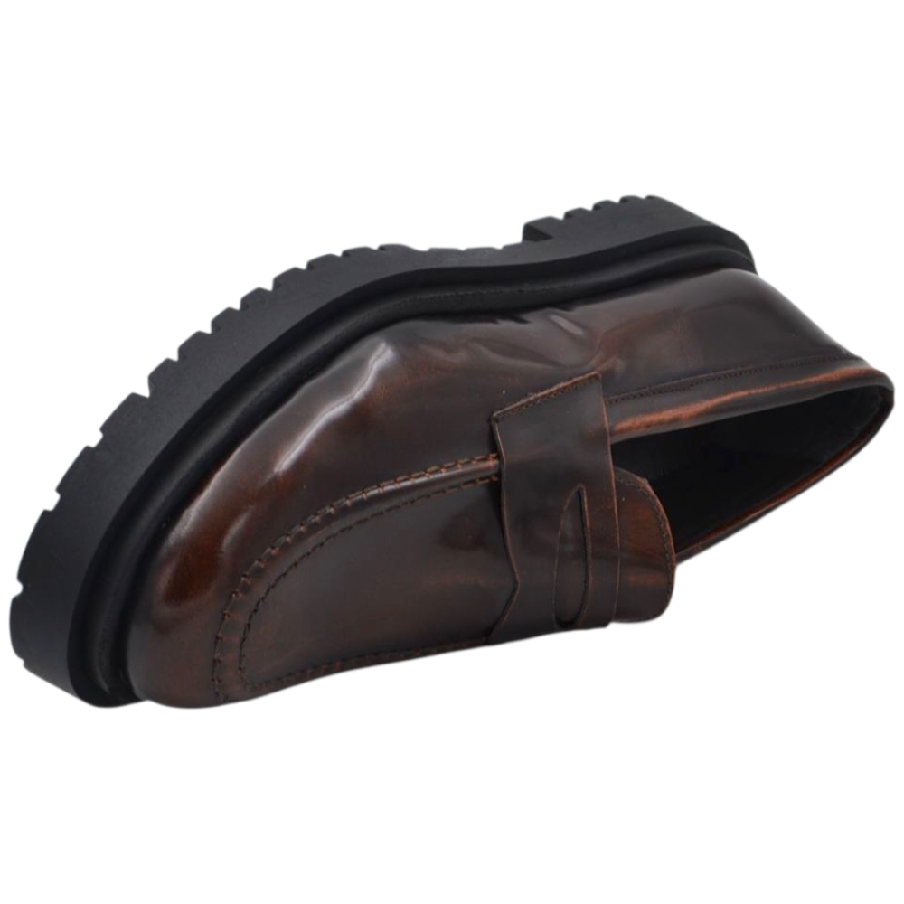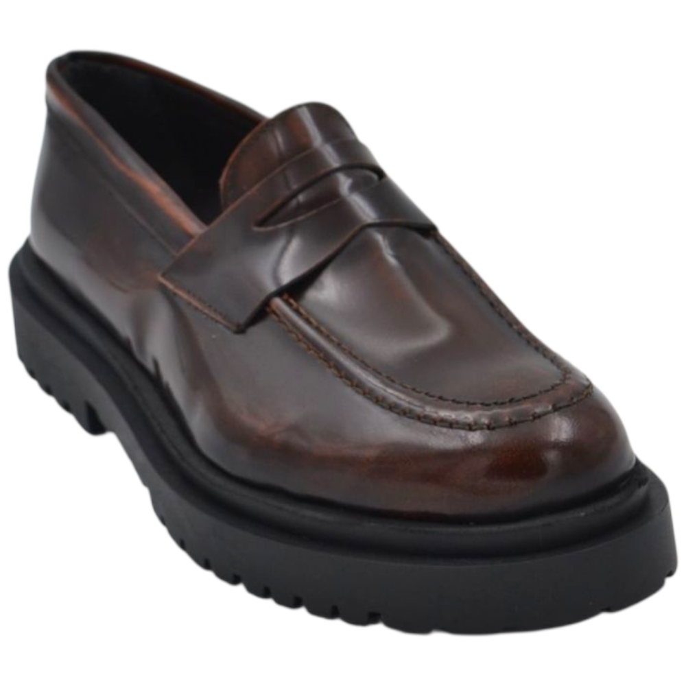 Scarpe uomo mocassino con bendina marrone vera pelle semilucida effetto vintage fondo alto gomma zigrinato