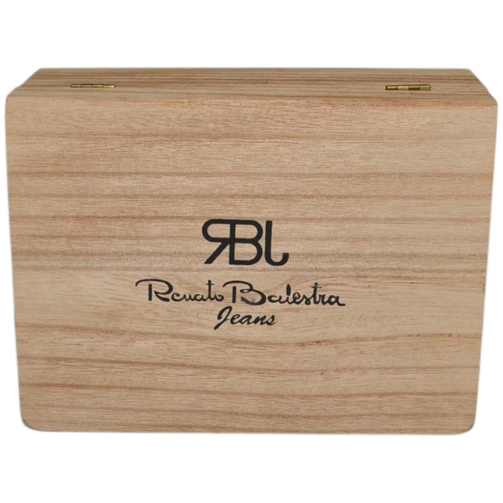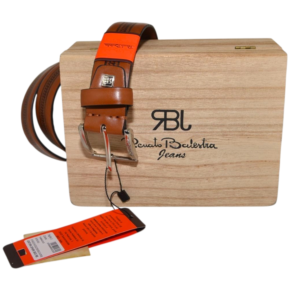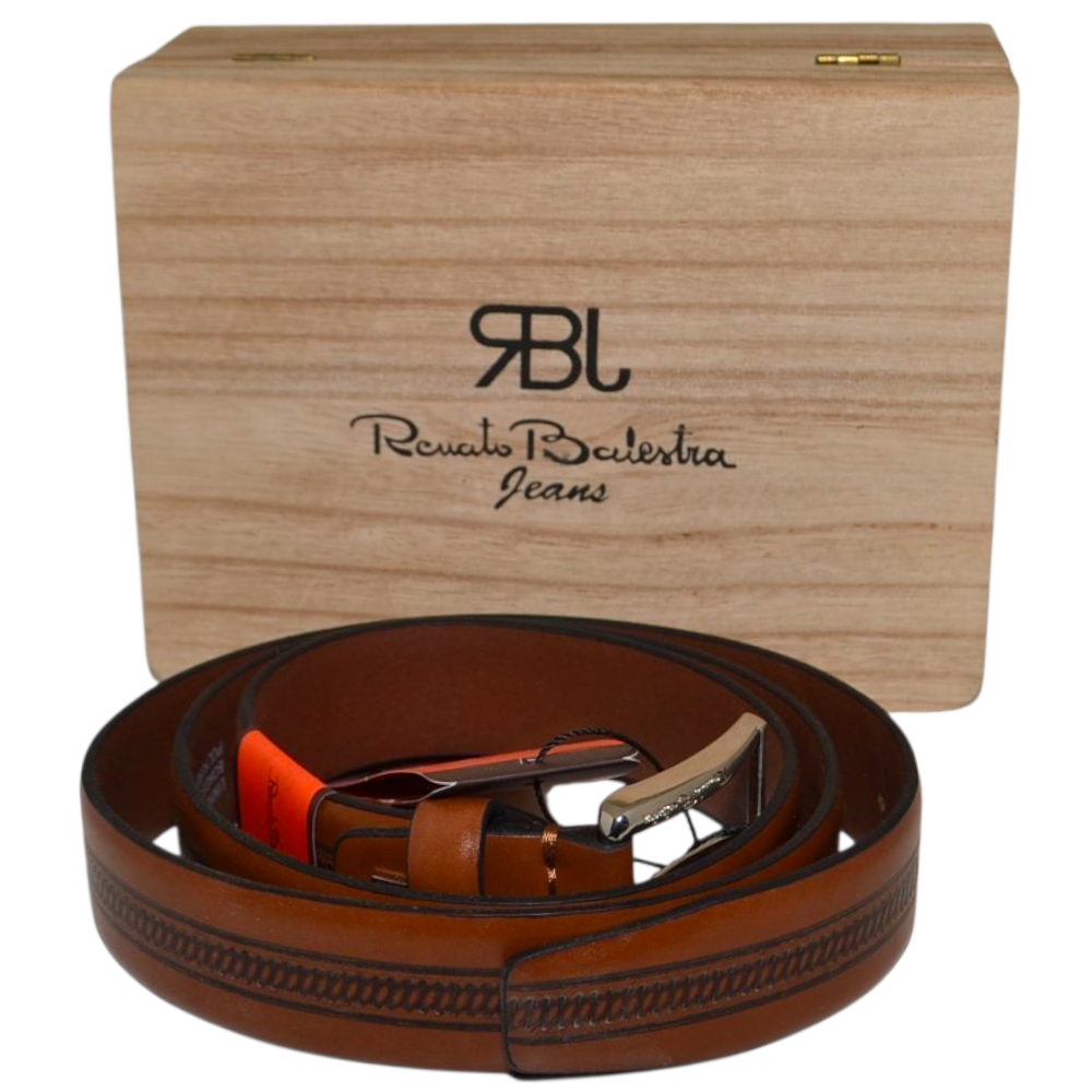 Cintura vera pelle cuoio Renato Balestra con dettaglio ricamo fibbia in metallo quadrata regolabile scatola in legno