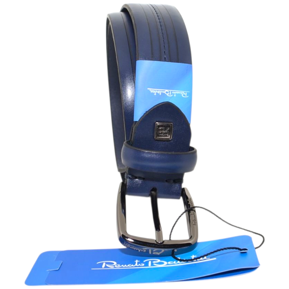 Cintura vera pelle blu Renato Balestra liscia con fibbia in metallo quadrata regolabile scatola in legno